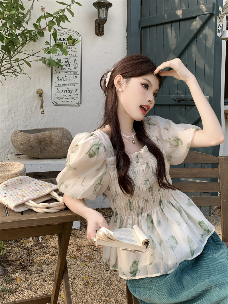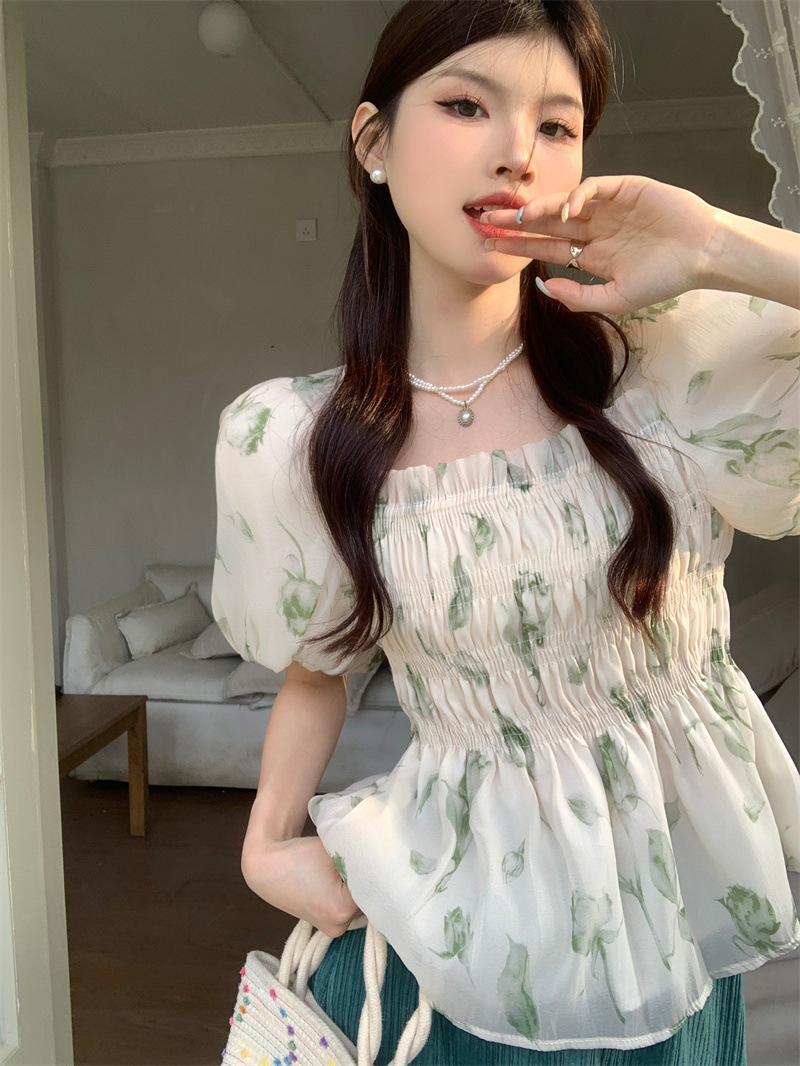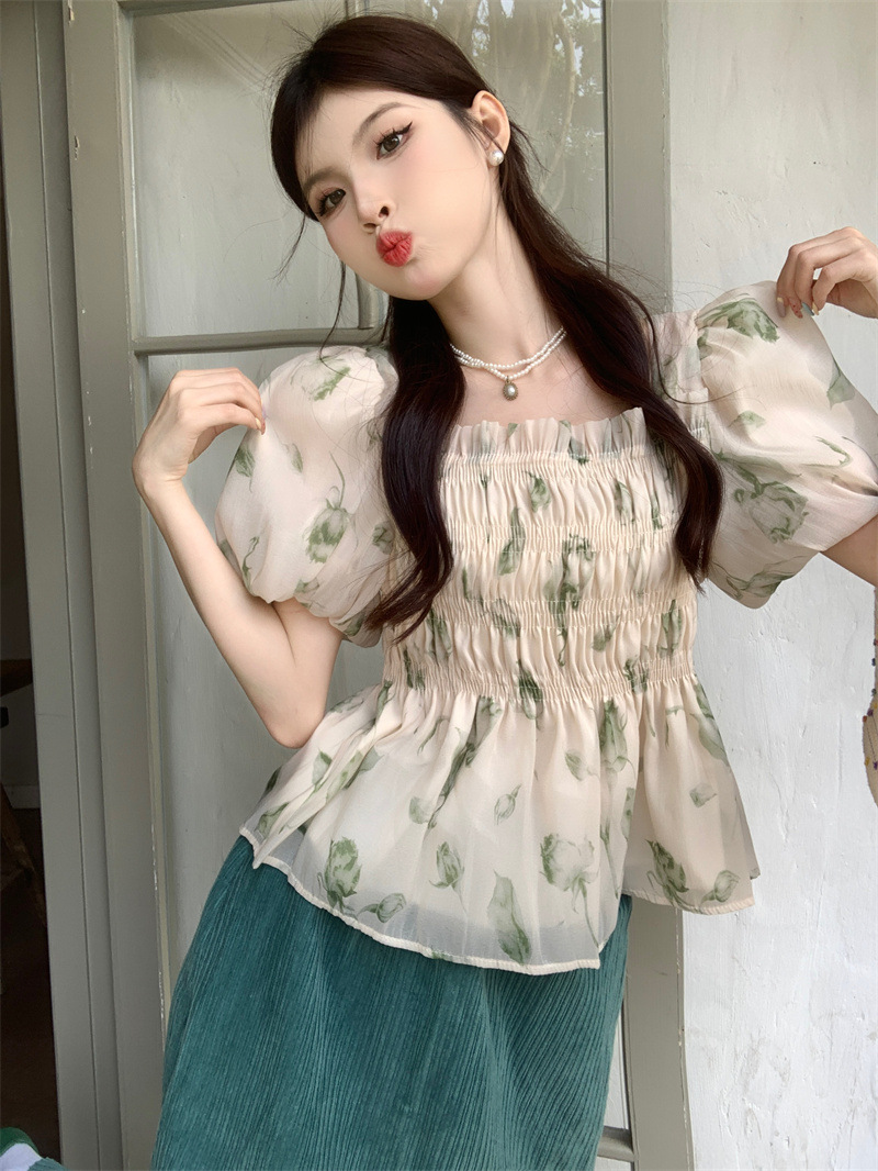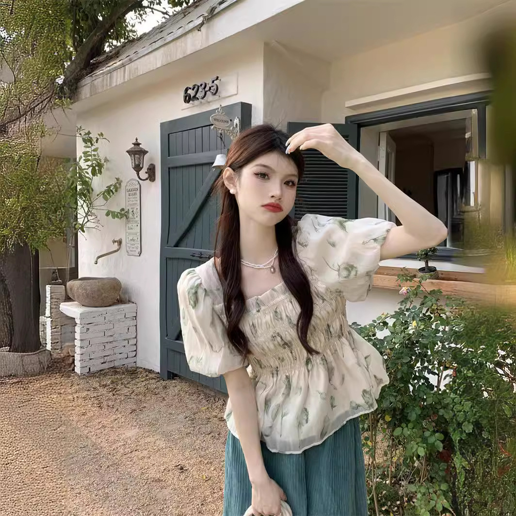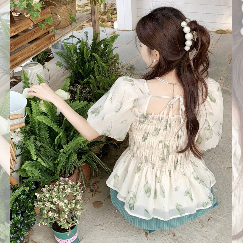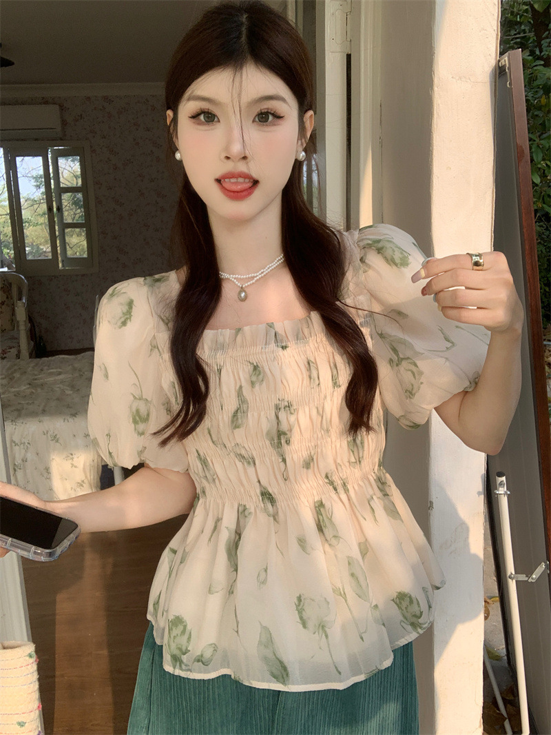 프랑스 스타일 스퀘어 칼라 플로랄 쉬폰 셔츠 여성의 2024 여름 새로운 디자인 센스 슬리밍 퍼프 슬리브 쇼트 탑 옷스토어 가기