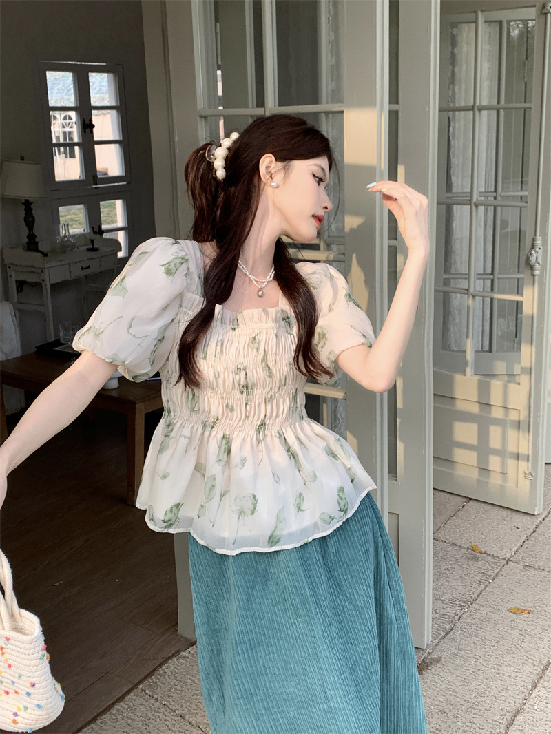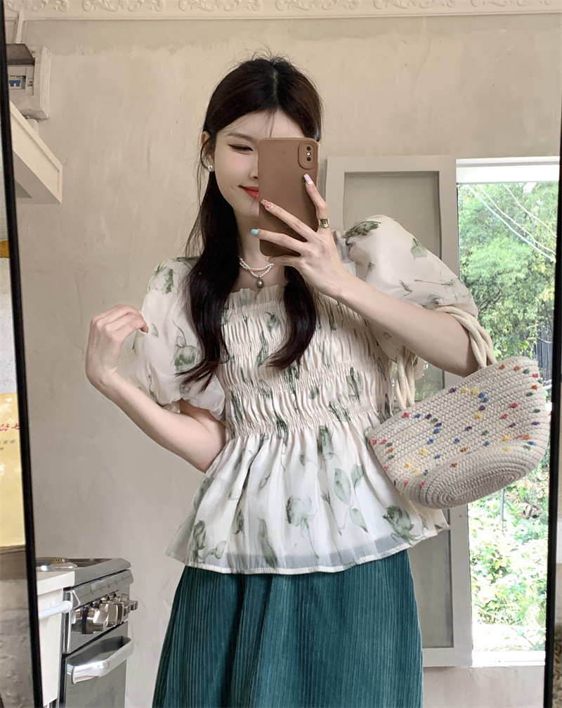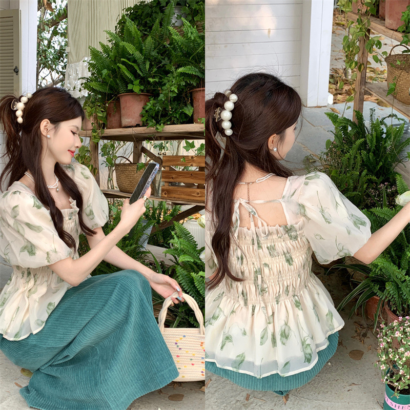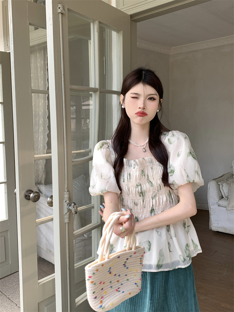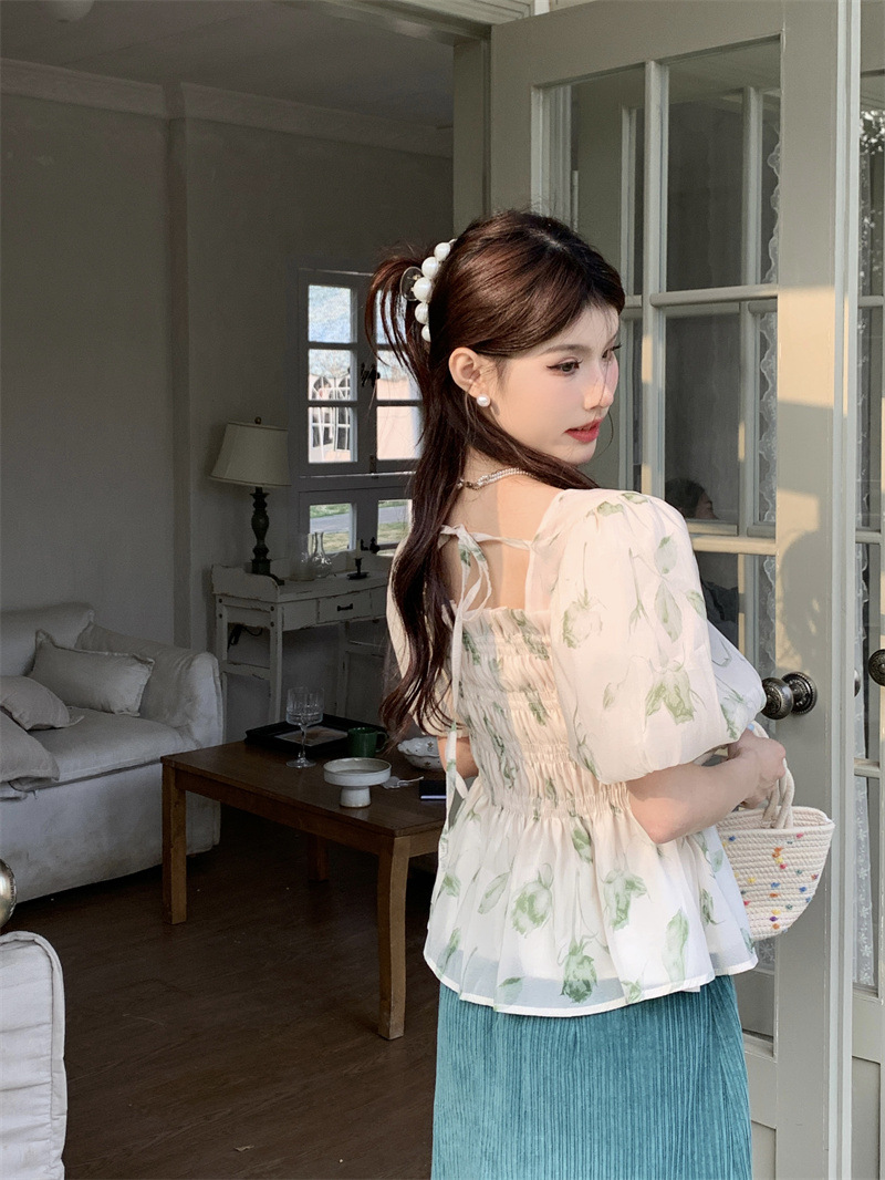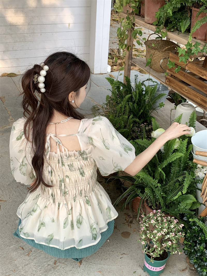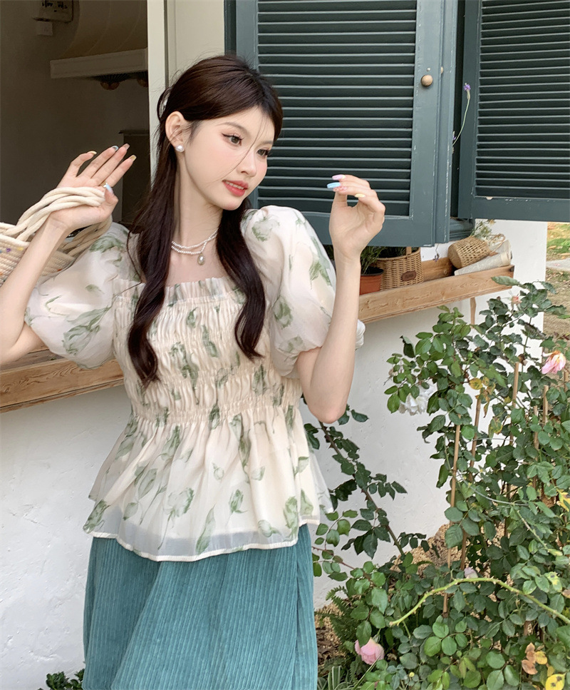 프랑스 스타일 스퀘어 칼라 플로랄 쉬폰 셔츠 여성의 2024 여름 새로운 디자인 센스 슬리밍 퍼프 슬리브 쇼트 탑 옷스토어 가기