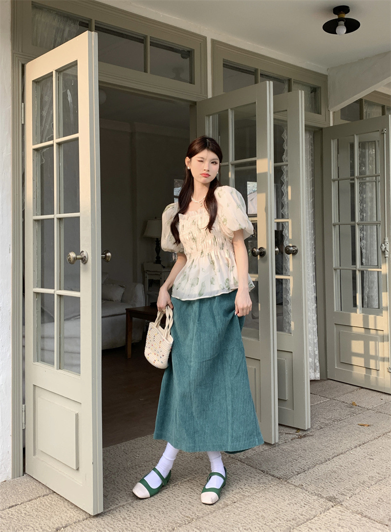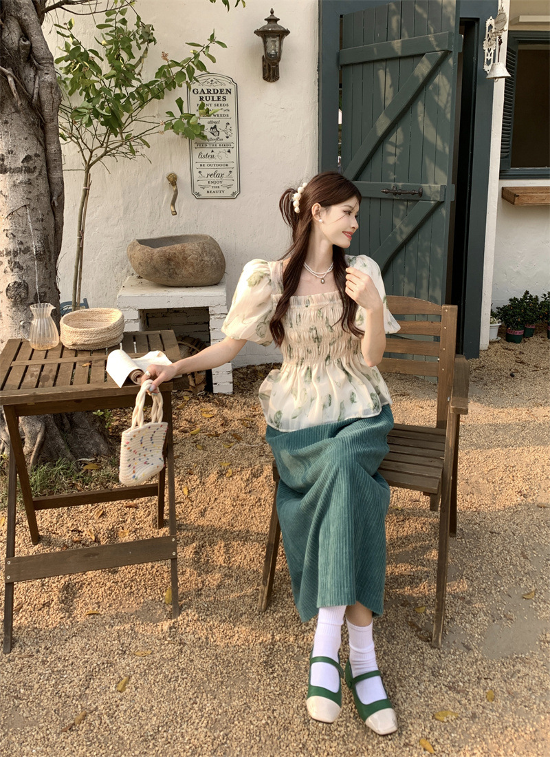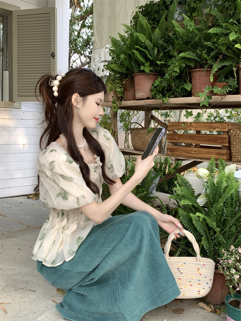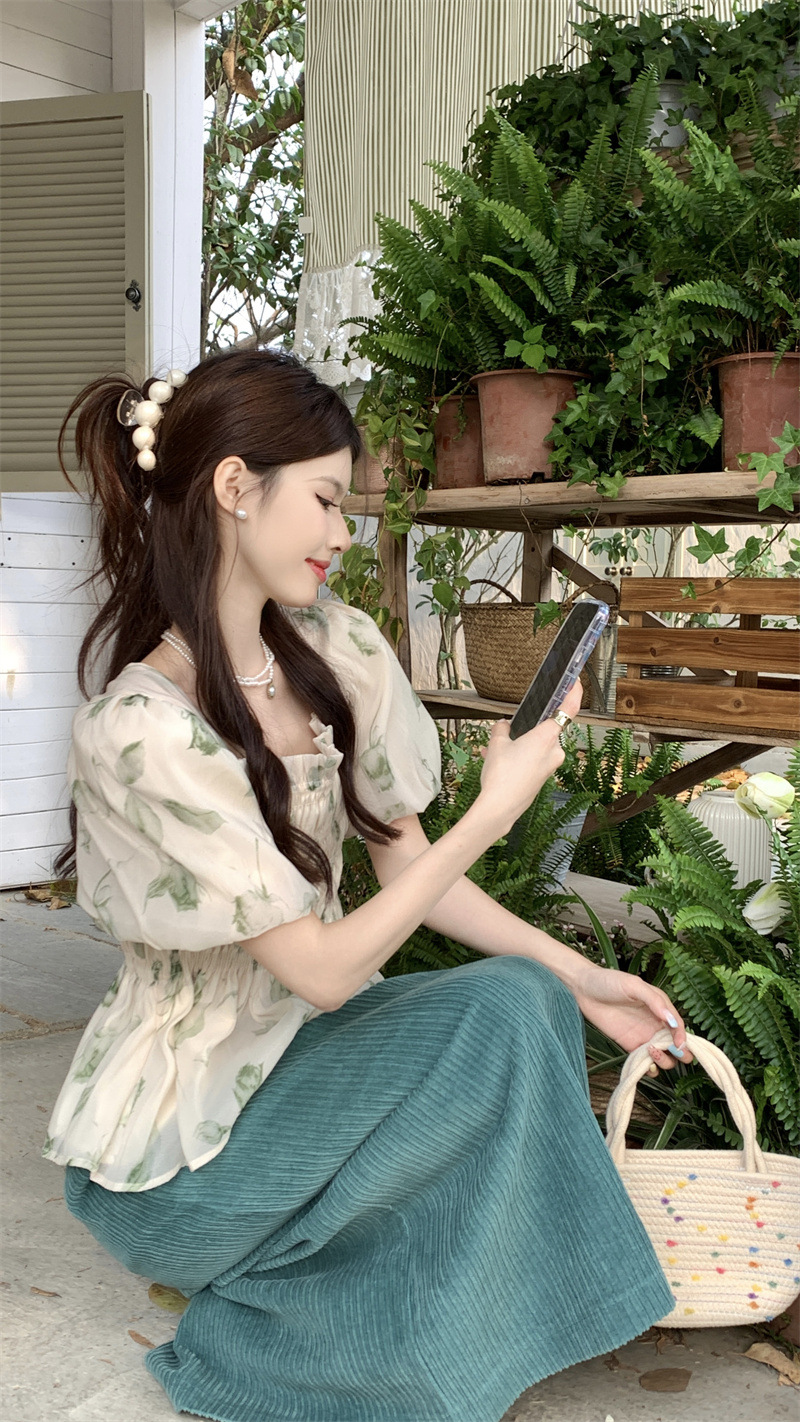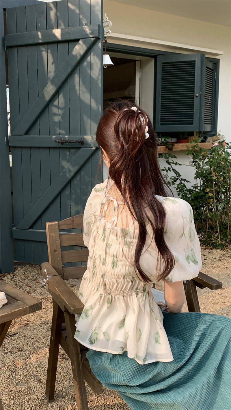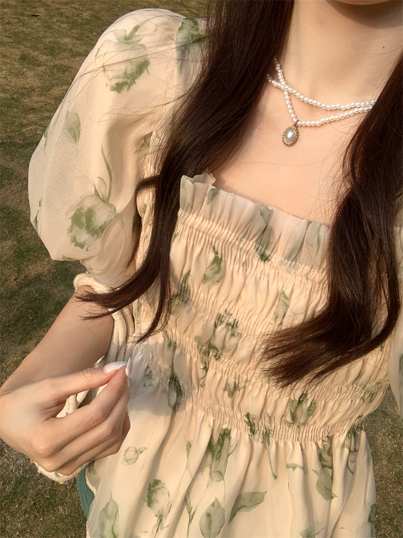 프랑스 스타일 스퀘어 칼라 플로랄 쉬폰 셔츠 여성의 2024 여름 새로운 디자인 센스 슬리밍 퍼프 슬리브 쇼트 탑 옷스토어 가기