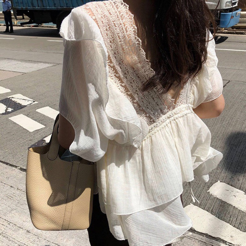 2024 새로운 요정 러플 V 넥 레이스 탑 느슨한 짧은 소매 크림 살구색 쉬폰 셔츠 여성스토어 가기