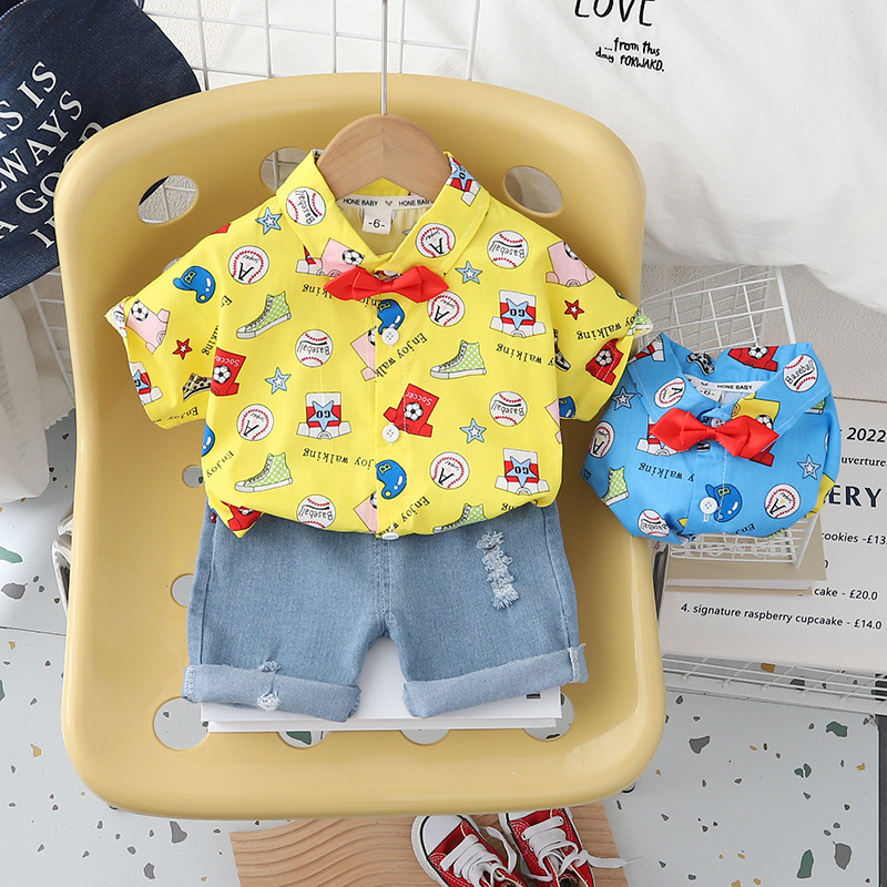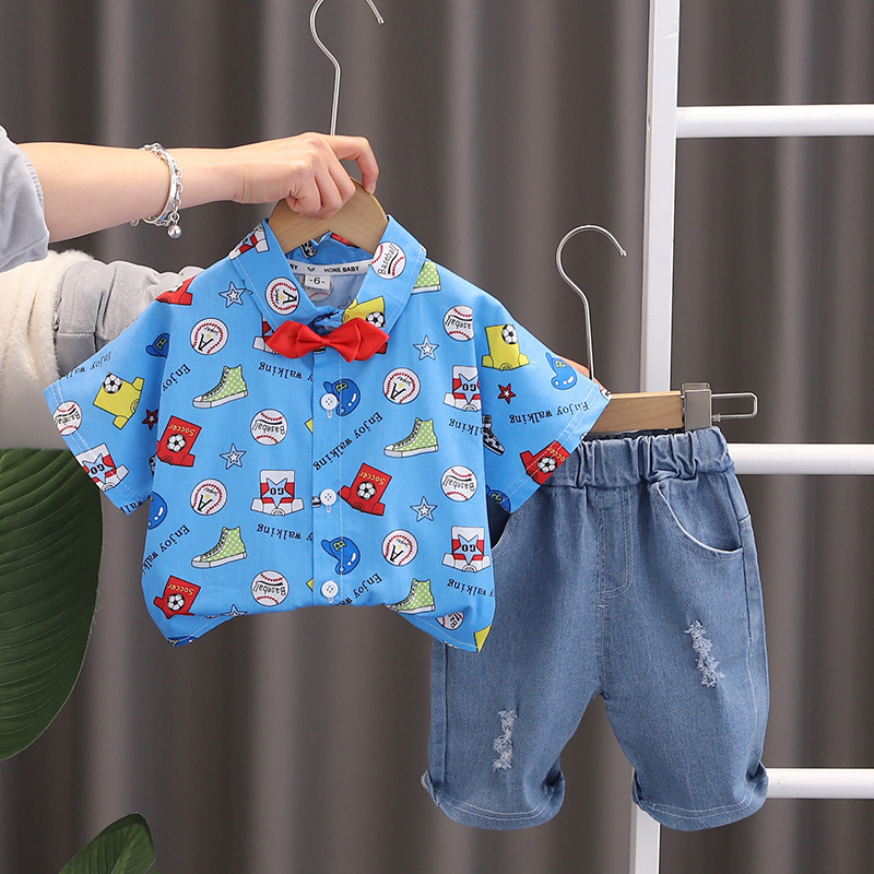 바오 마이 소년 세트 반팔 셔츠 2024 새로운 셔츠 얇은 영국 스타일 만화 어린이 여름 투피스 세트스토어 가기