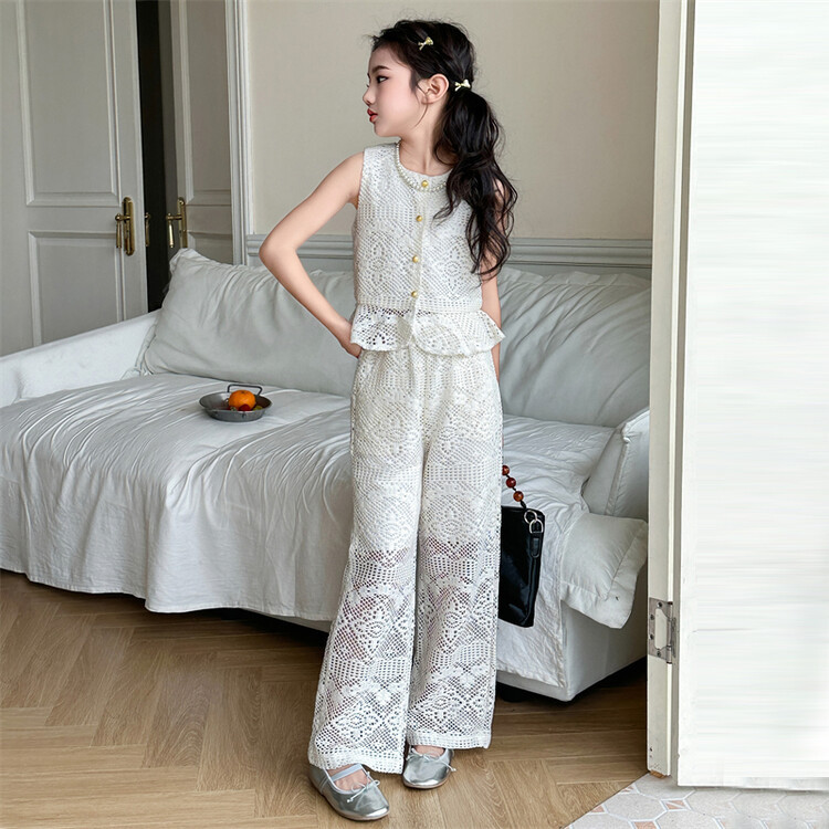 여자 여름 레이스 크로 셰 뜨개질 정장 2025 새로운 중대형 어린이 한국 스타일 민소매 탑 와이드 레그 스트레이트 바지 유행