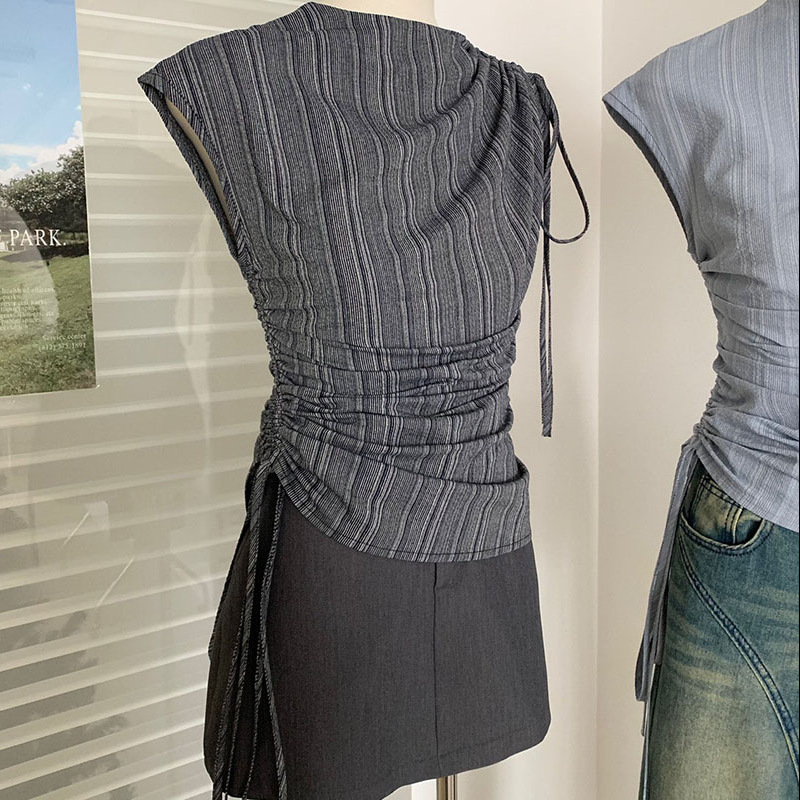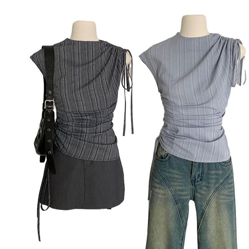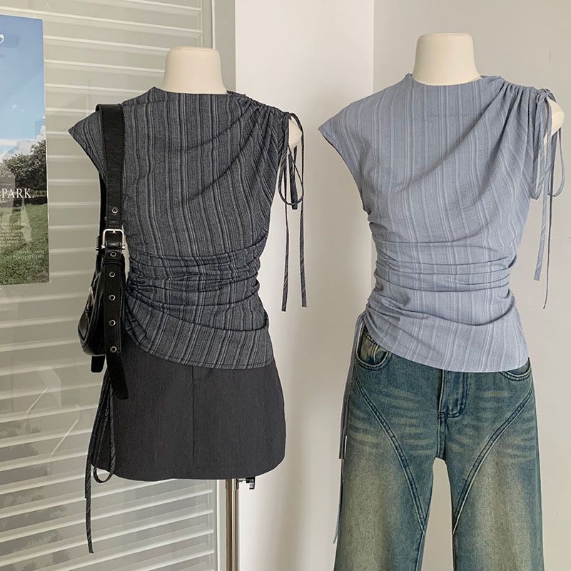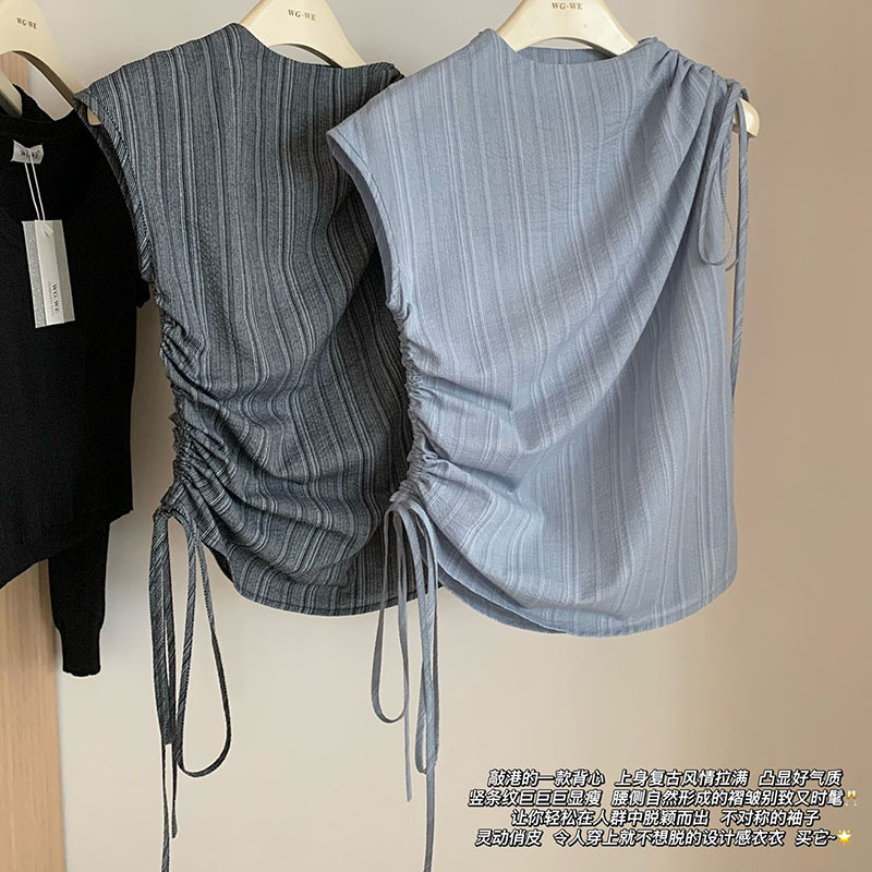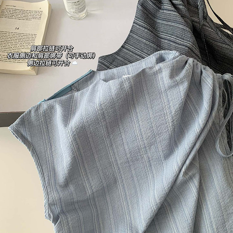 프랑스 블루 스트라이프 드로우 스트랩 셔츠 여성의 2024 여름 새로운 패션 디자인 달콤한 쿨 한국 탑