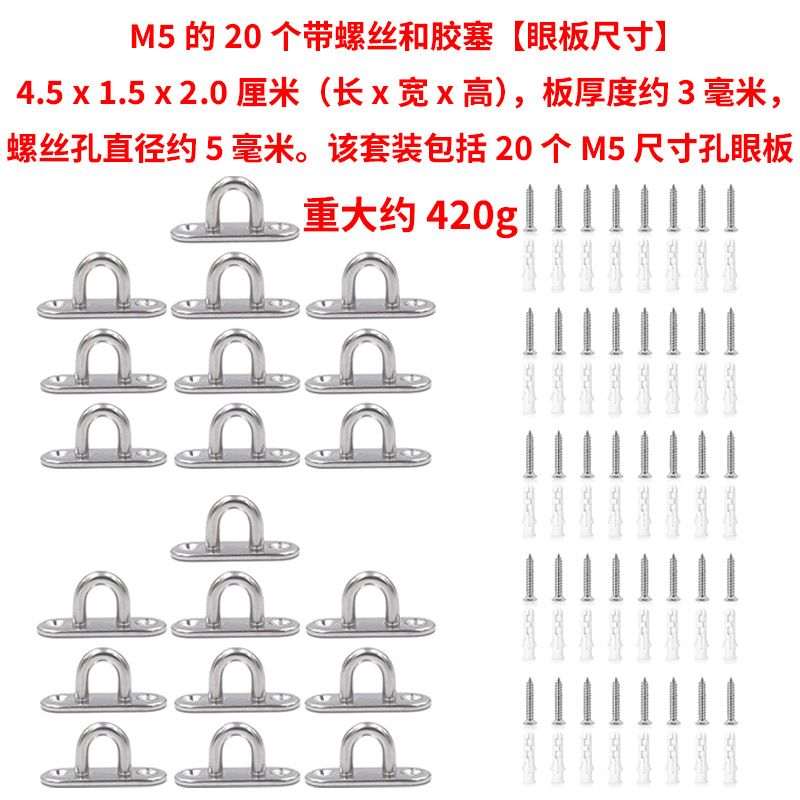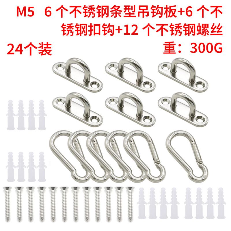 • M5에는 스테인레스 스틸 바 후크 플레이트 6개, 스테인레스 스틸 버클 후크 6개, 고무 플러그가 있는 스테인레스 스틸 나사 12개로 구성된 24개 세트가 있으며 무게는 300G입니다.