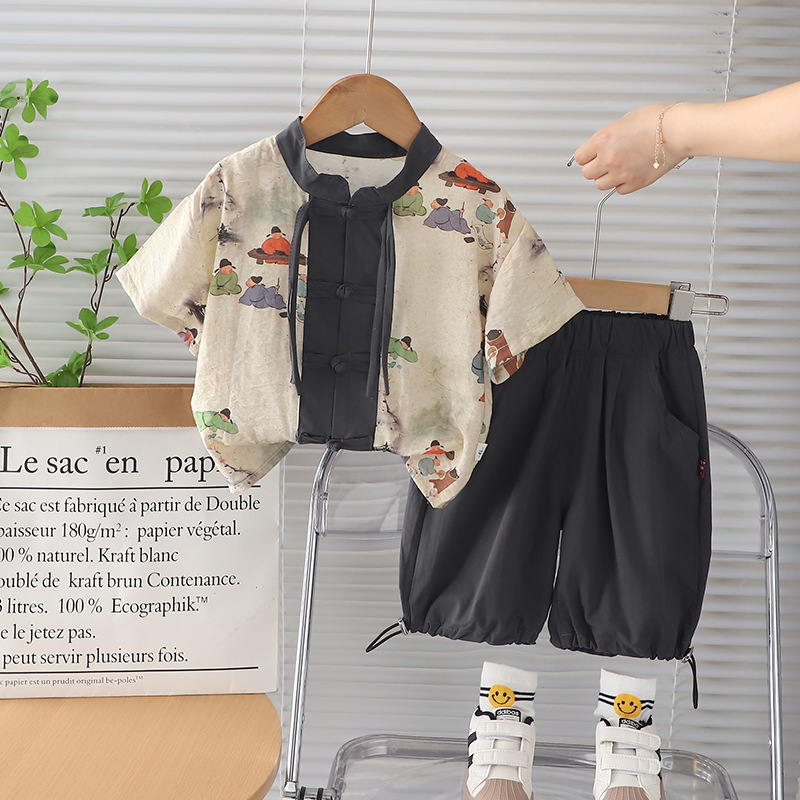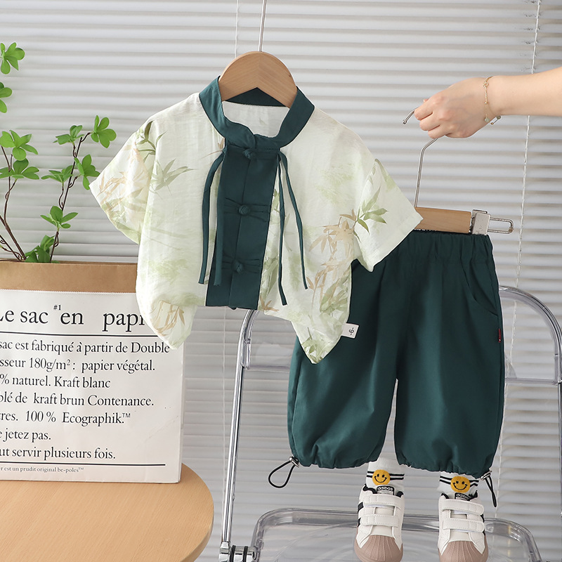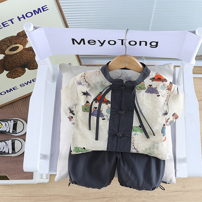 Baomai 아동복 2024 여름 0-4 명의 새로운 소년 Guofeng 짧은 소매 Tang 세트 Hanfu 3 아기 축제 세트 외국 스타일스토어 가기