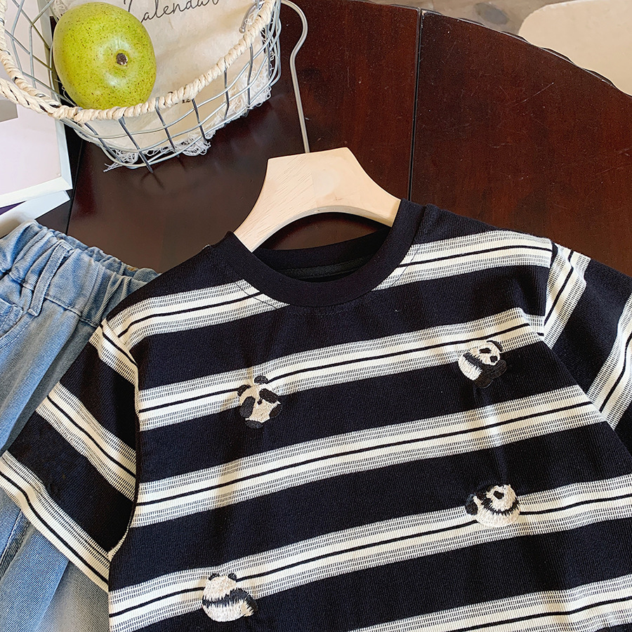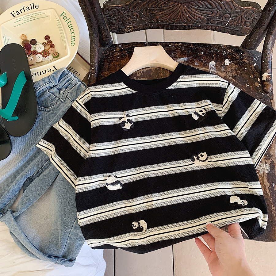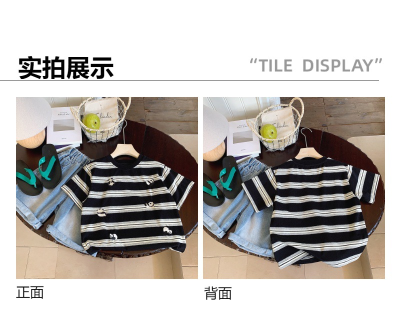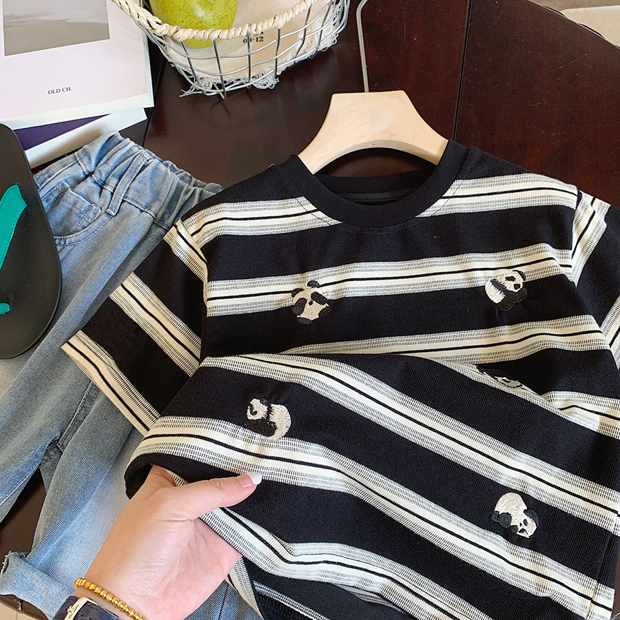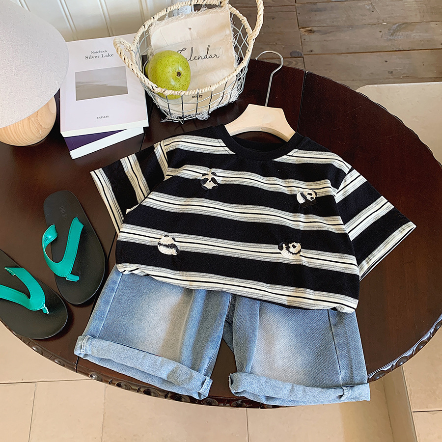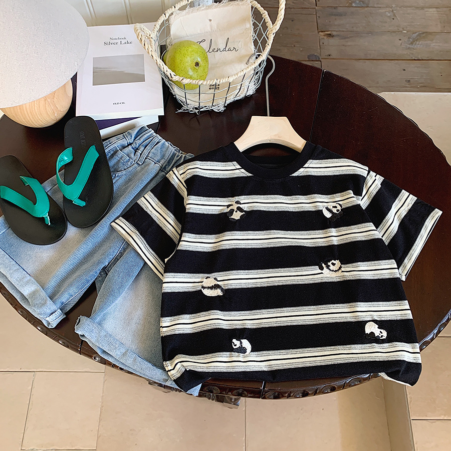 어린이 반팔 2025 여름 새로운 아동 의류 소년 한국 스타일 줄무늬 만화 자수 티셔츠 아기 다목적상의스토어 가기