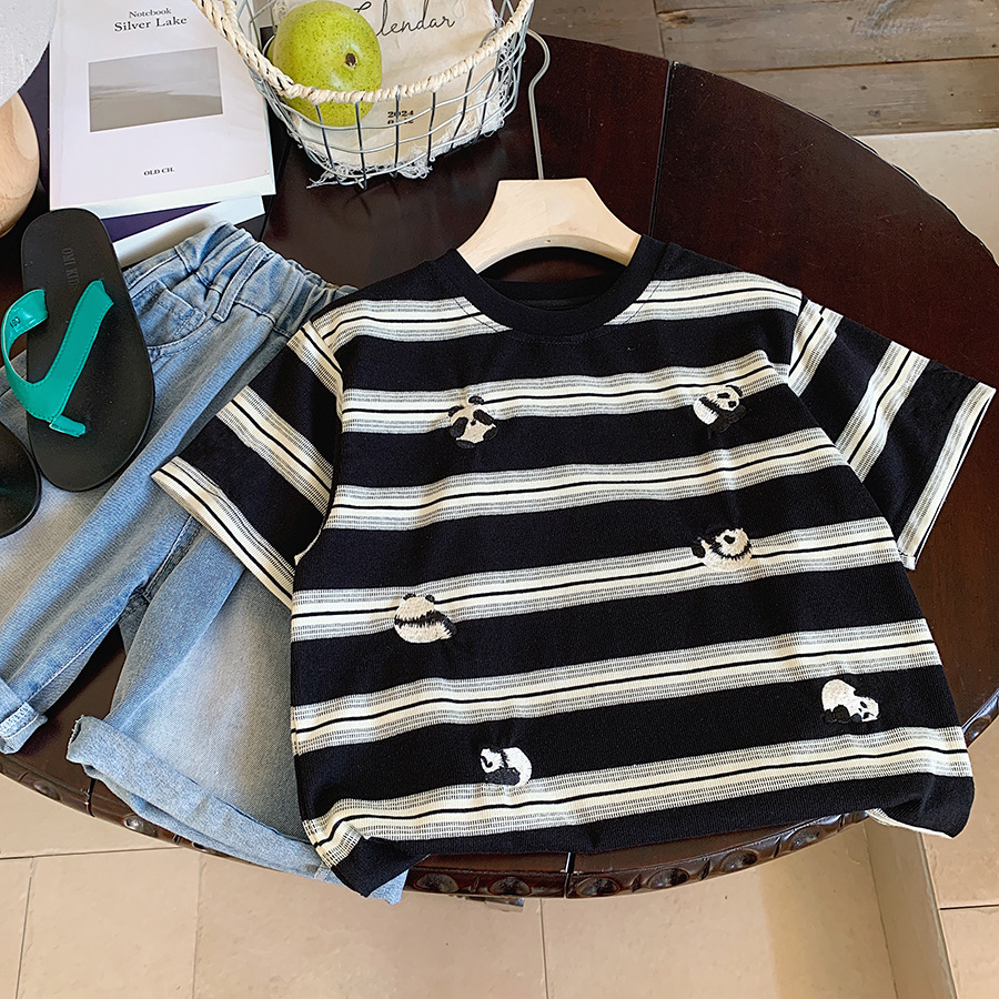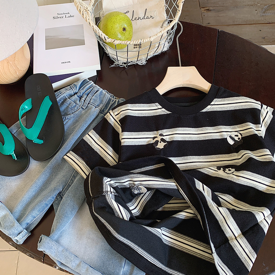 어린이 반팔 2025 여름 새로운 아동 의류 소년 한국 스타일 줄무늬 만화 자수 티셔츠 아기 다목적상의