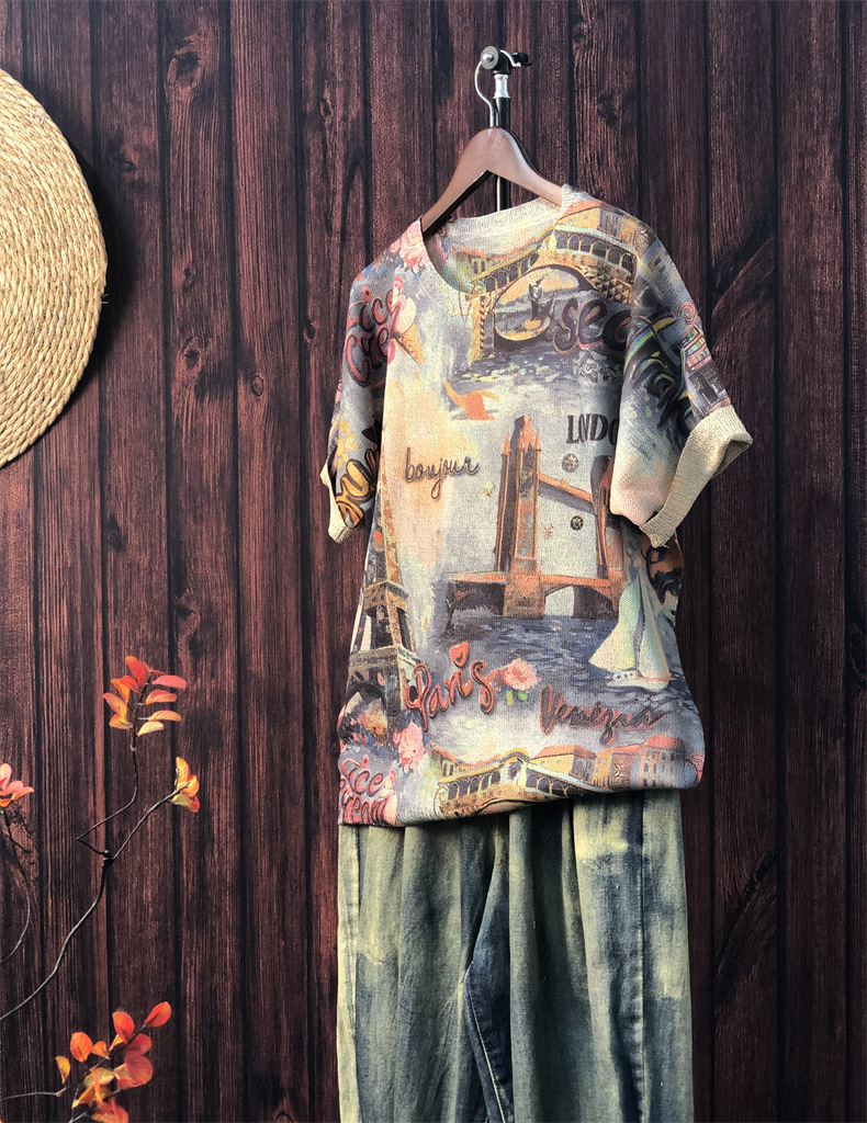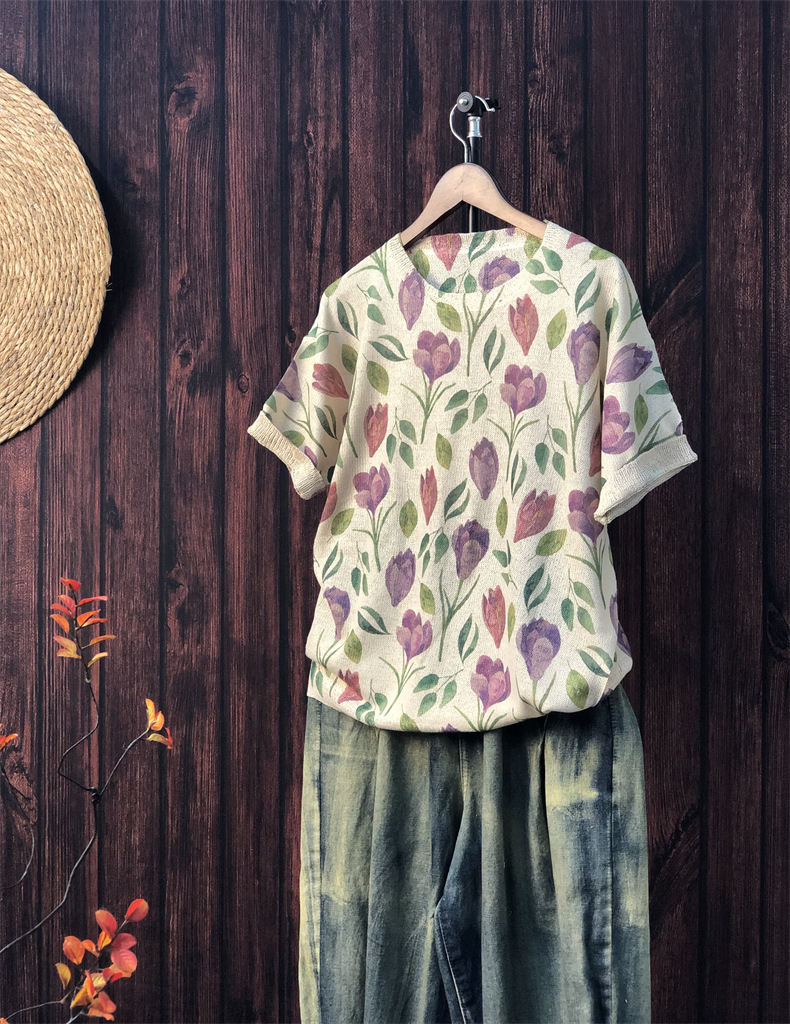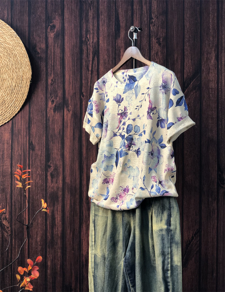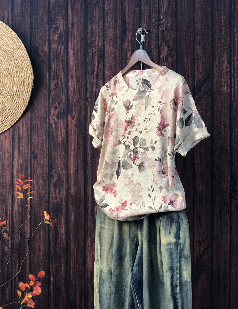 2024 여름 신작 오리지널 프린트 스웨터 캐주얼 대형 루즈 플라워 패턴 대마 얇은 여성 반팔