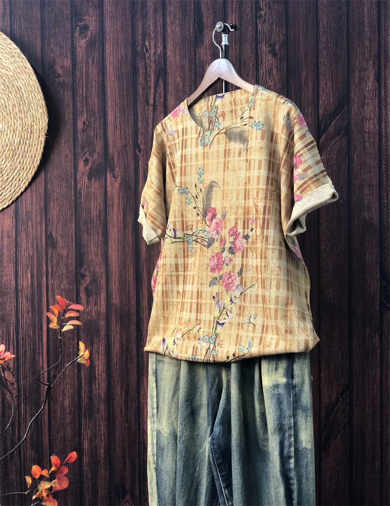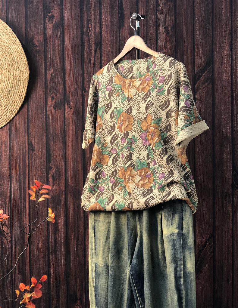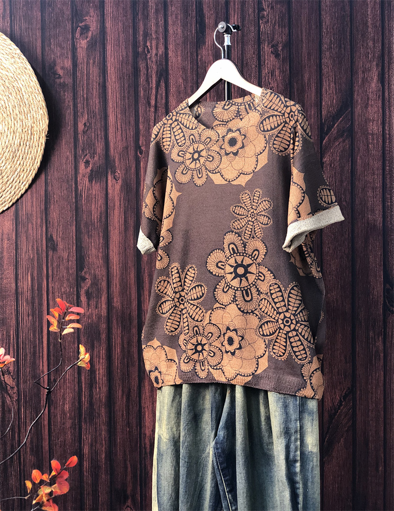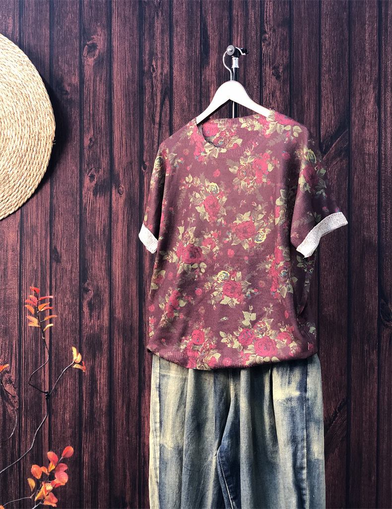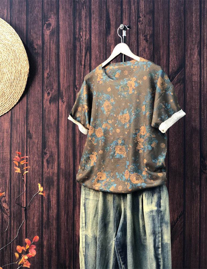 2024 여름 신작 오리지널 프린트 스웨터 캐주얼 대형 루즈 플라워 패턴 대마 얇은 여성 반팔