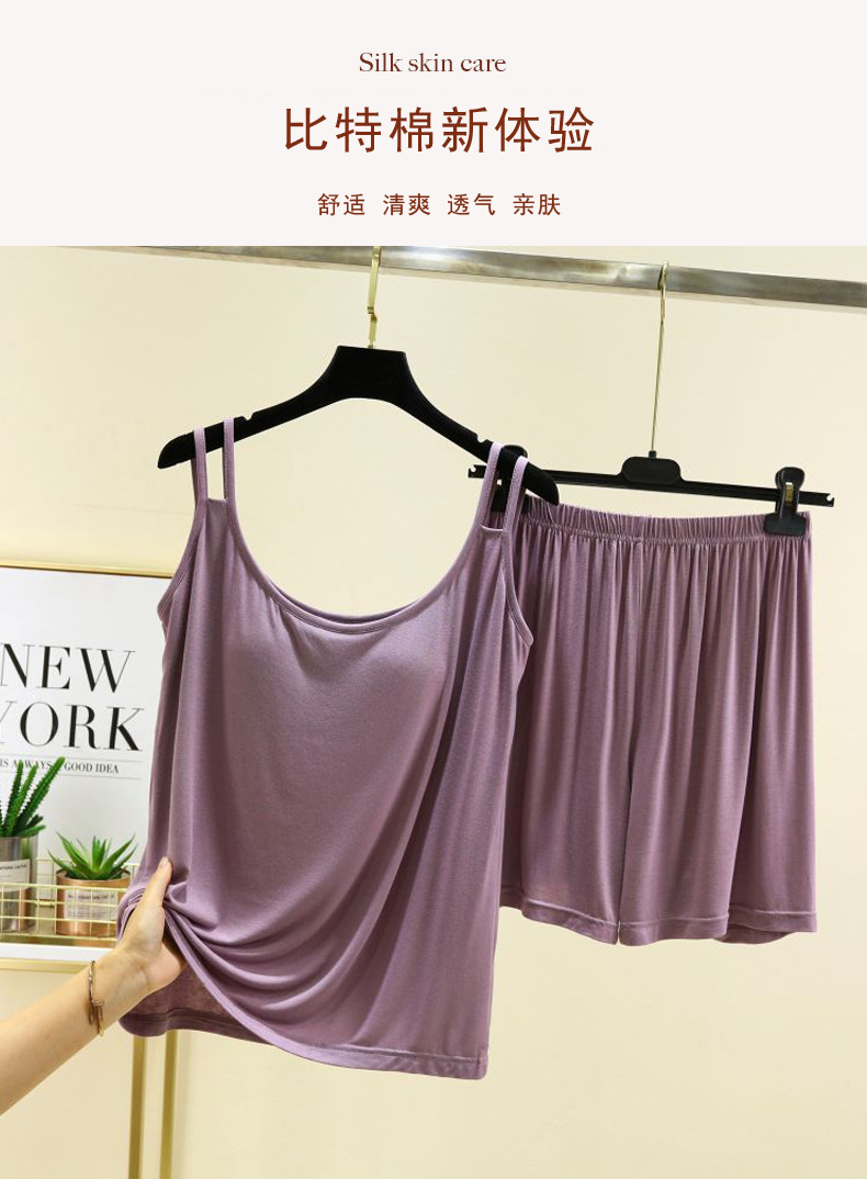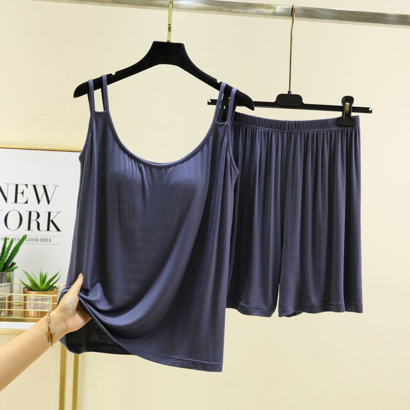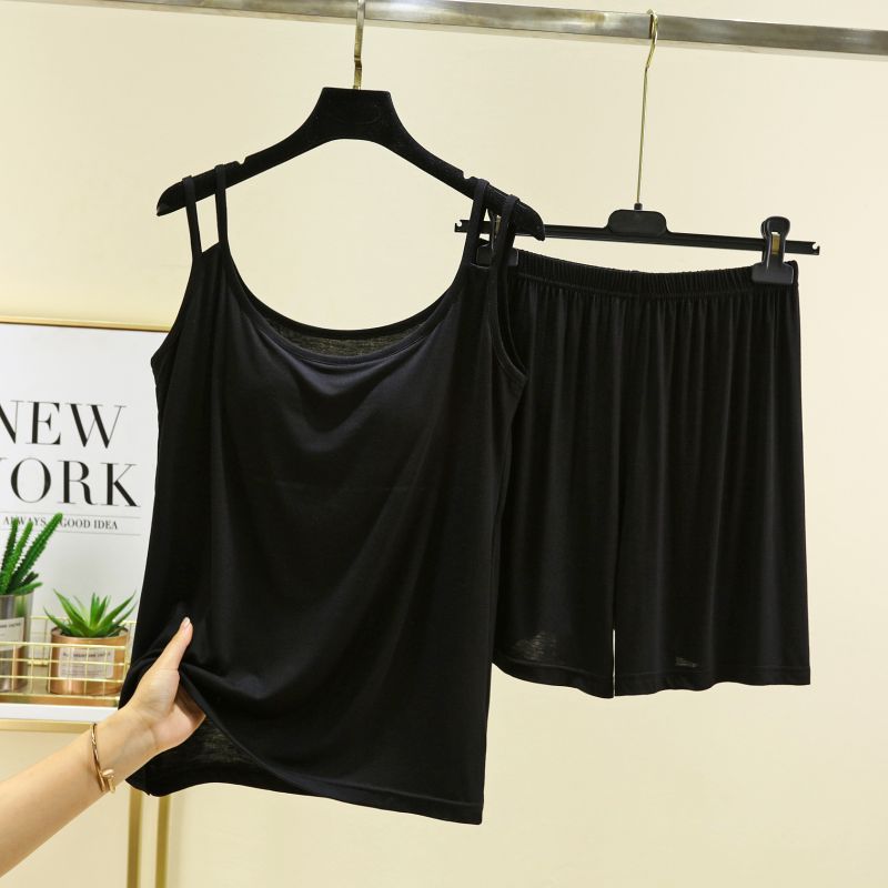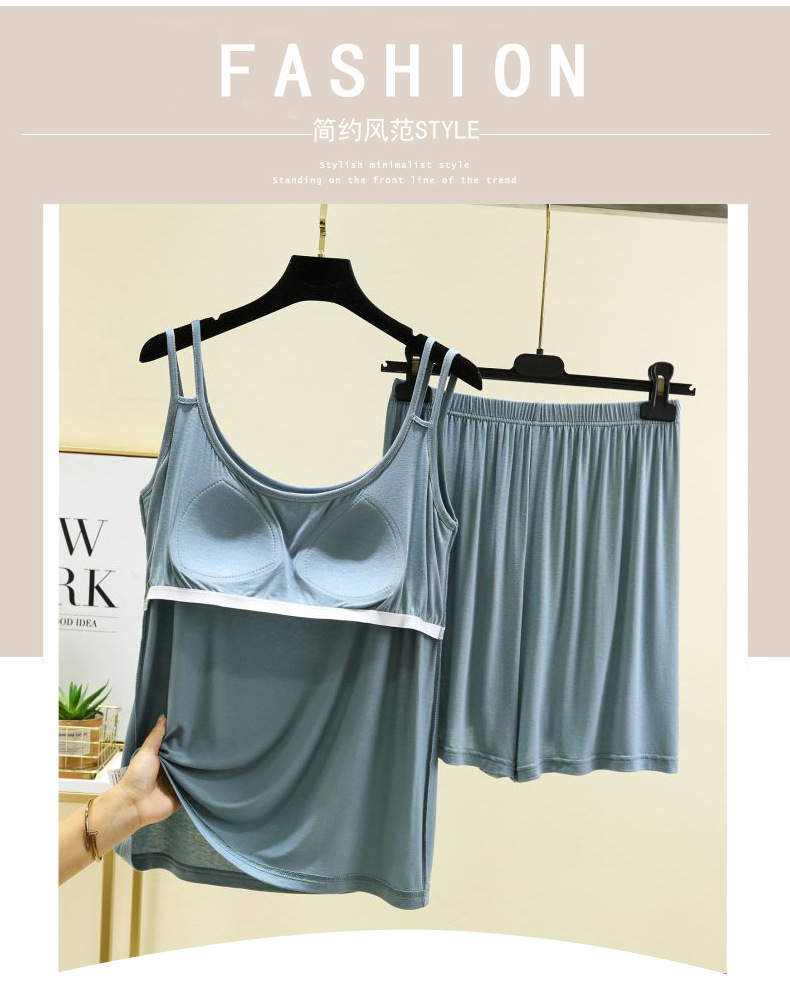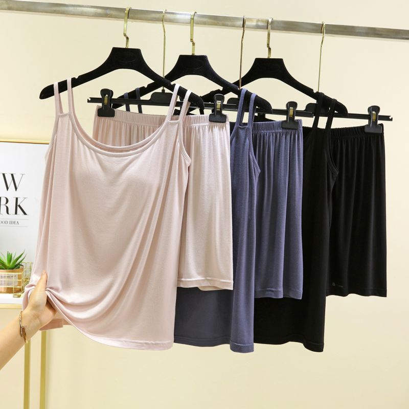 가슴 패드가 달린 잠옷 여성용 여름 얇은 플러스 사이즈 슬링 반바지 2 피스 세트 모달 겉옷 캐주얼 홈 옷스토어 가기