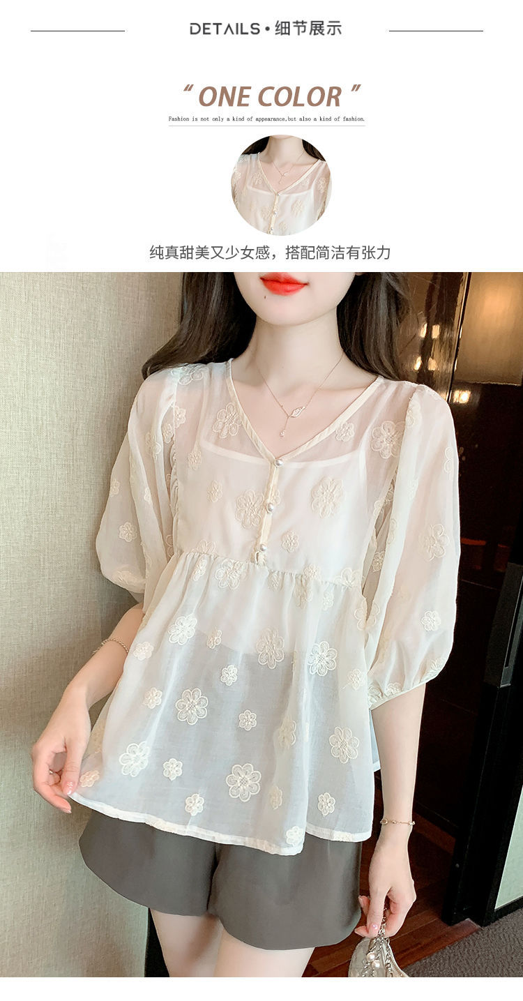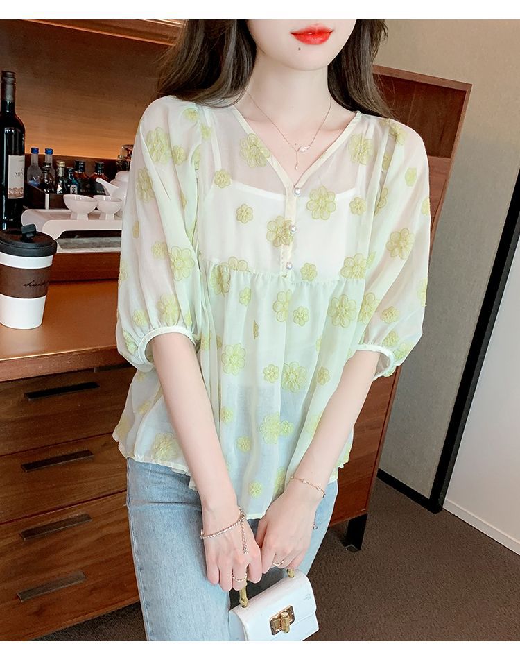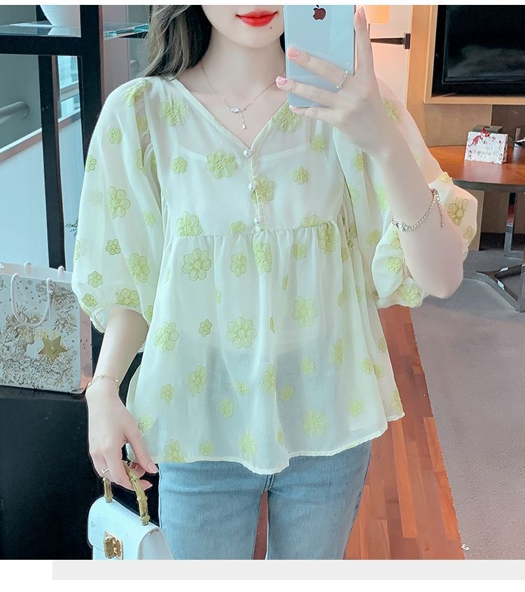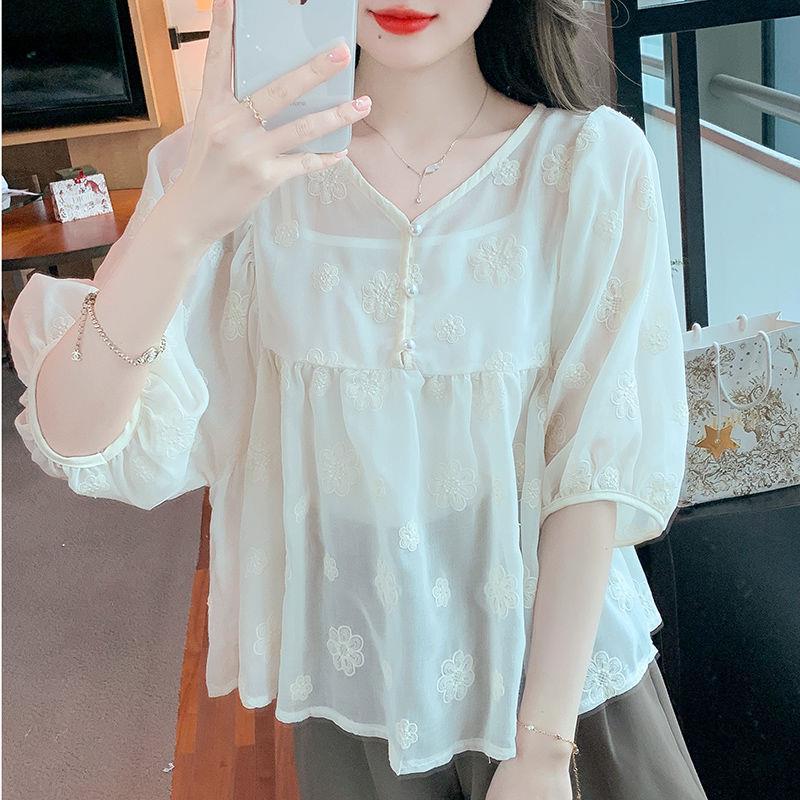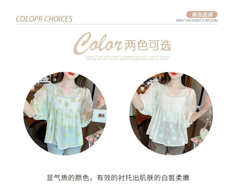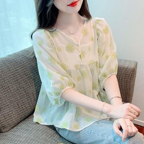 2025년 여름 새로운 스타일의 루즈한 배 커버 디자인 틈새 인형 셔츠 탑 꽃무늬 쉬폰 셔츠 여성용 반팔스토어 가기