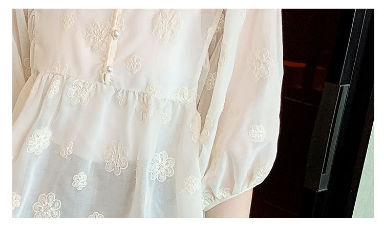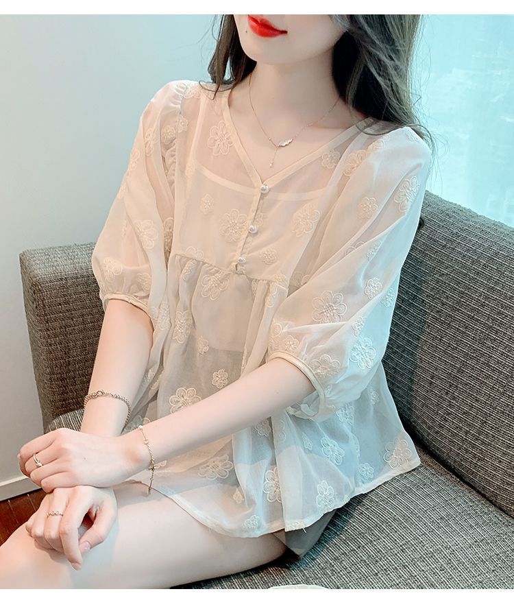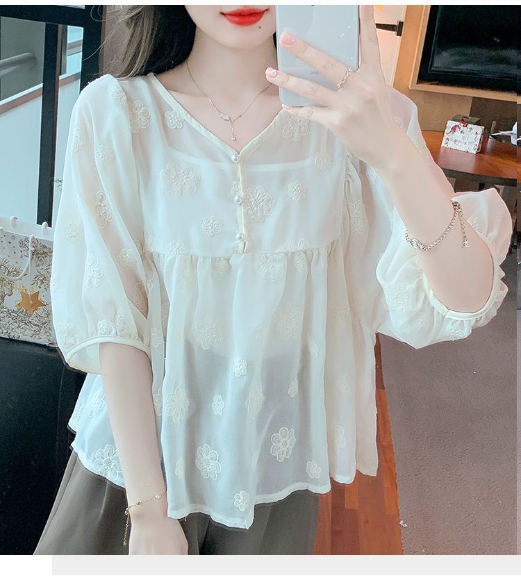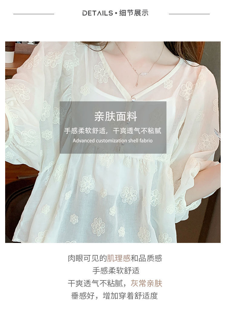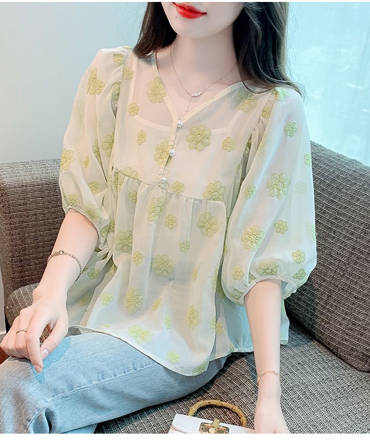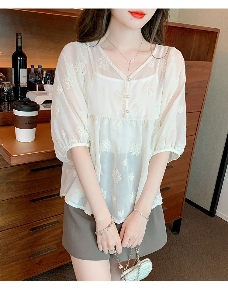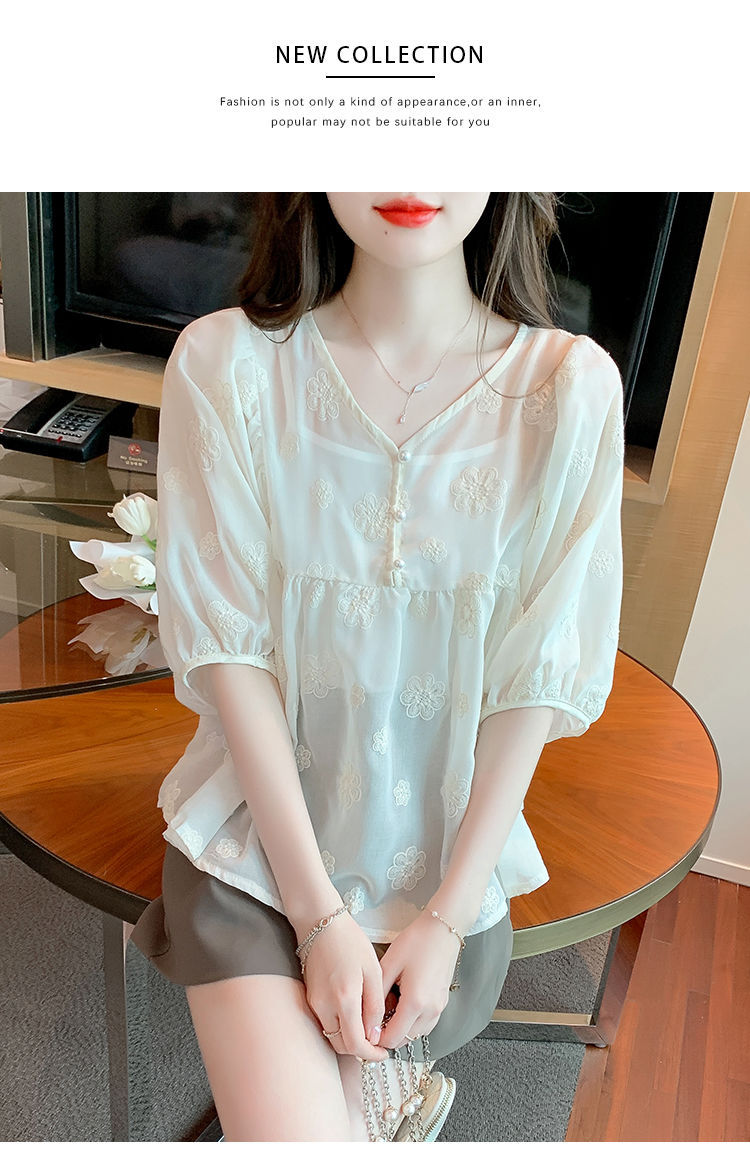 2025년 여름 새로운 스타일의 루즈한 배 커버 디자인 틈새 인형 셔츠 탑 꽃무늬 쉬폰 셔츠 여성용 반팔스토어 가기
