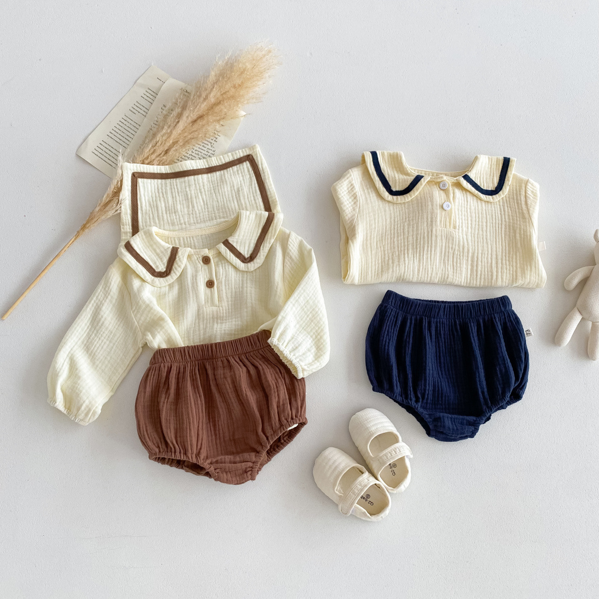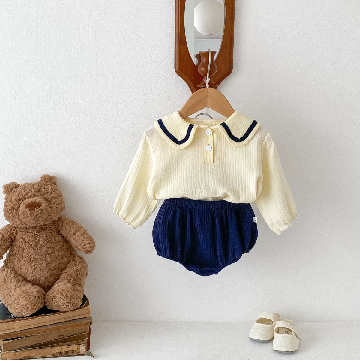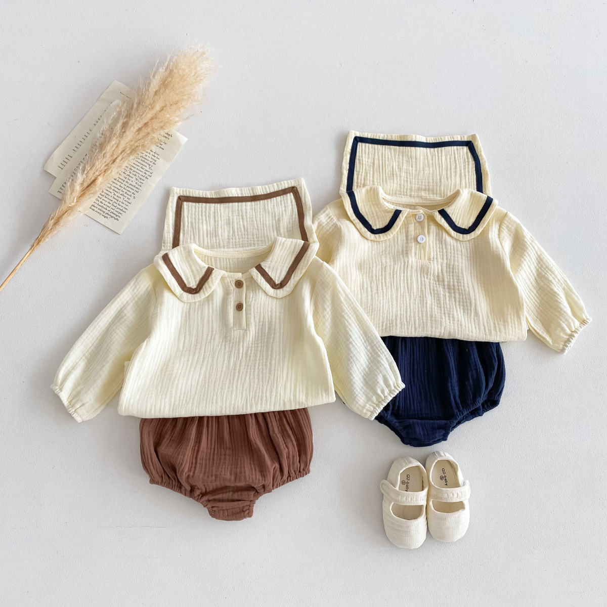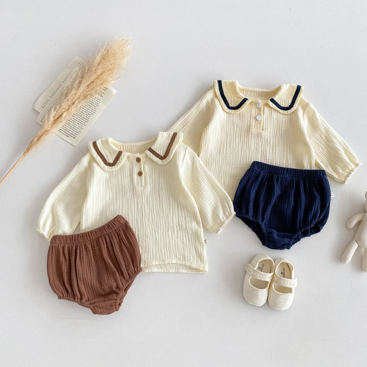 한국 스타일 아기 옷깃 탑 빵 바지 세트 유니섹스 신생아 네이비 칼라 면 캐주얼 세트