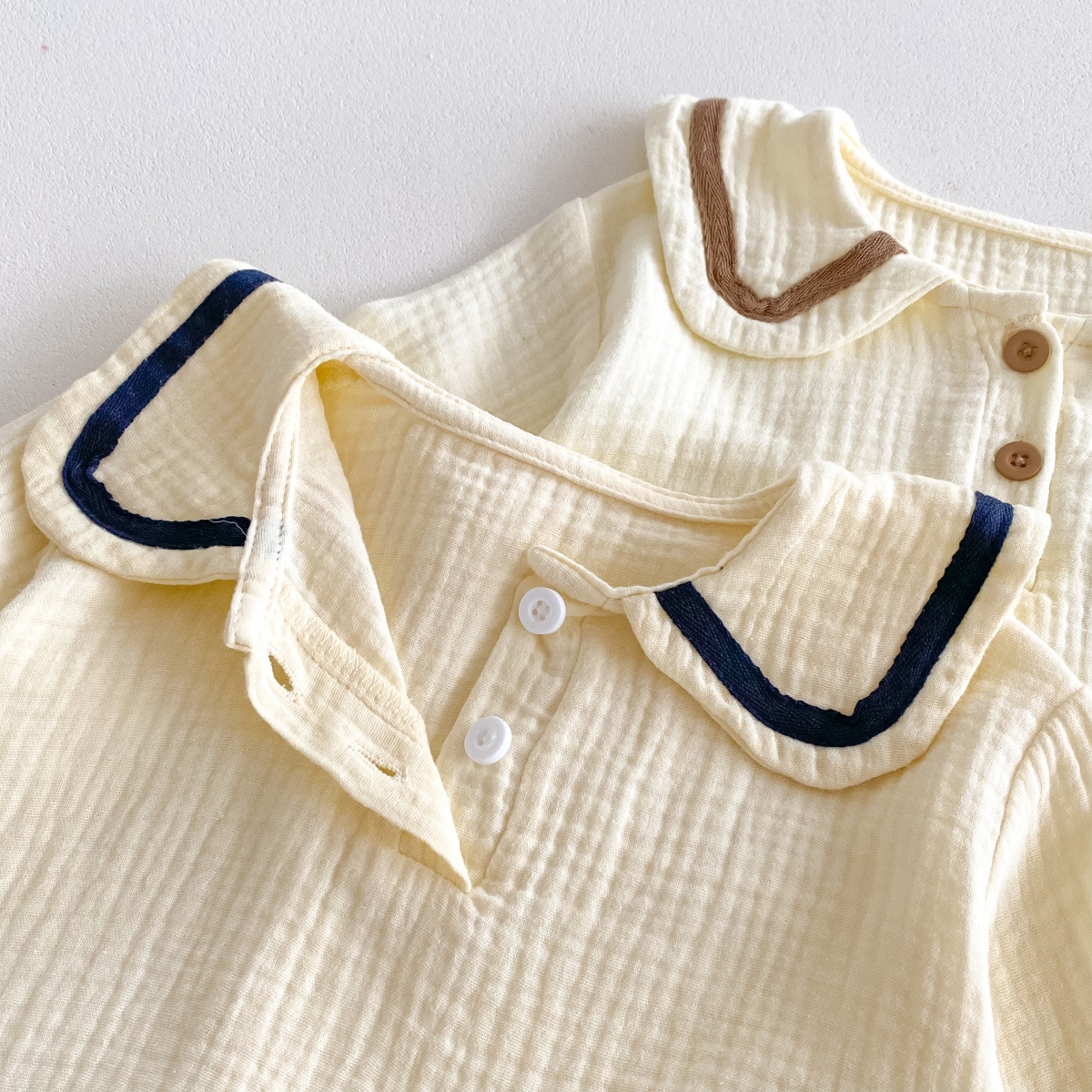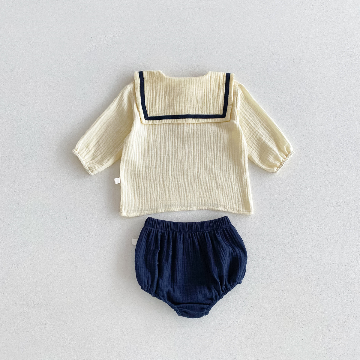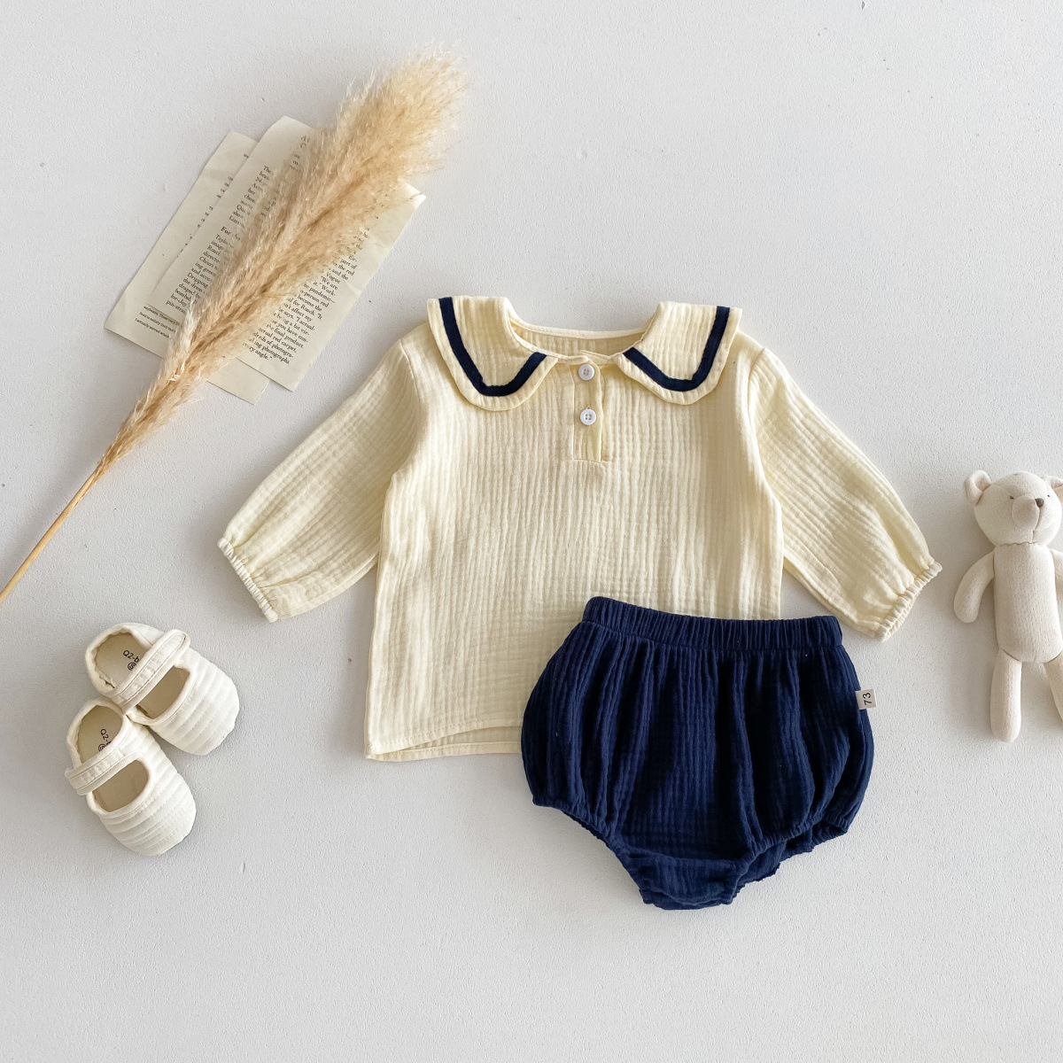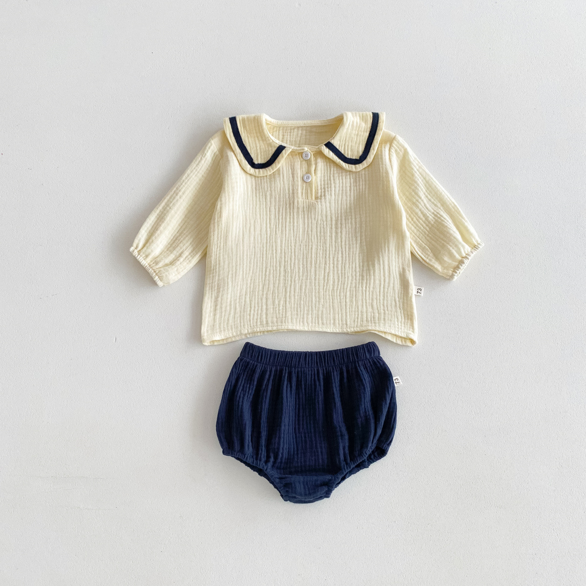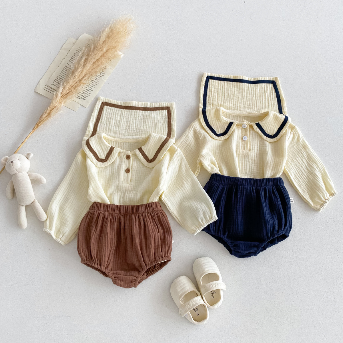 한국 스타일 아기 옷깃 탑 빵 바지 세트 유니섹스 신생아 네이비 칼라 면 캐주얼 세트