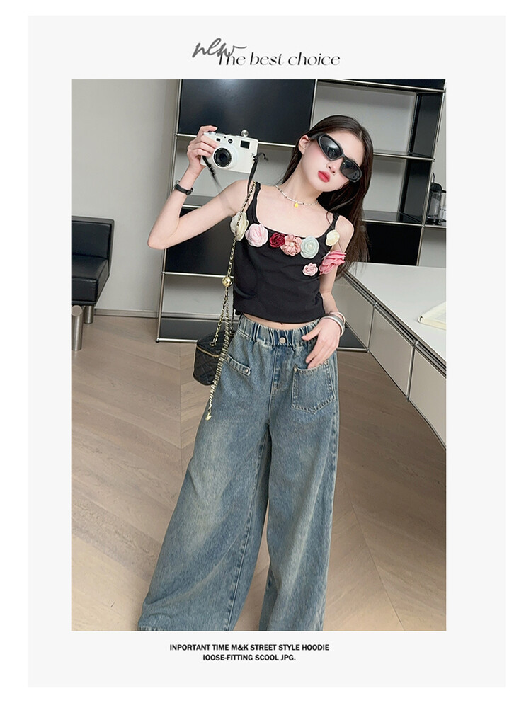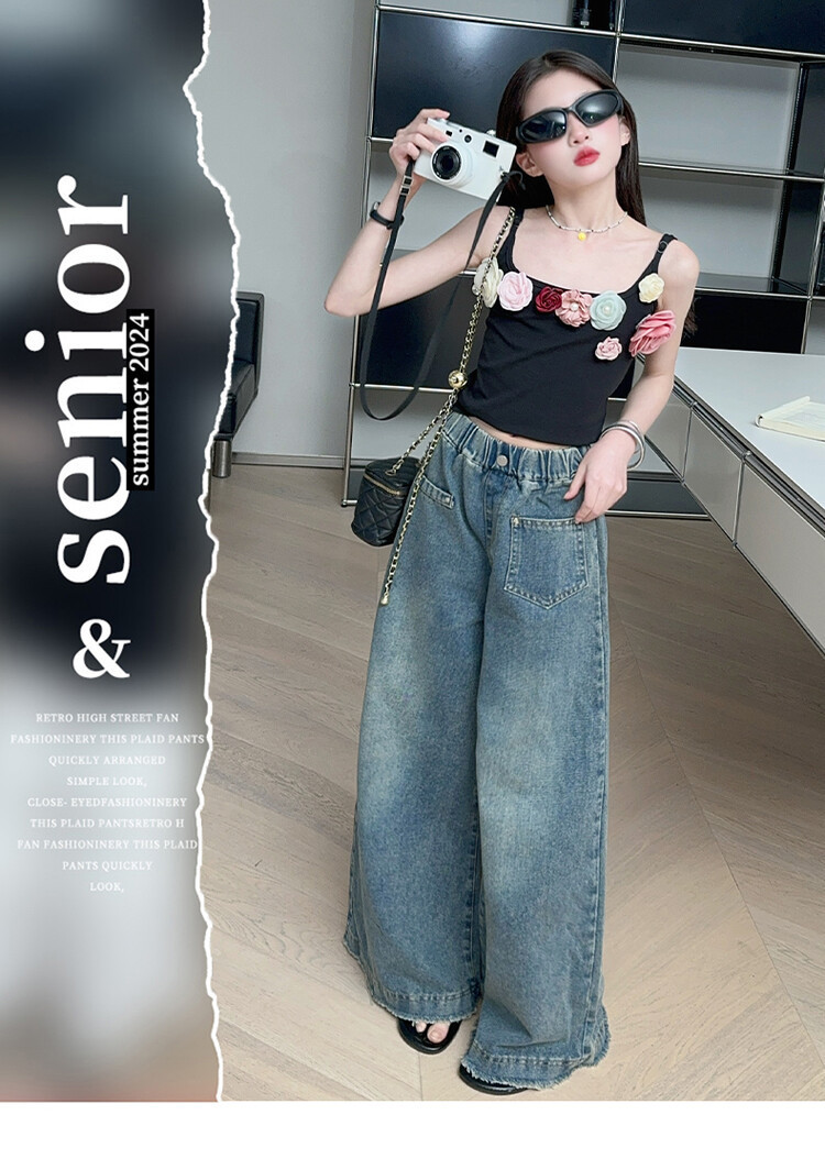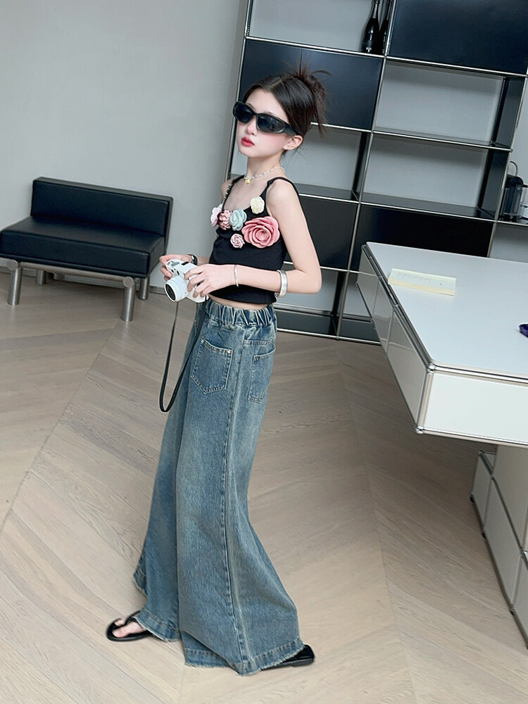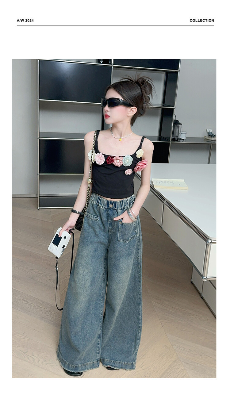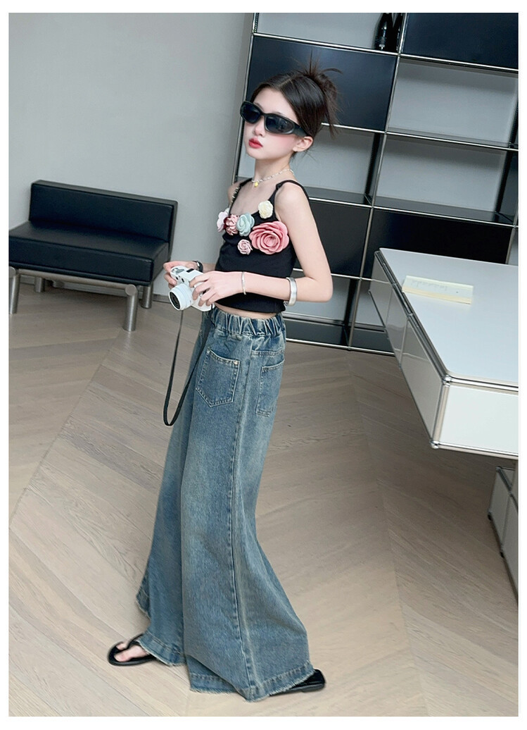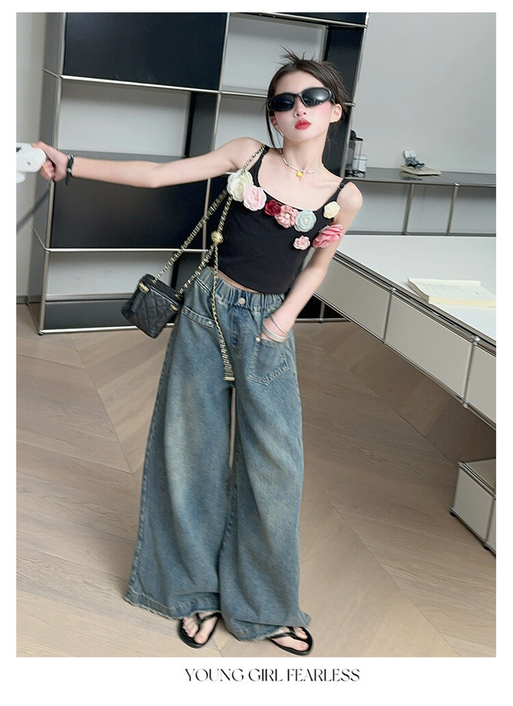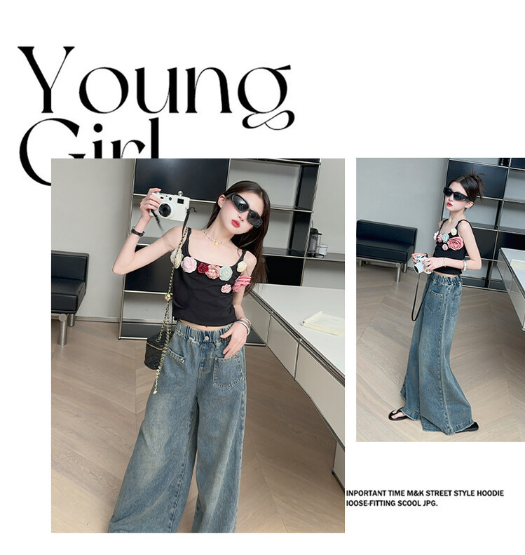 소녀 카미솔 유행 데님 넓은 다리 바지 한국 여름 얇은 어린이 달콤한 쿨 프라이드 스트리트 세트 아마존스토어 가기