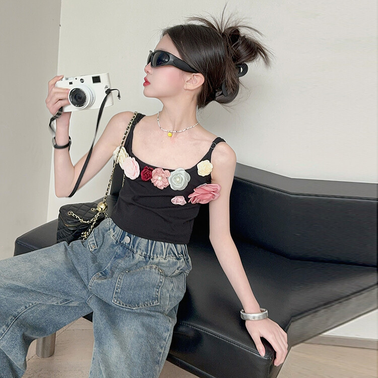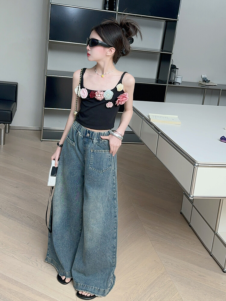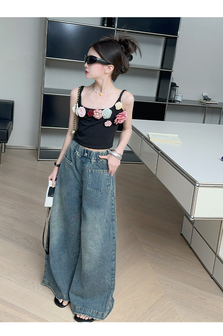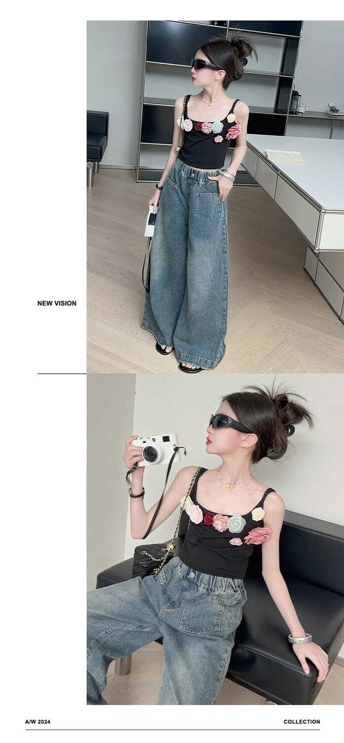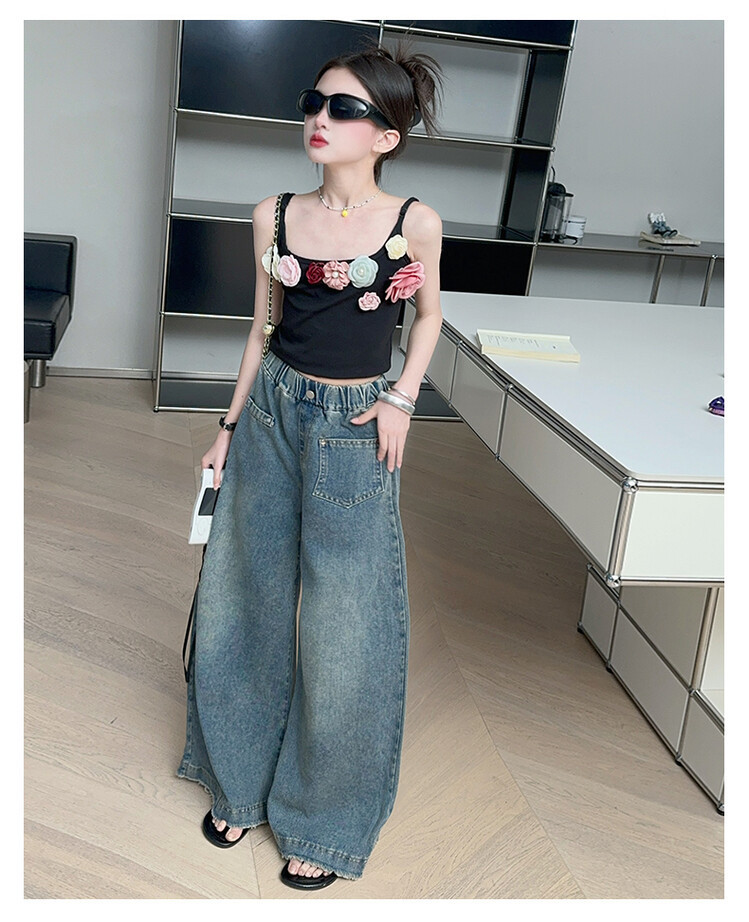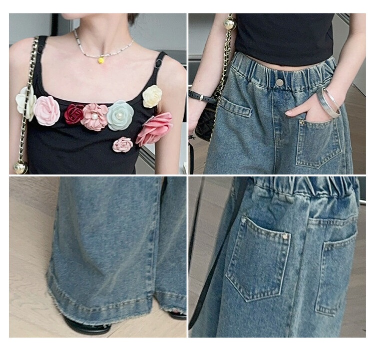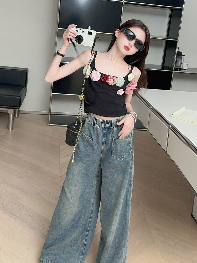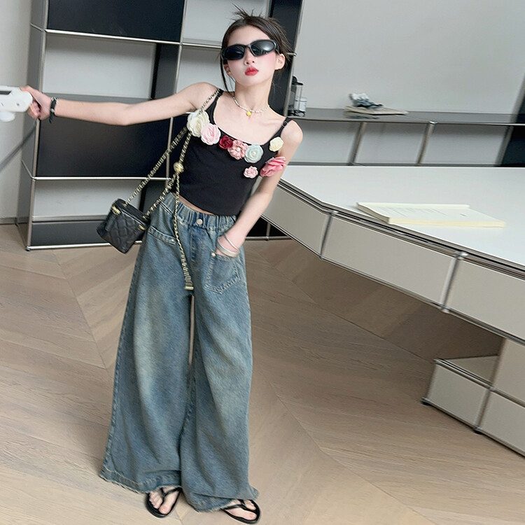 소녀 카미솔 유행 데님 넓은 다리 바지 한국 여름 얇은 어린이 달콤한 쿨 프라이드 스트리트 세트 아마존스토어 가기