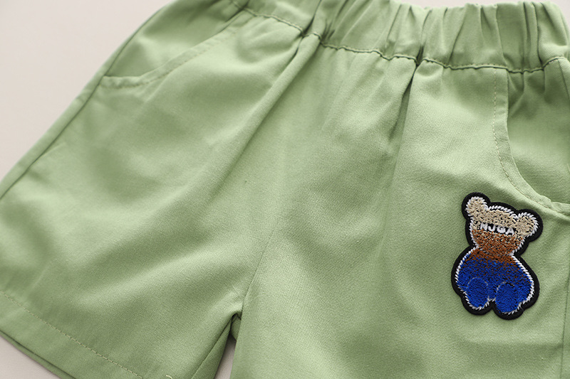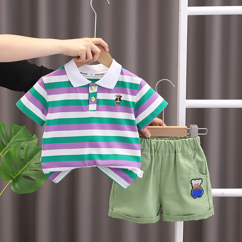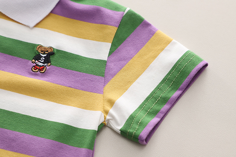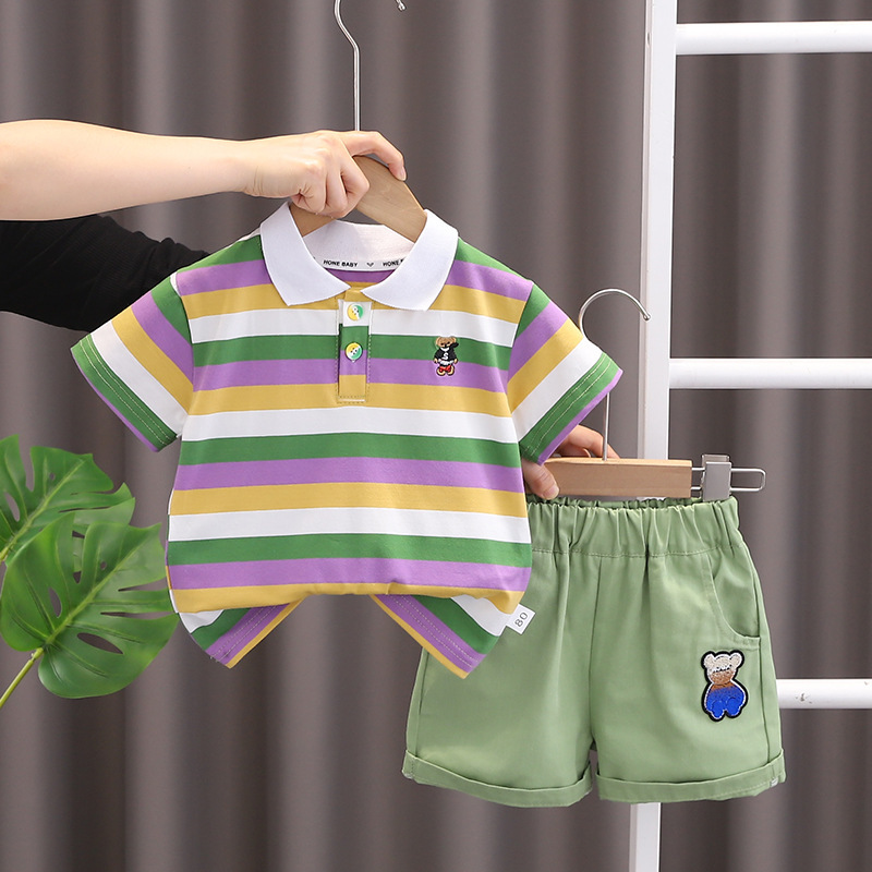 남자들의 2024 서양 스타일 새로운 여름 캐주얼 세트 소년 베이비 컬러 스트립 곰 얇은 여름 짧은 소매 도매스토어 가기
