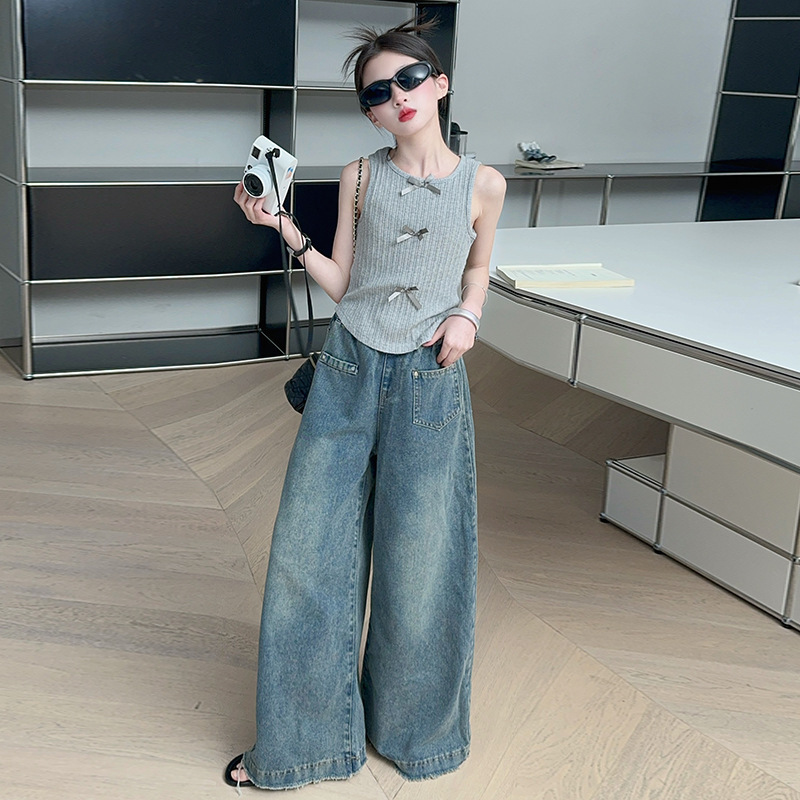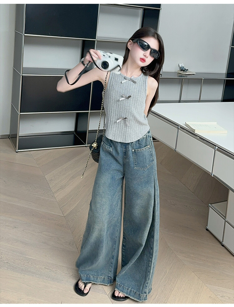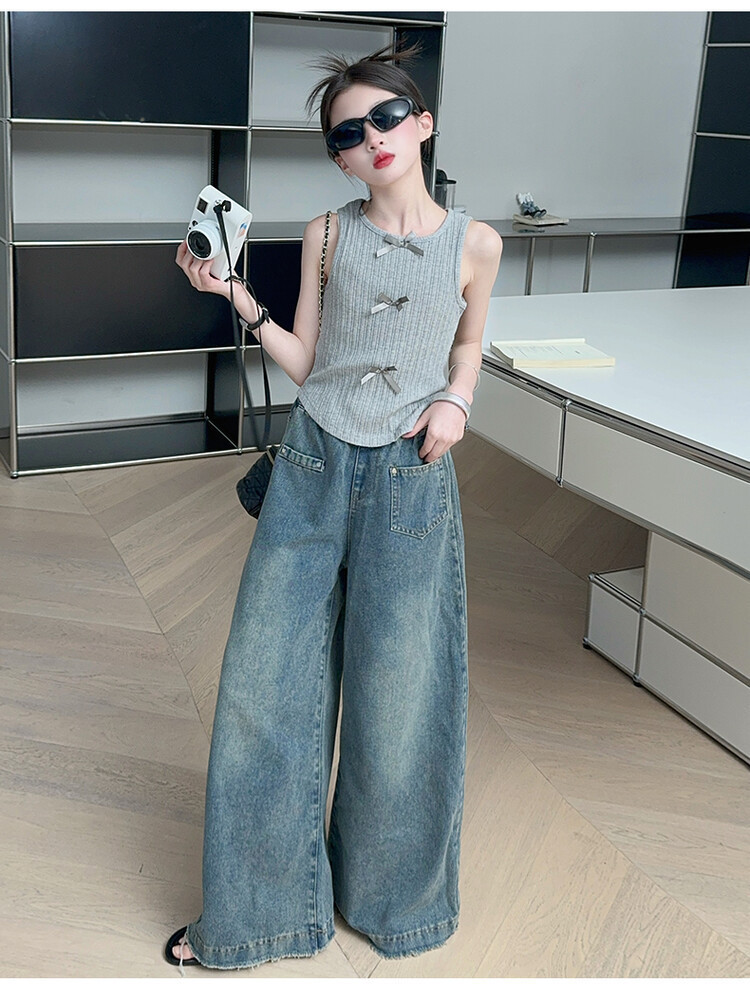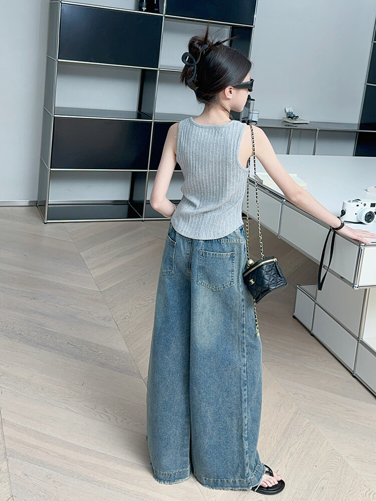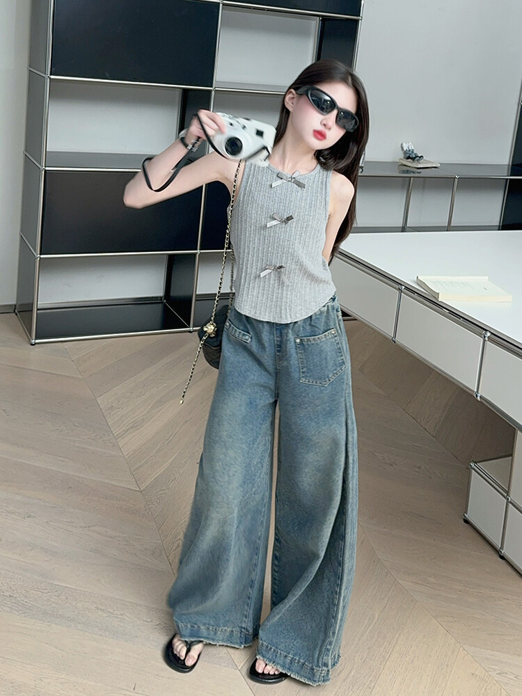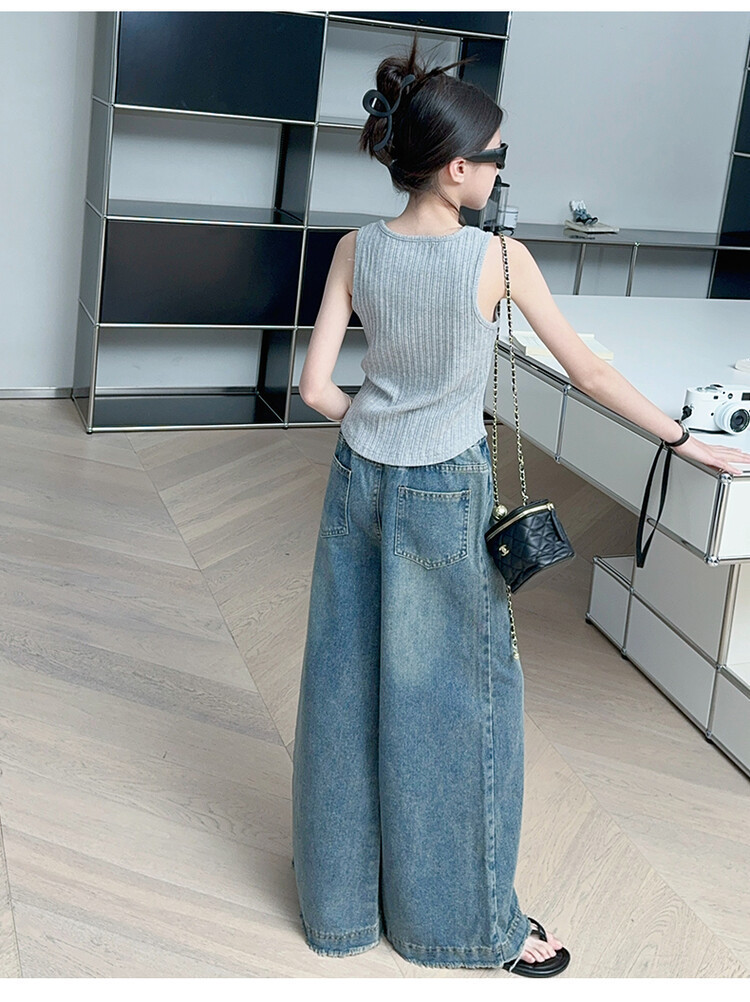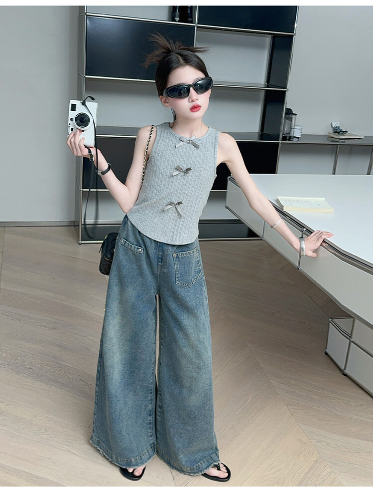 여자 세트 여름 조끼 데님 넓은 다리 바지 한국 스타일 유행 어린이 여름 패션 민소매 투피스 세트