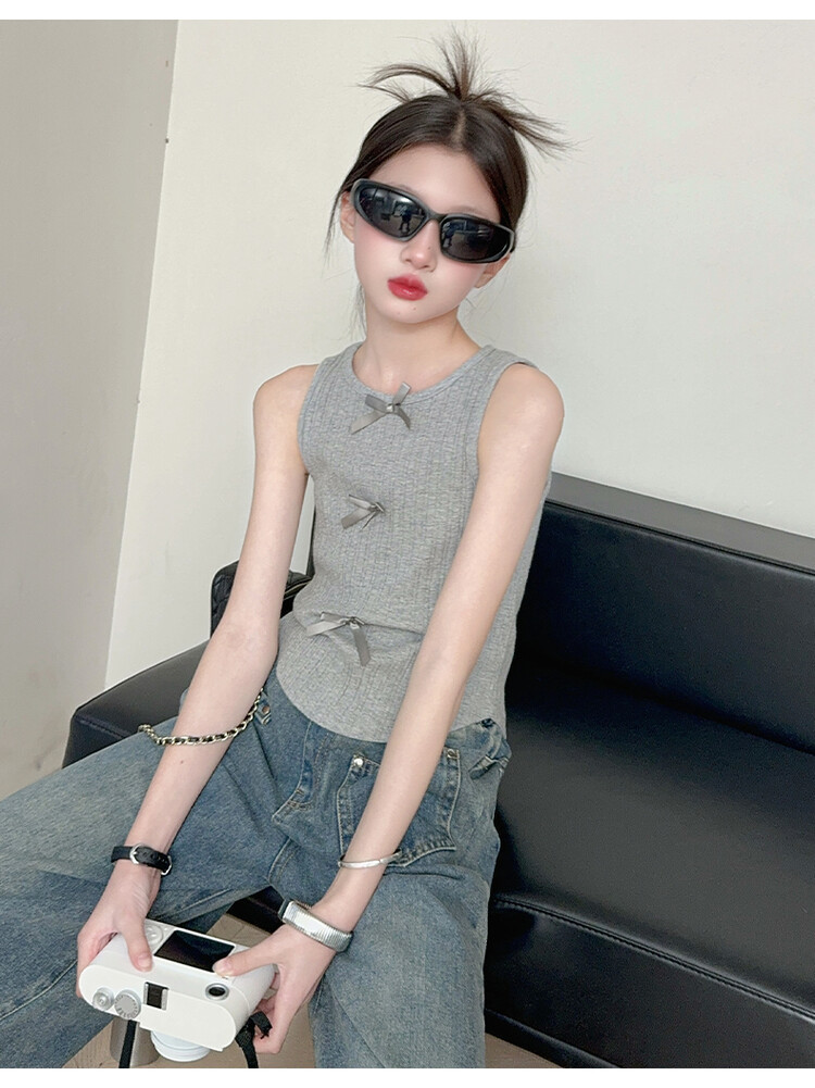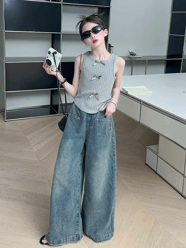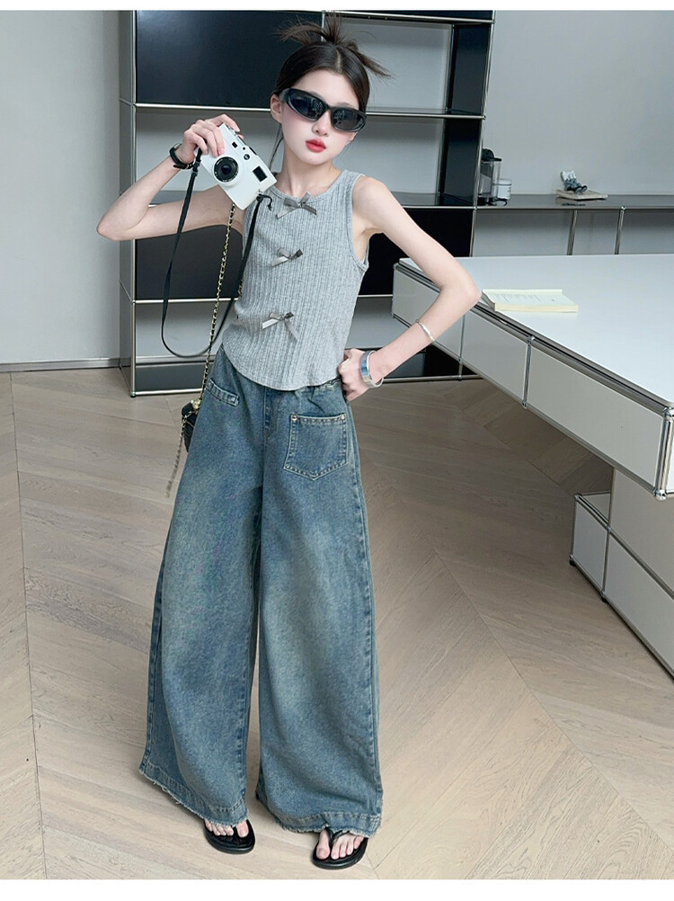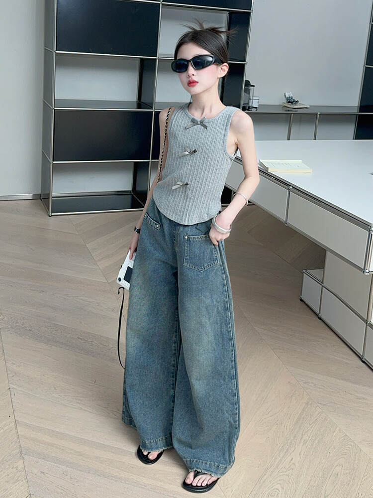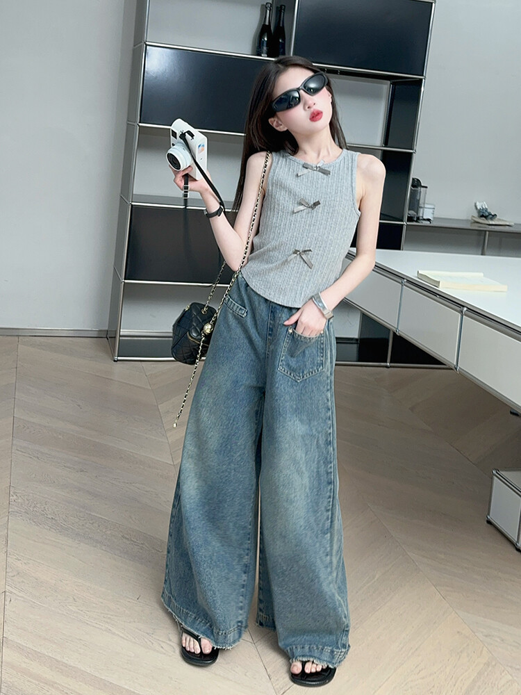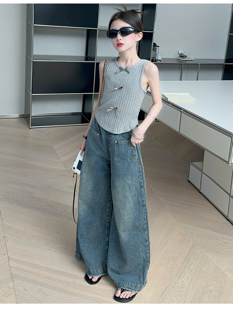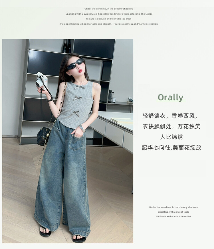 여자 세트 여름 조끼 데님 넓은 다리 바지 한국 스타일 유행 어린이 여름 패션 민소매 투피스 세트