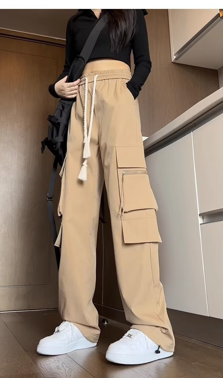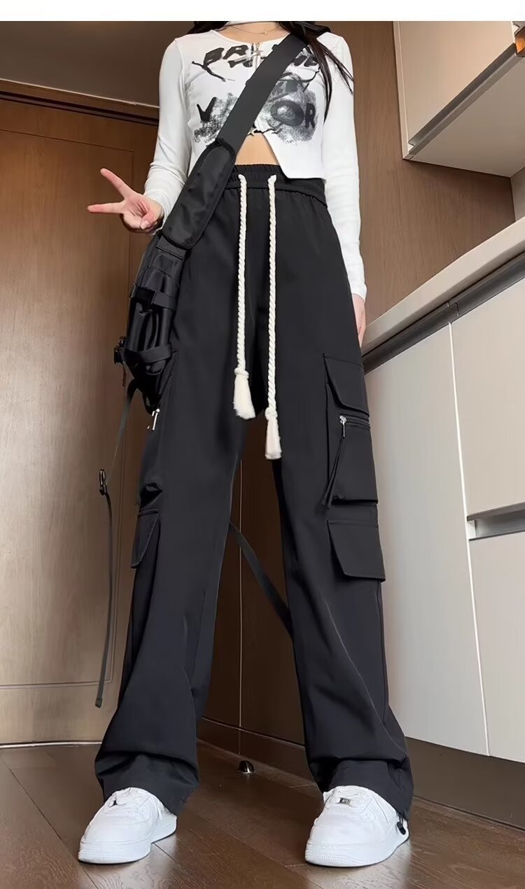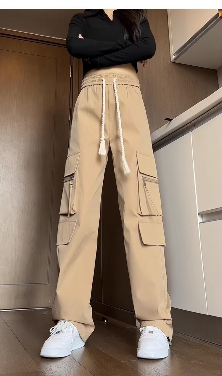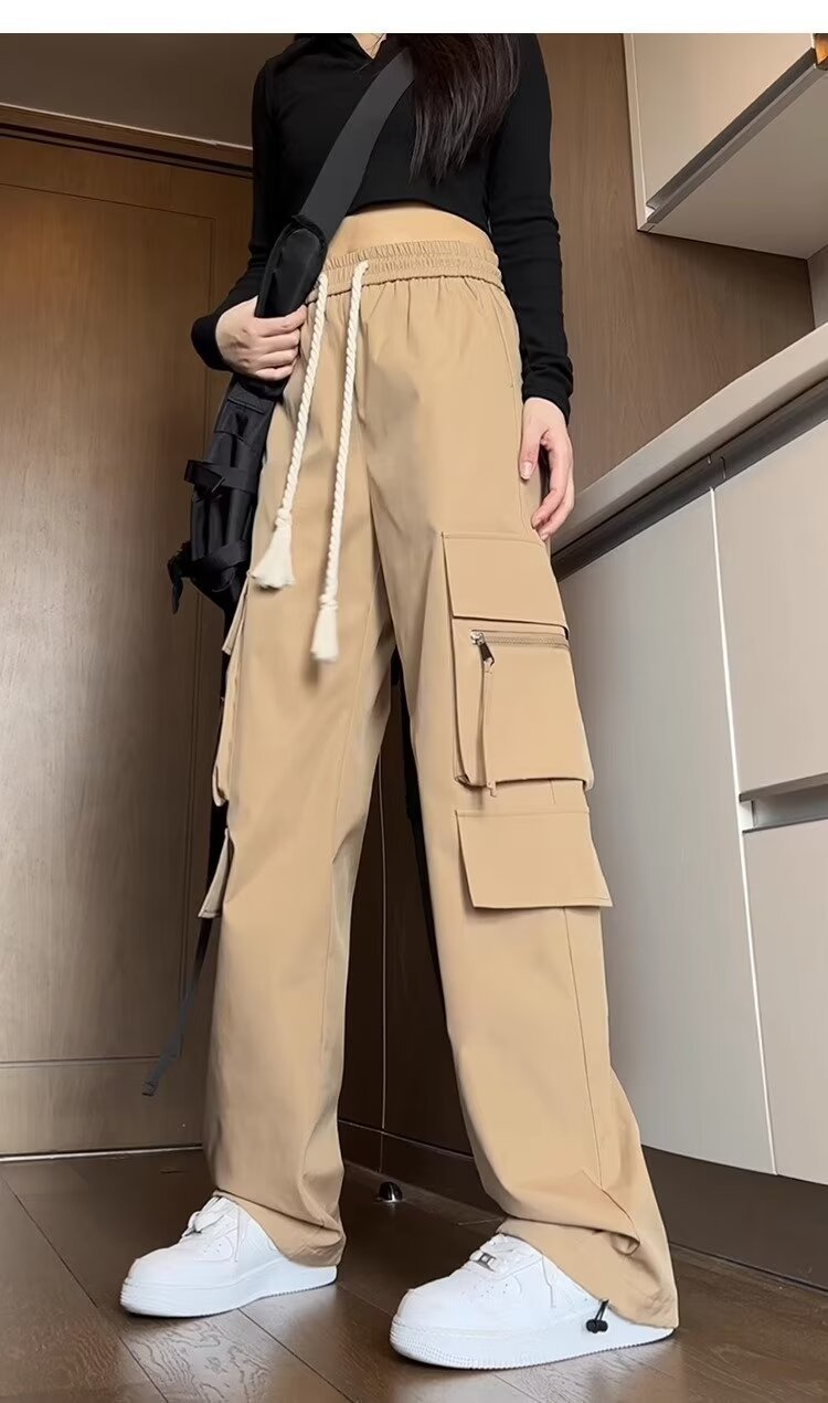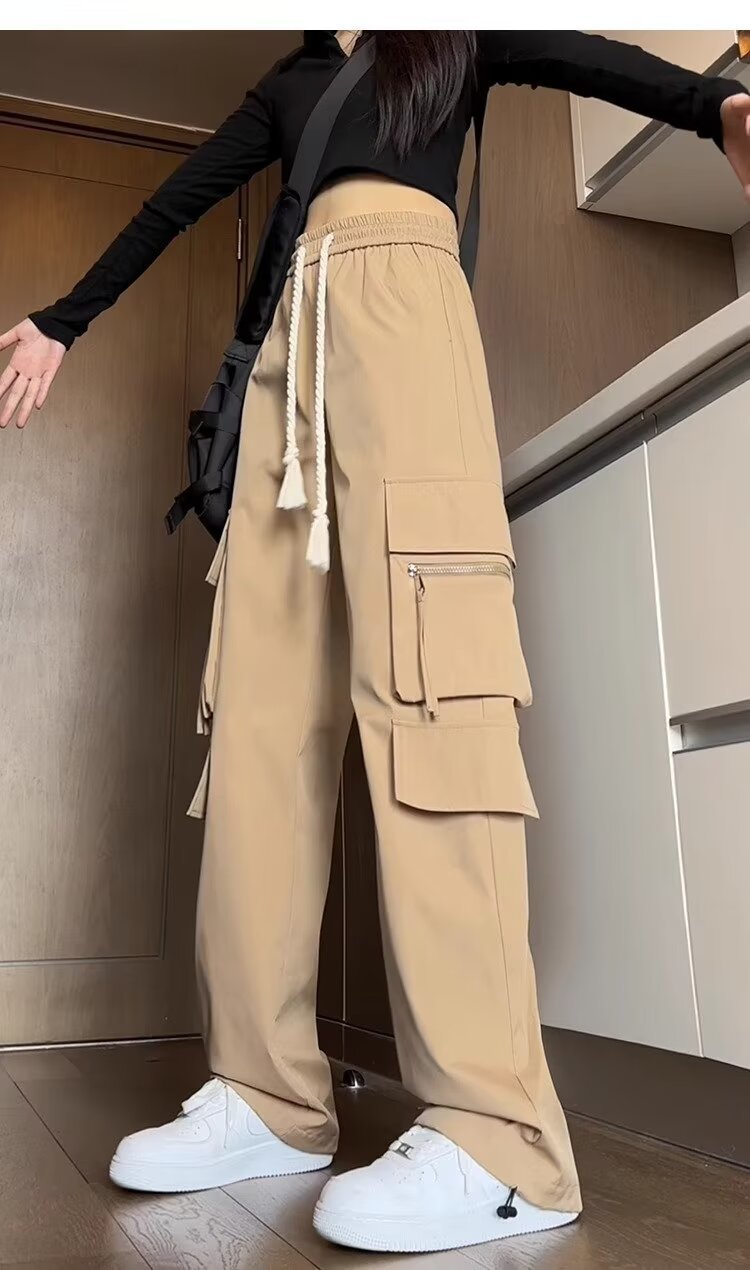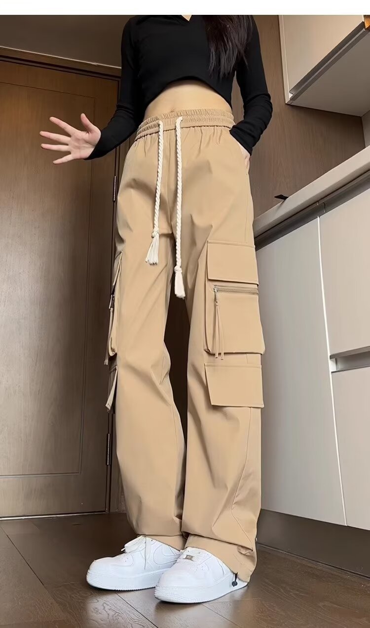 아메리칸 스타일 멀티 포켓 오버홀 여성의 2024 봄 새로운 느슨한 직선 슬리밍 하이 스트리트 와이드 다리 충전 긴 바지