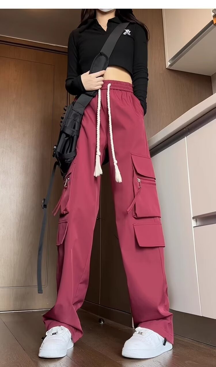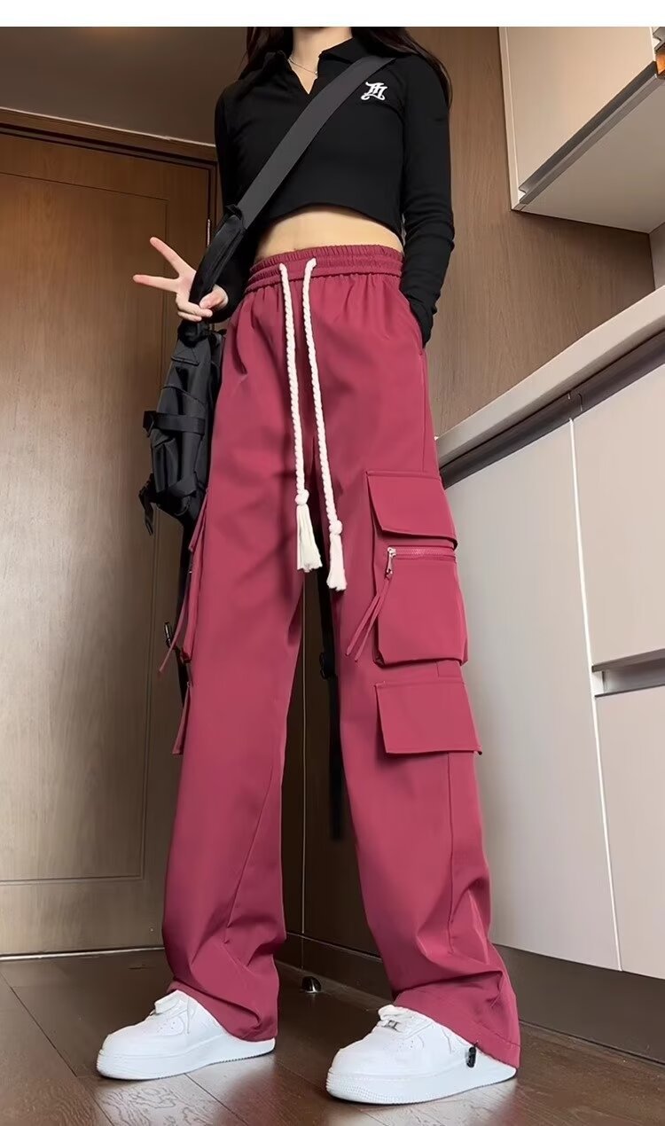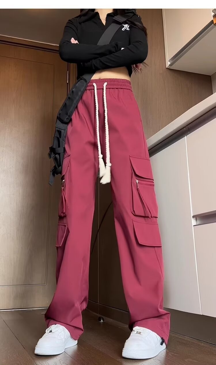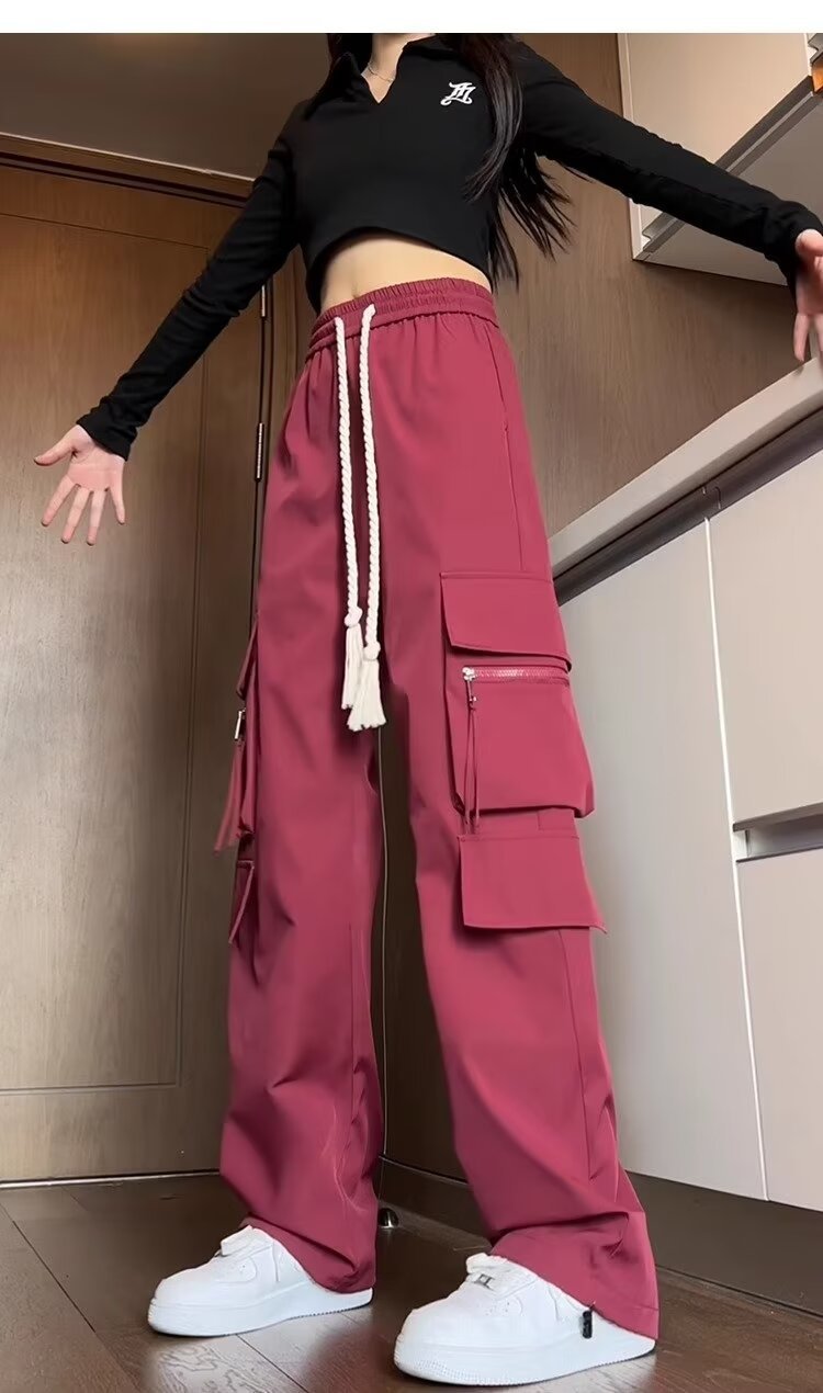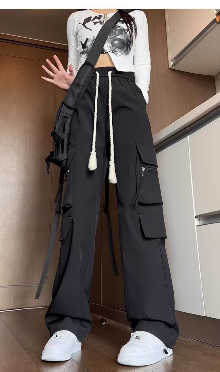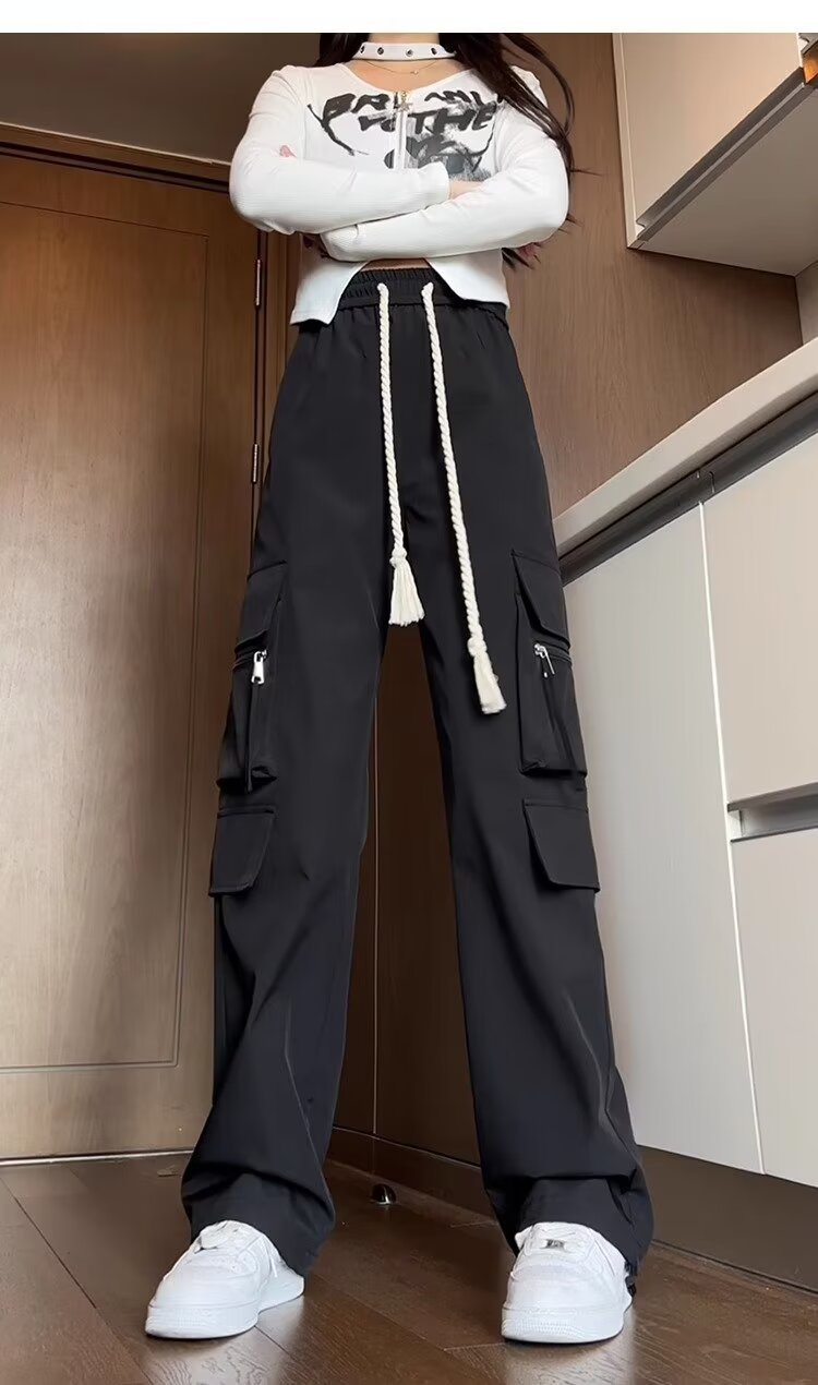 아메리칸 스타일 멀티 포켓 오버홀 여성의 2024 봄 새로운 느슨한 직선 슬리밍 하이 스트리트 와이드 다리 충전 긴 바지