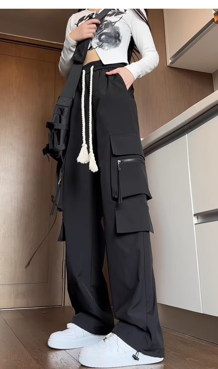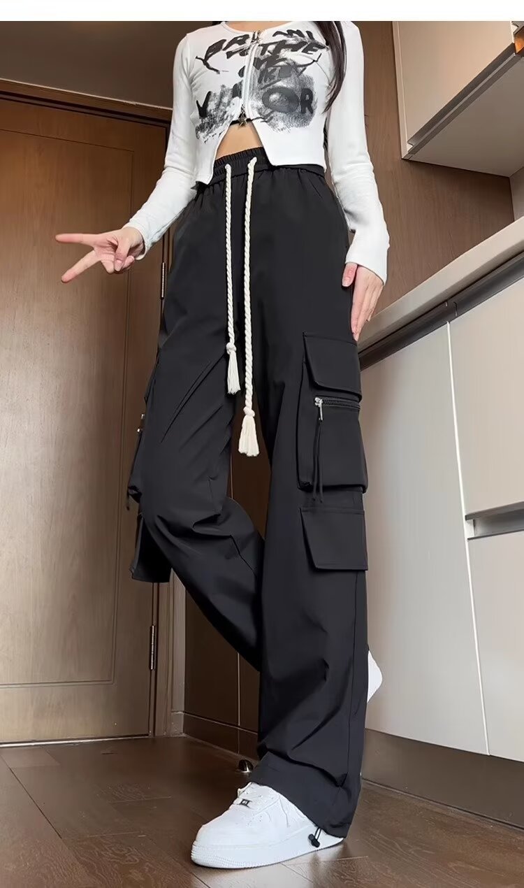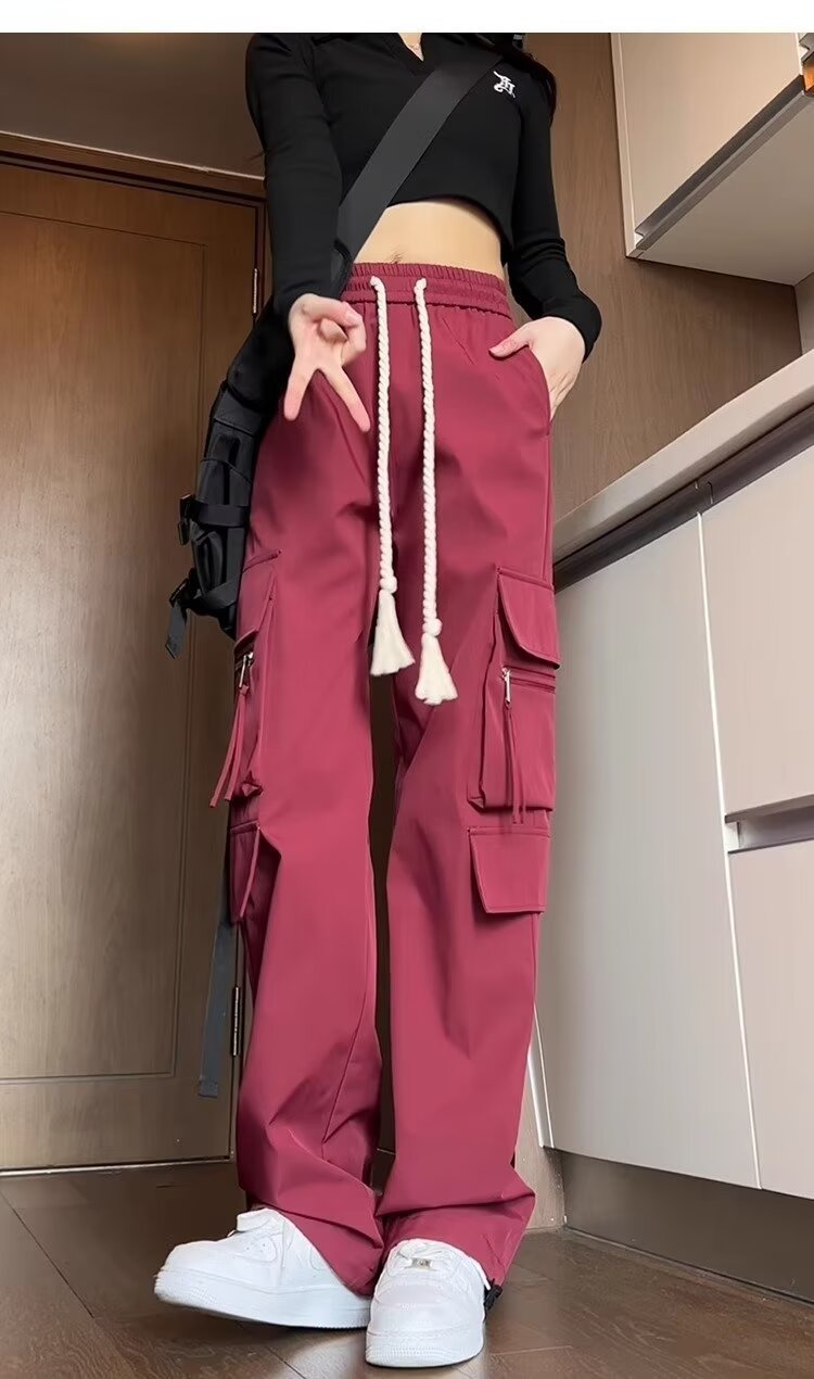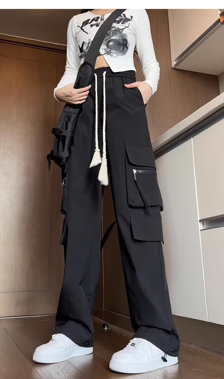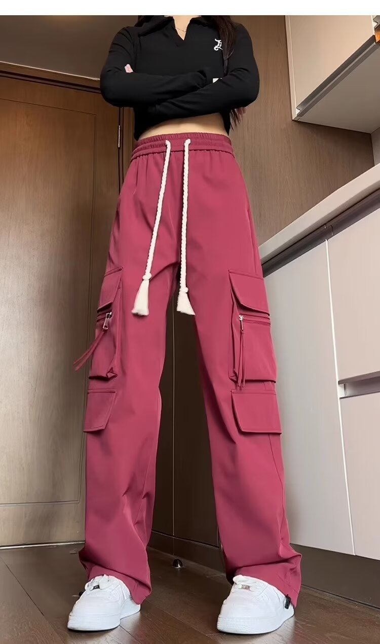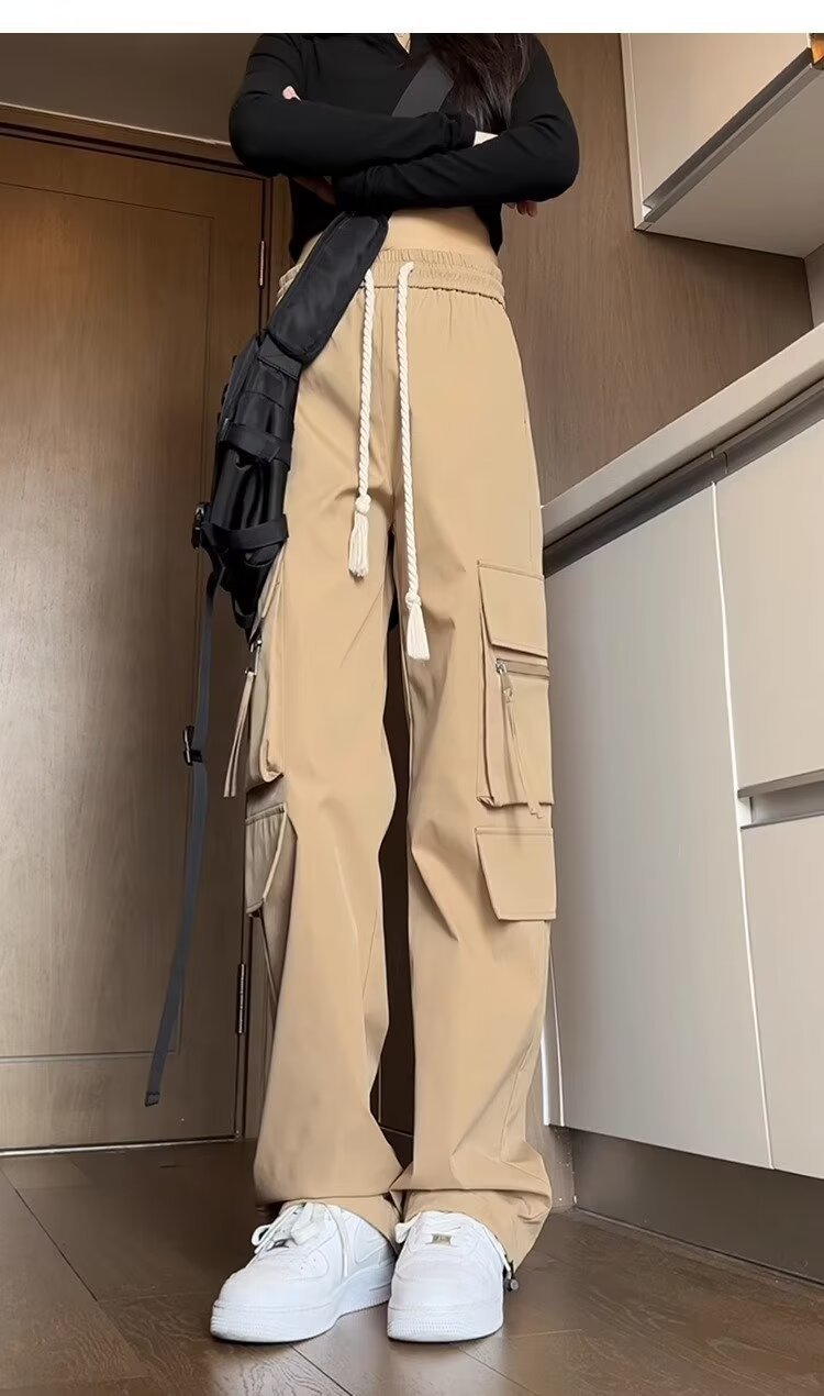 아메리칸 스타일 멀티 포켓 오버홀 여성의 2024 봄 새로운 느슨한 직선 슬리밍 하이 스트리트 와이드 다리 충전 긴 바지
