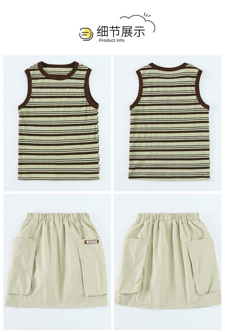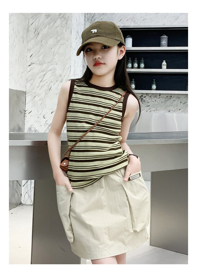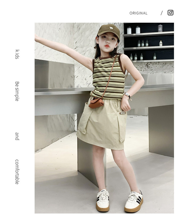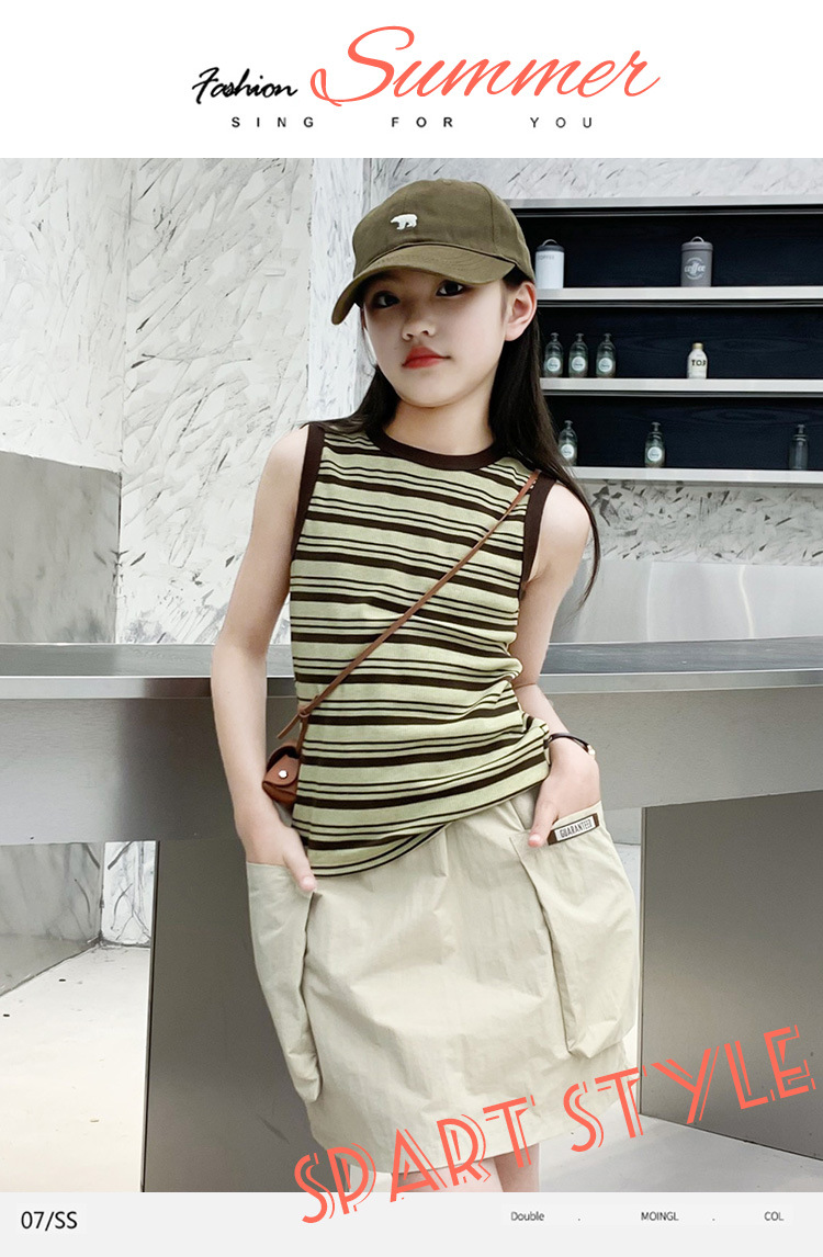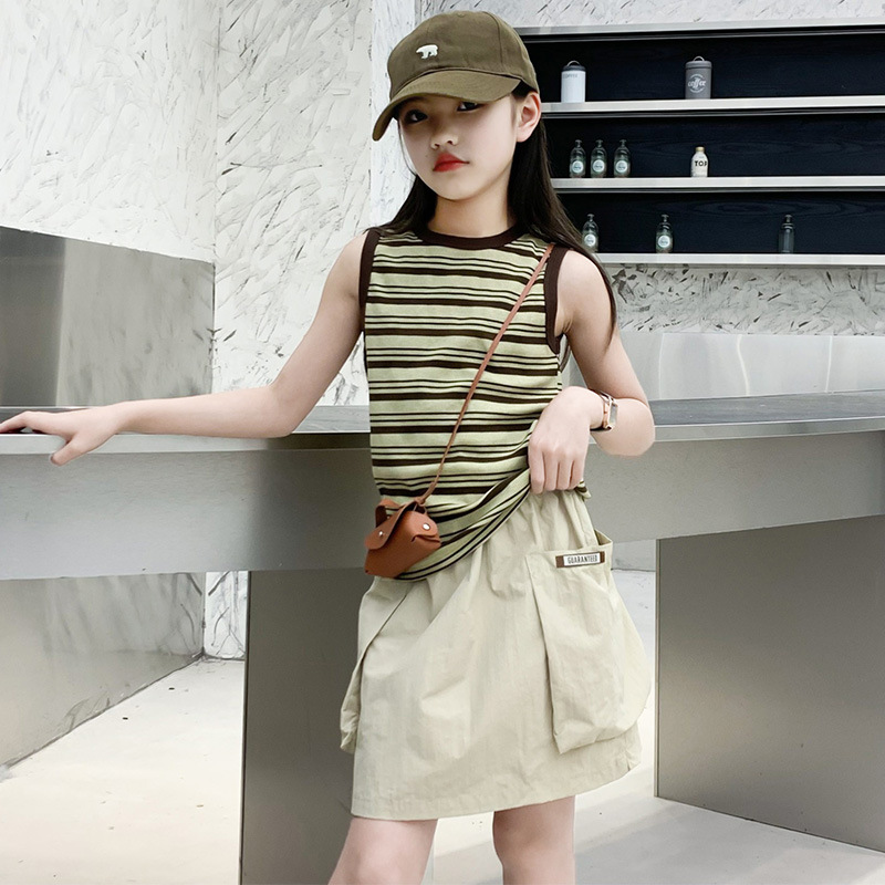 소녀 세트 여름 새로운 2024 중 큰 어린이 패션 폭발 줄무늬 니트 조끼 어린이 캐주얼 작업복 스커트스토어 가기