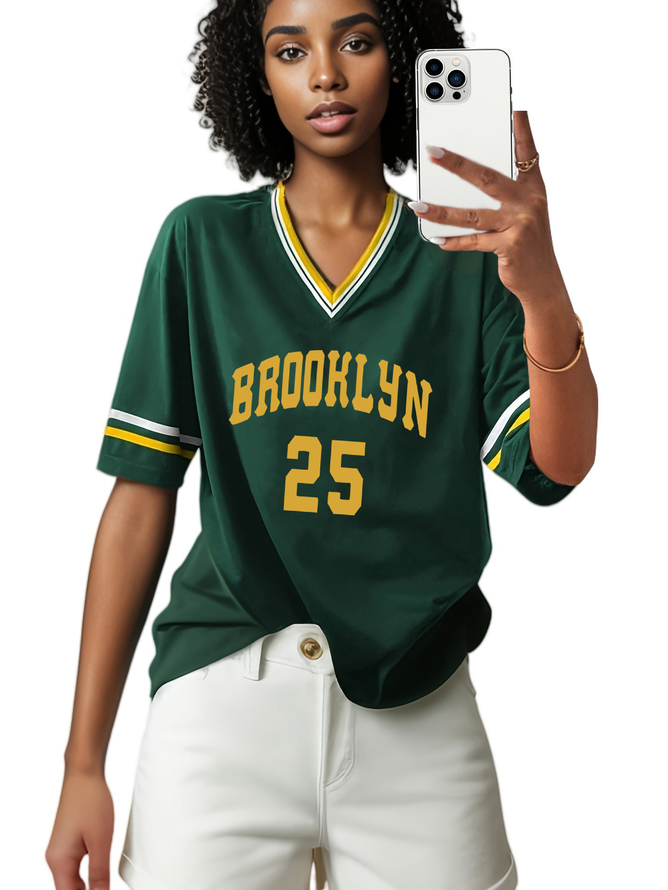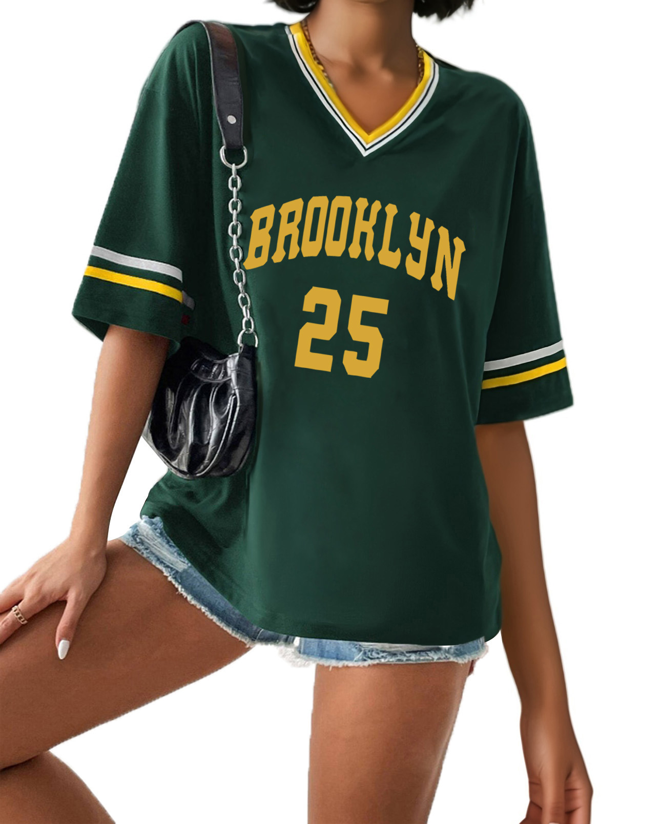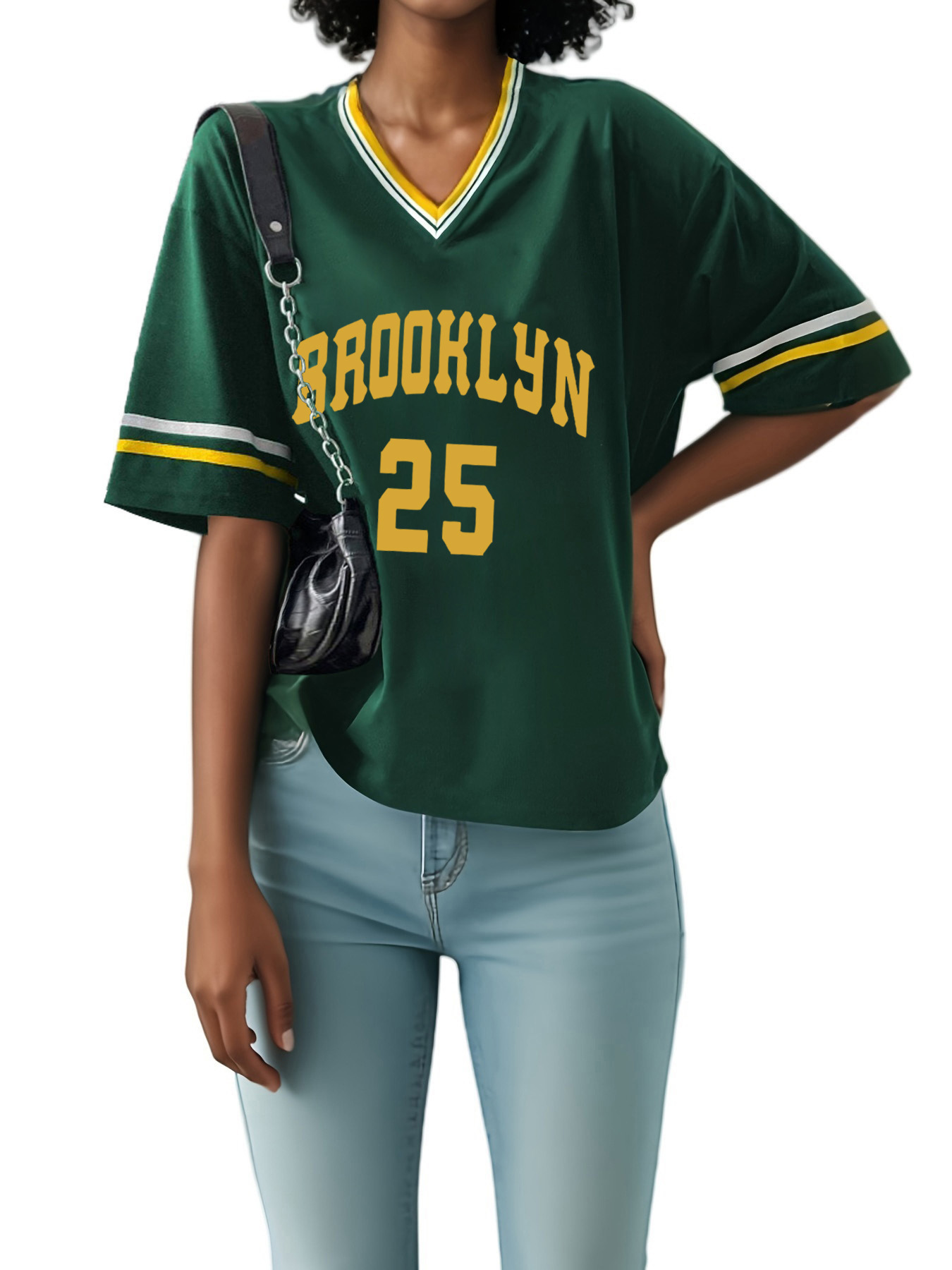 스트라이프 트림 V 넥 리본 반소매 루즈 티셔츠 여성 유럽 및 미국 스포츠 편지 인쇄 최고 국경 상품
