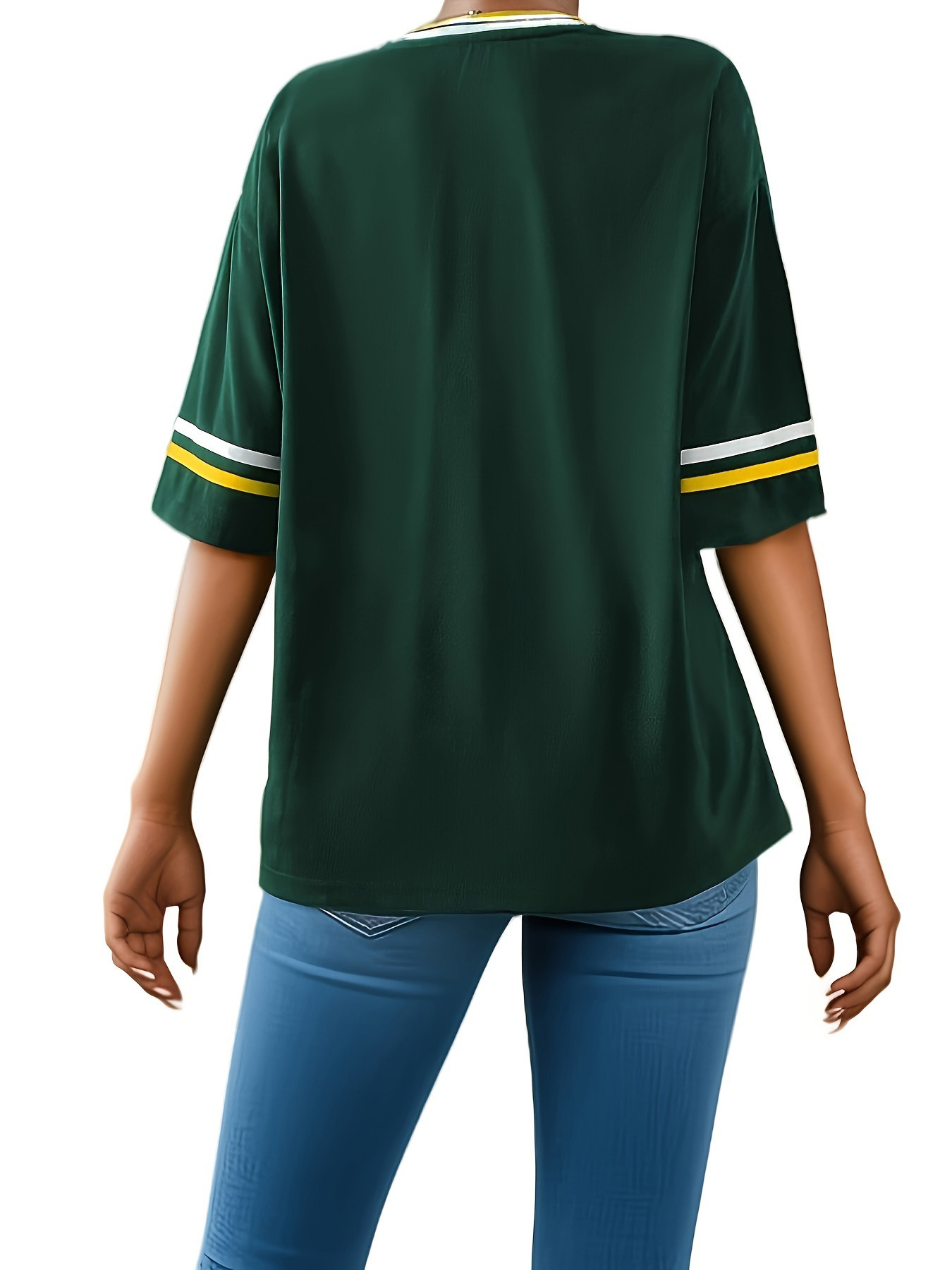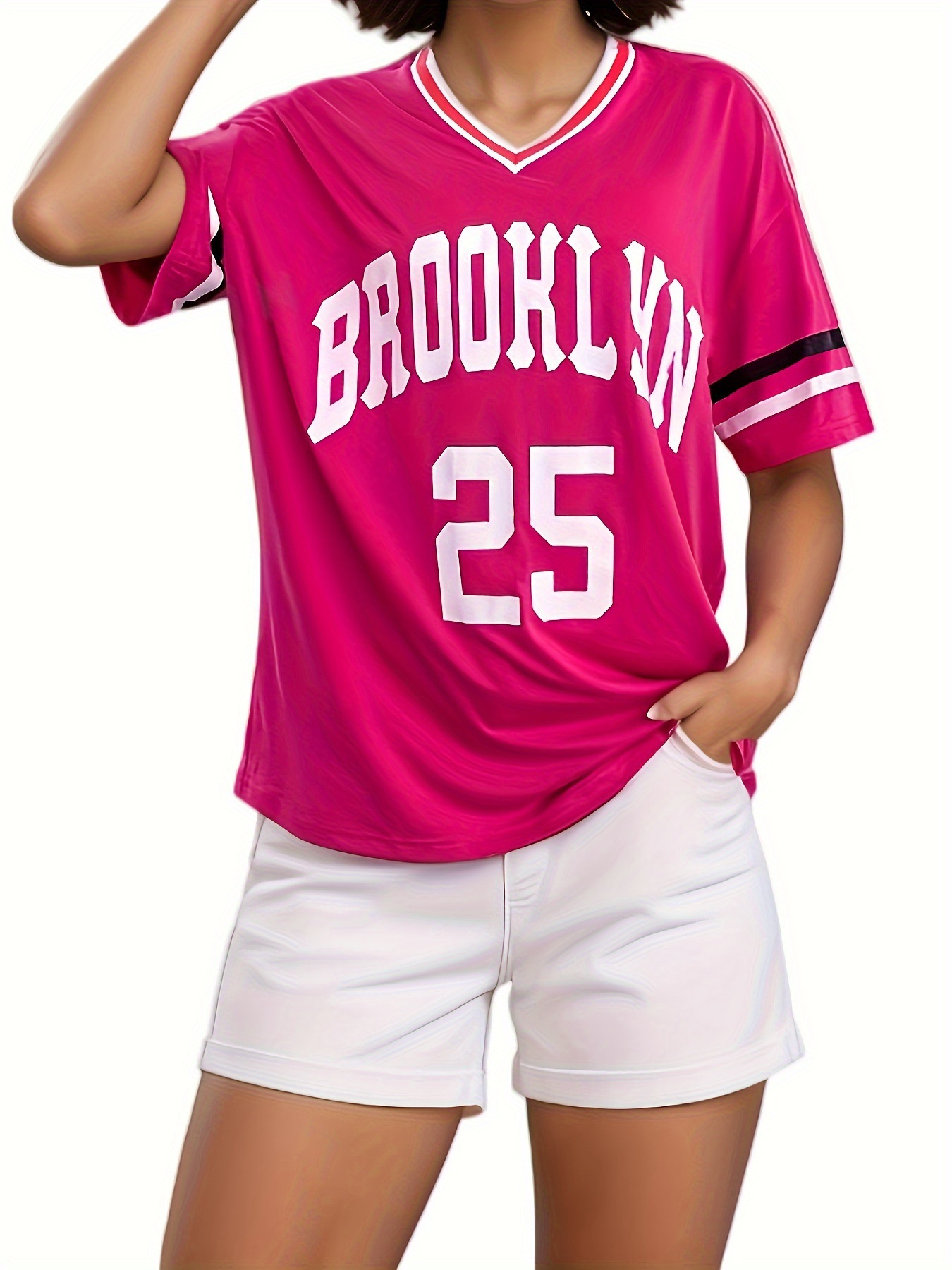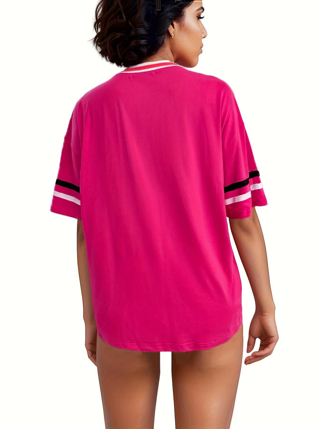 스트라이프 트림 V 넥 리본 반소매 루즈 티셔츠 여성 유럽 및 미국 스포츠 편지 인쇄 최고 국경 상품스토어 가기