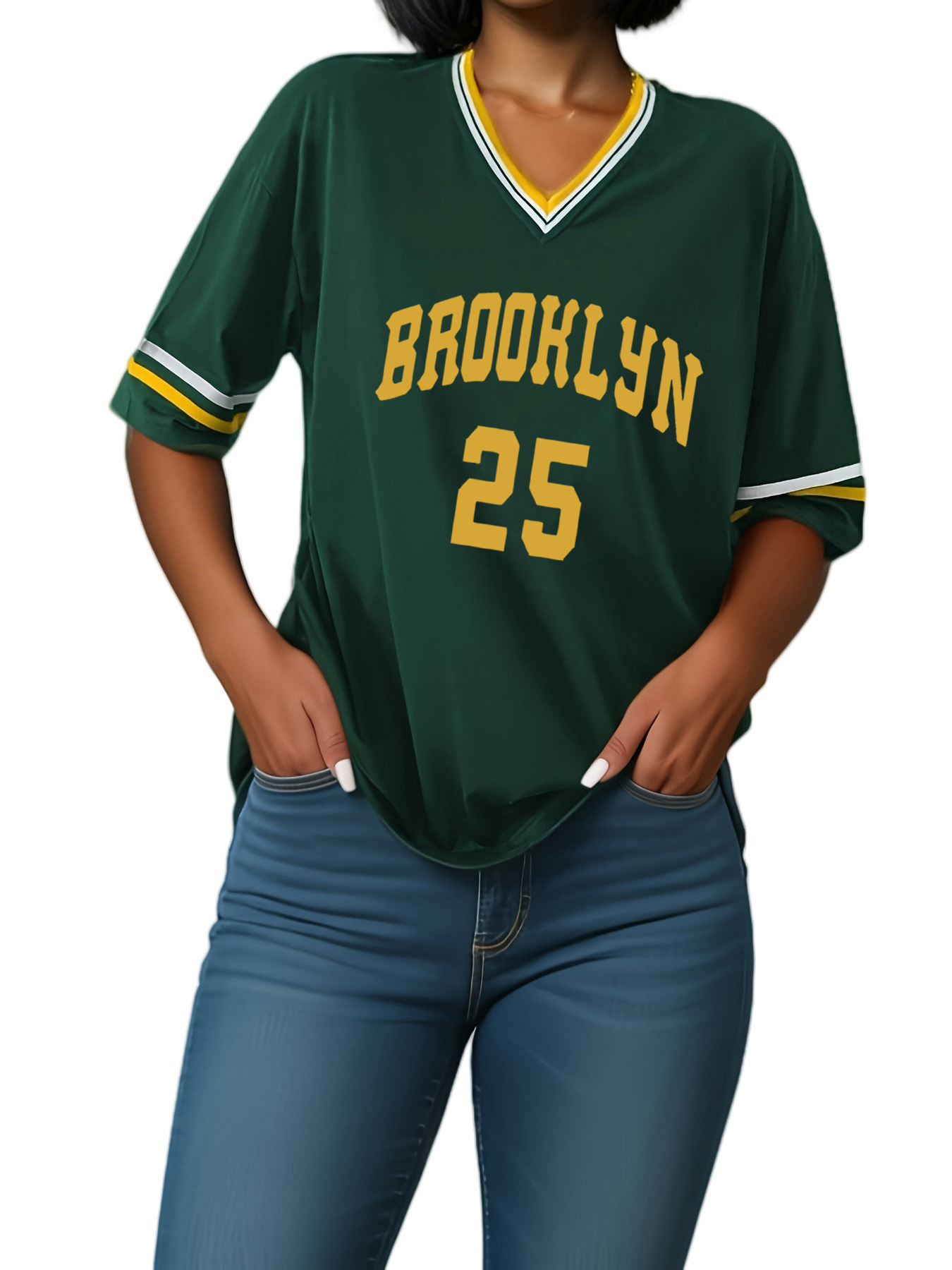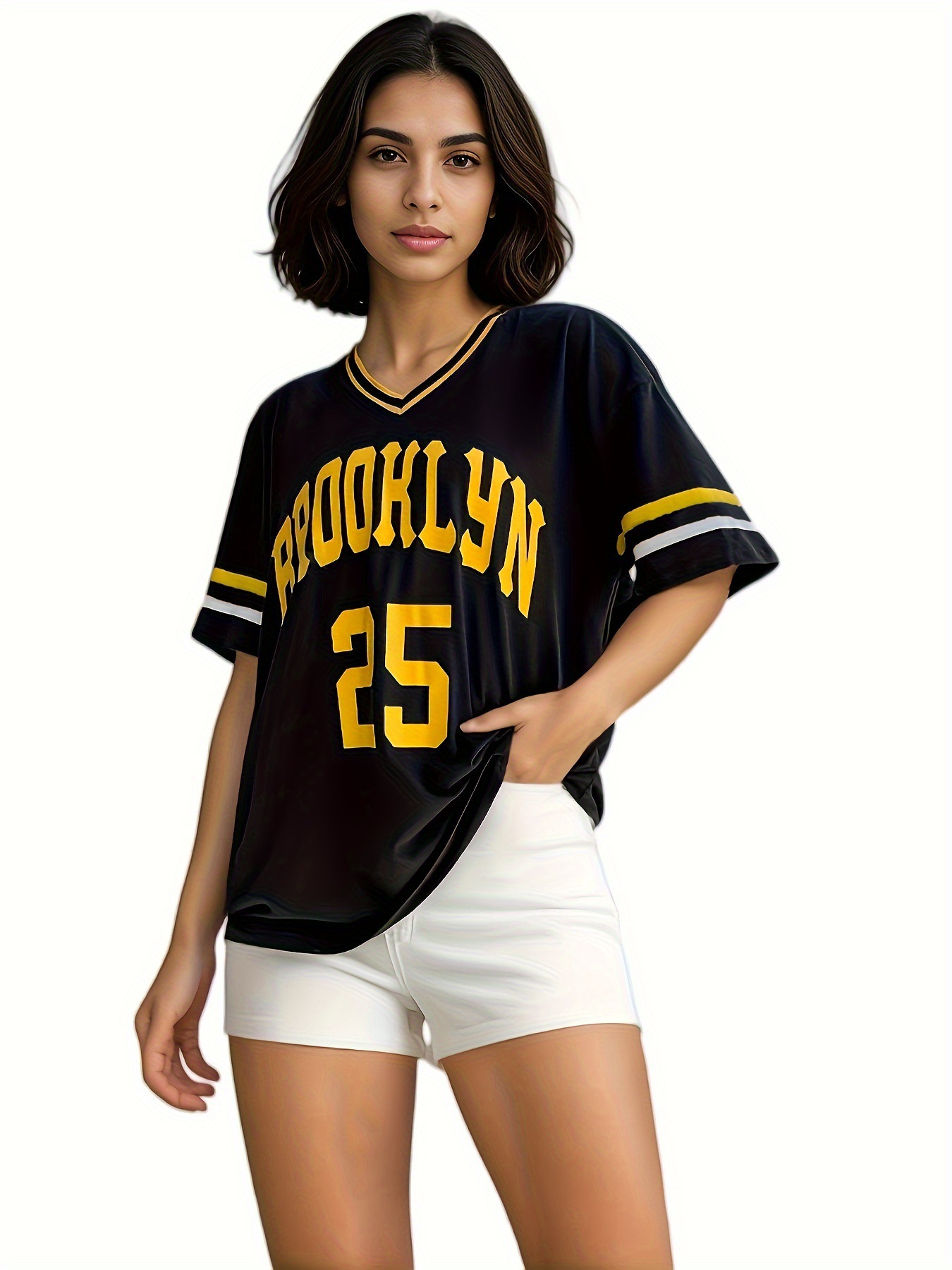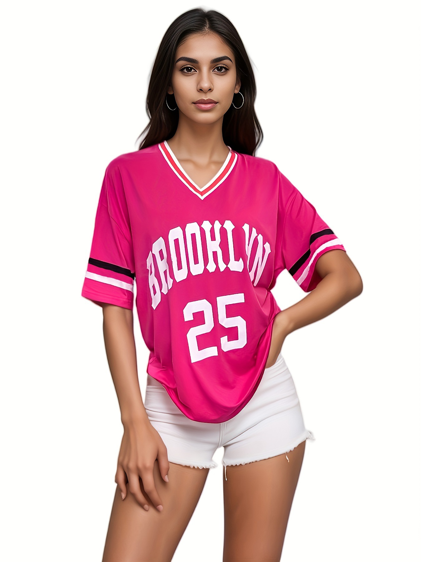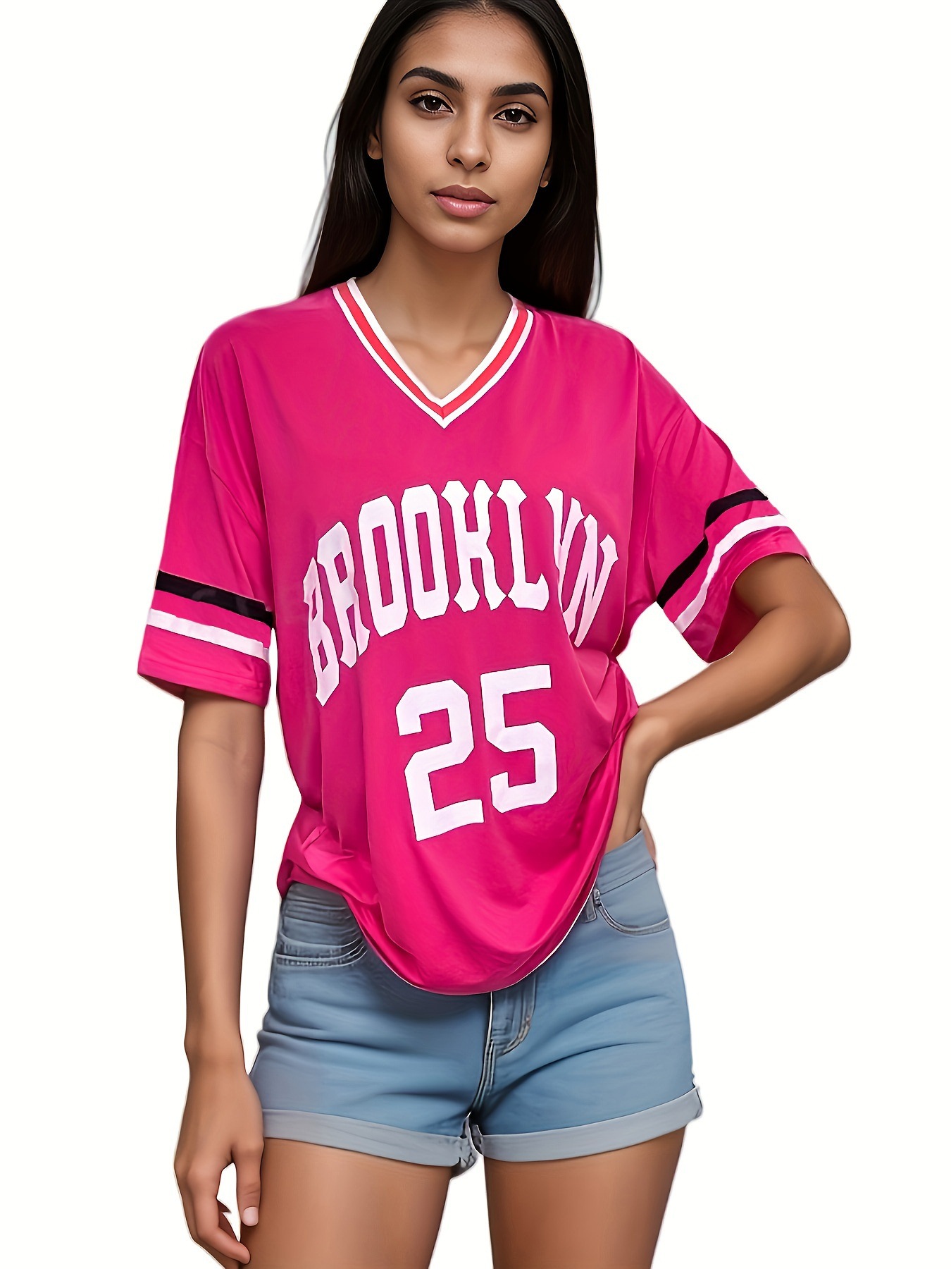 스트라이프 트림 V 넥 리본 반소매 루즈 티셔츠 여성 유럽 및 미국 스포츠 편지 인쇄 최고 국경 상품스토어 가기