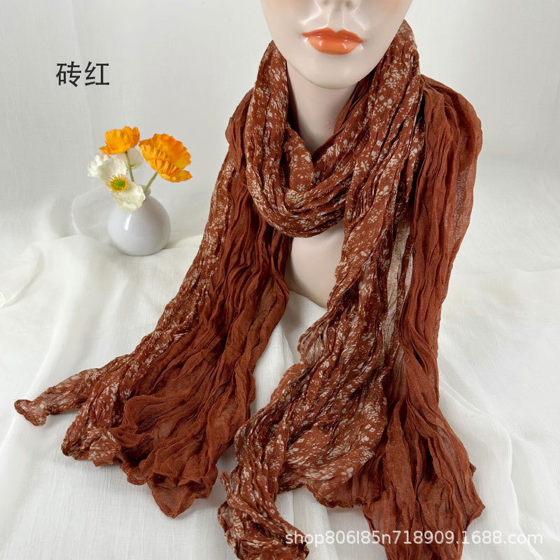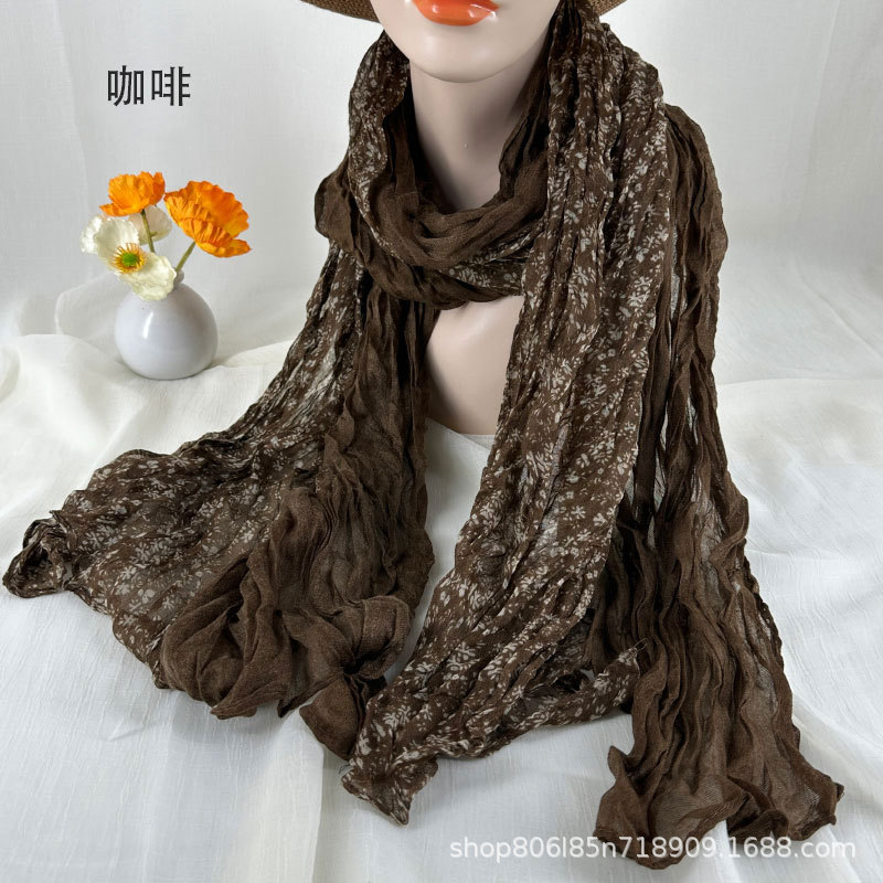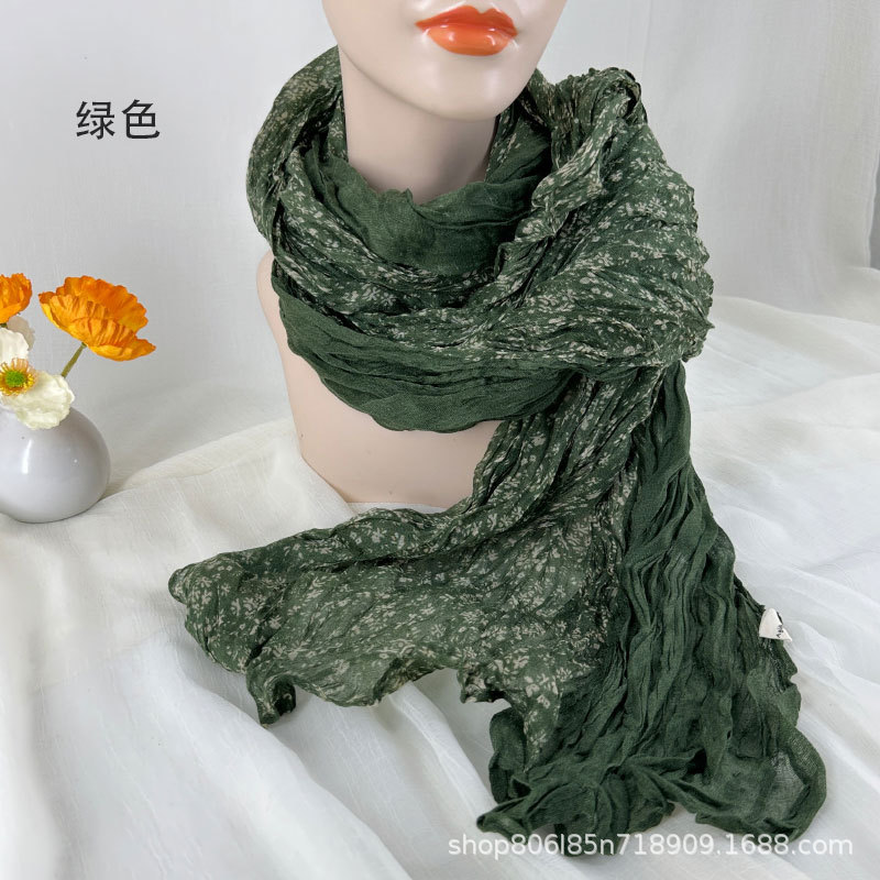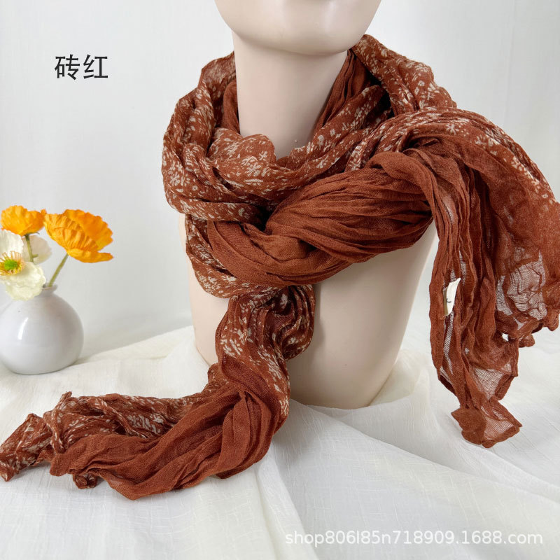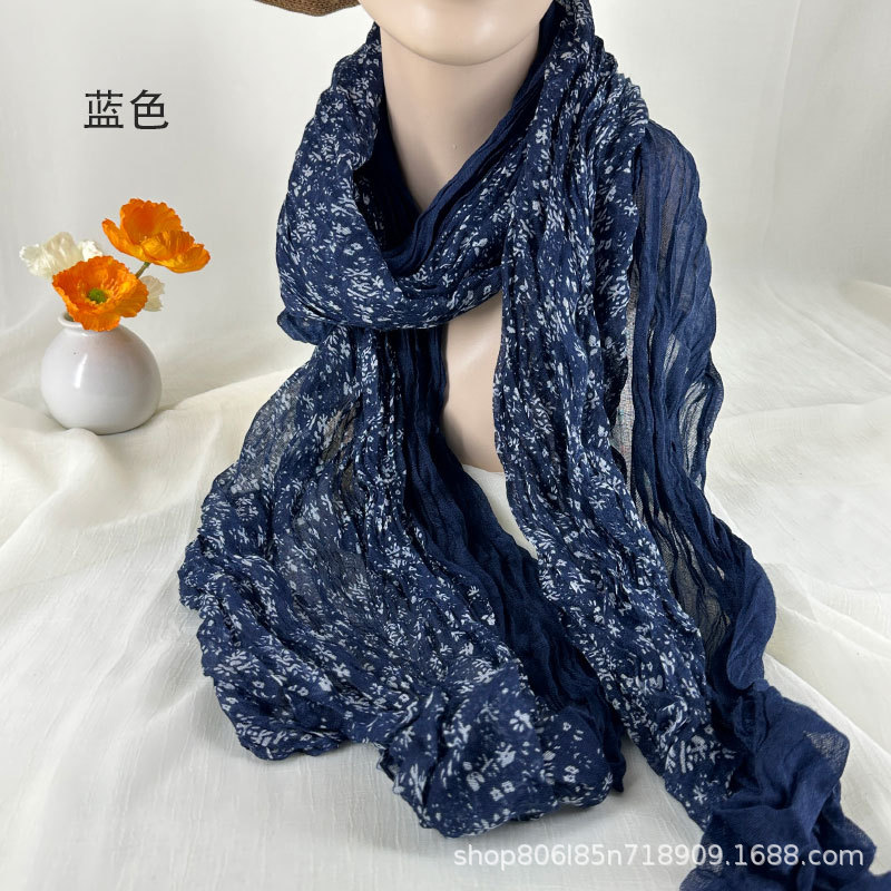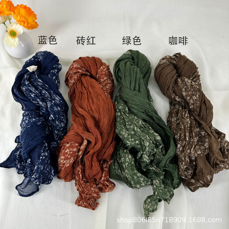 예술적 레트로 스카프 여성의 가을과 겨울 인쇄 얇은 주름 실크 스카프 구겨진 골동품 면 리넨 작은 꽃 패치 워크 목도리
