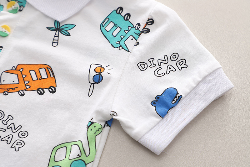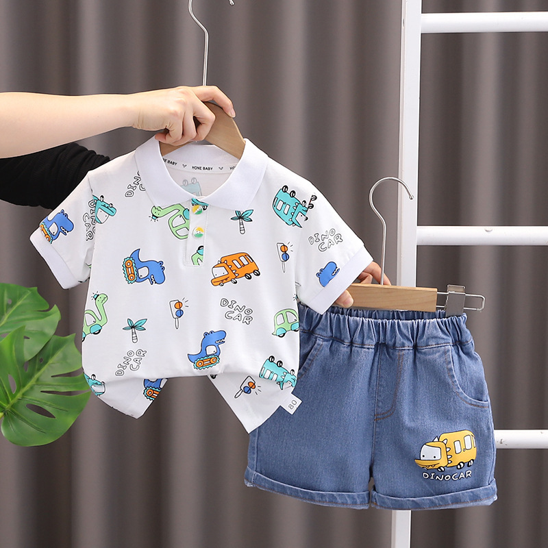 소년 2024 외국 스타일 새로운 여름 캐주얼 세트 소년 아기 공룡 자동차 얇은 여름 짧은 소매 도매