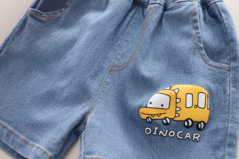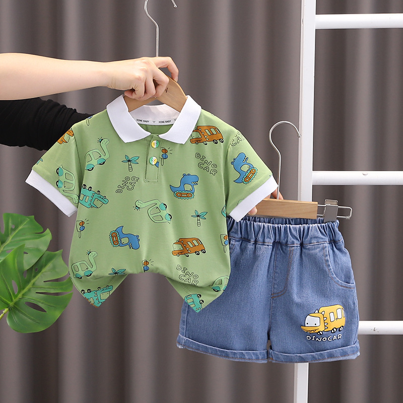 소년 2024 외국 스타일 새로운 여름 캐주얼 세트 소년 아기 공룡 자동차 얇은 여름 짧은 소매 도매스토어 가기