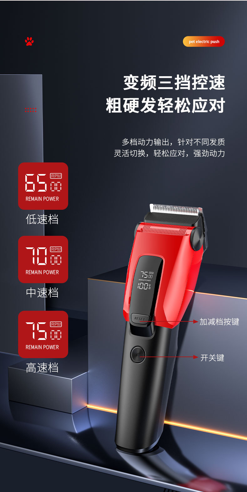 开关:轻触式电子开关,低速档,中速档,高速档 三档调节