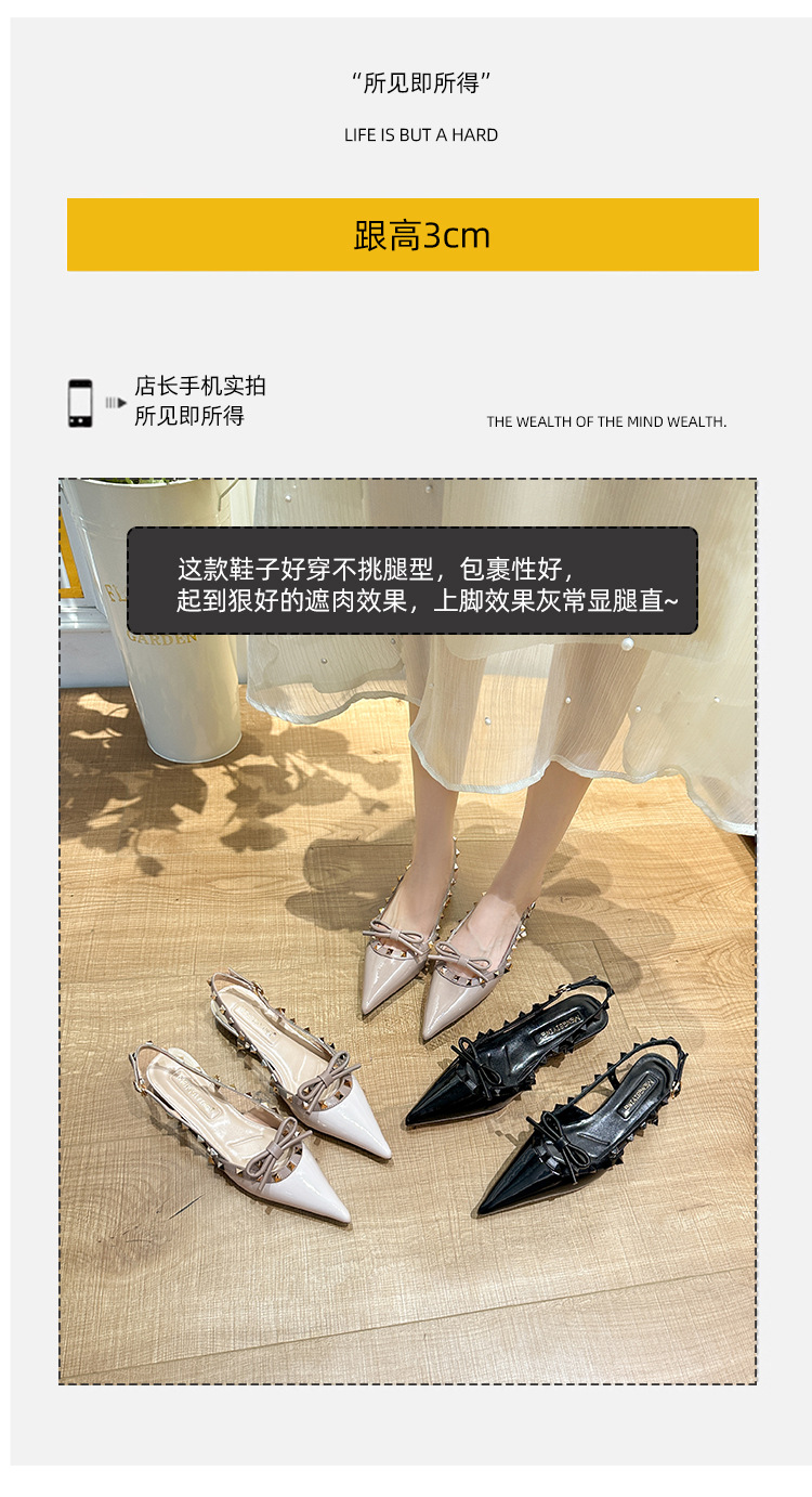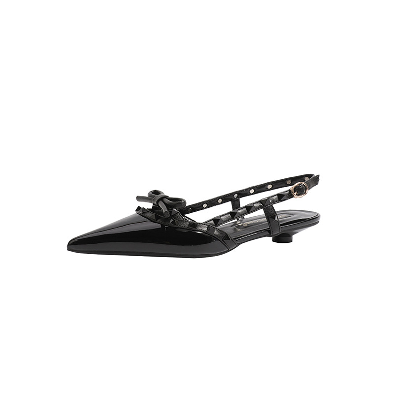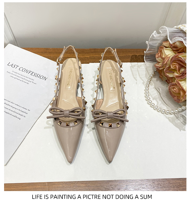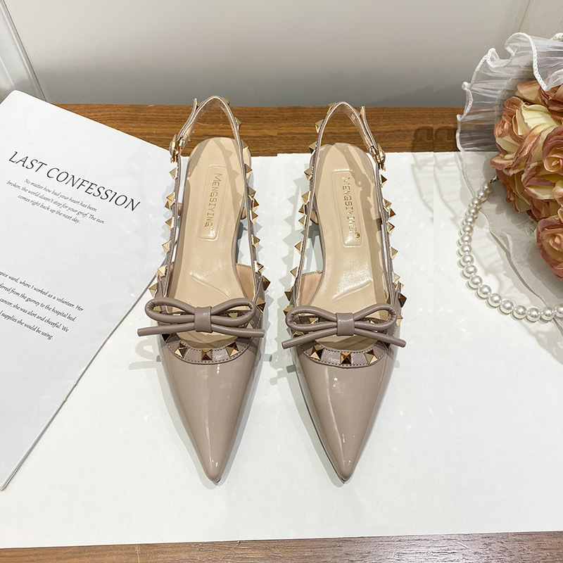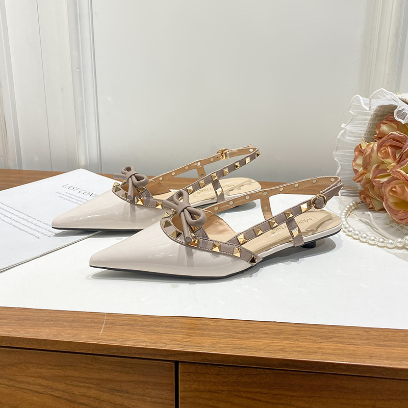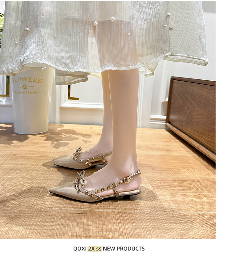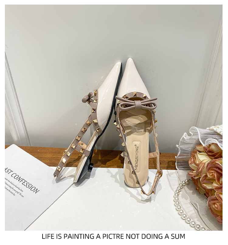 니치 보우 발가락 샌들 여성의 2024 년 봄과 여름 새로운 낮은 발 뒤꿈치 빈 프랑스 뾰족한 리벳 신발 여성