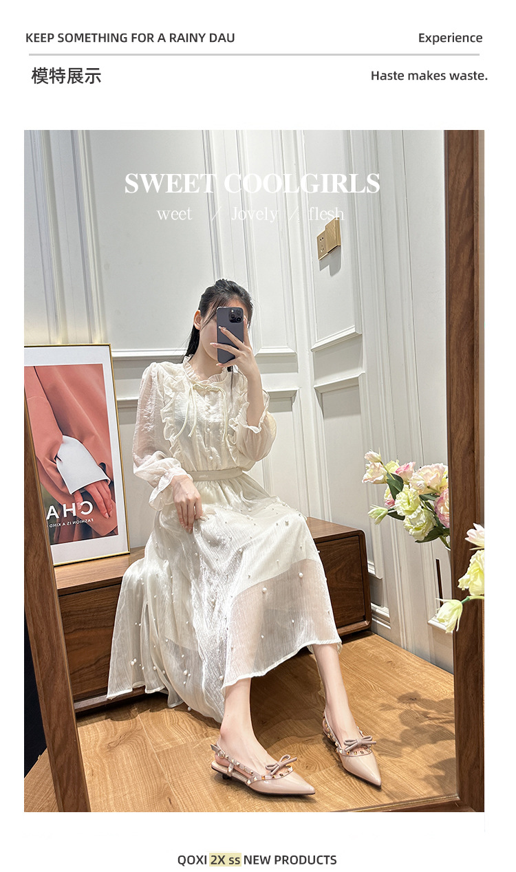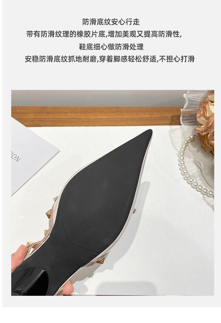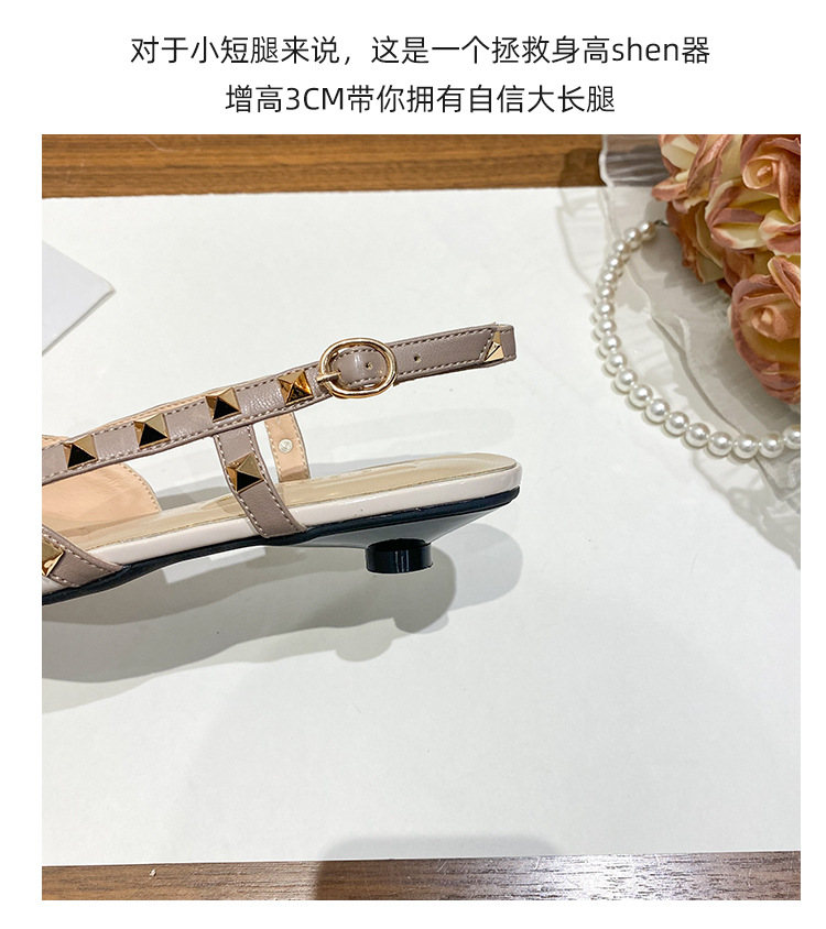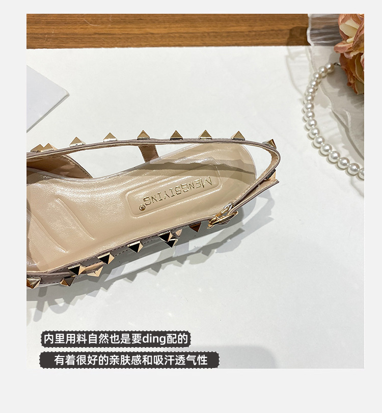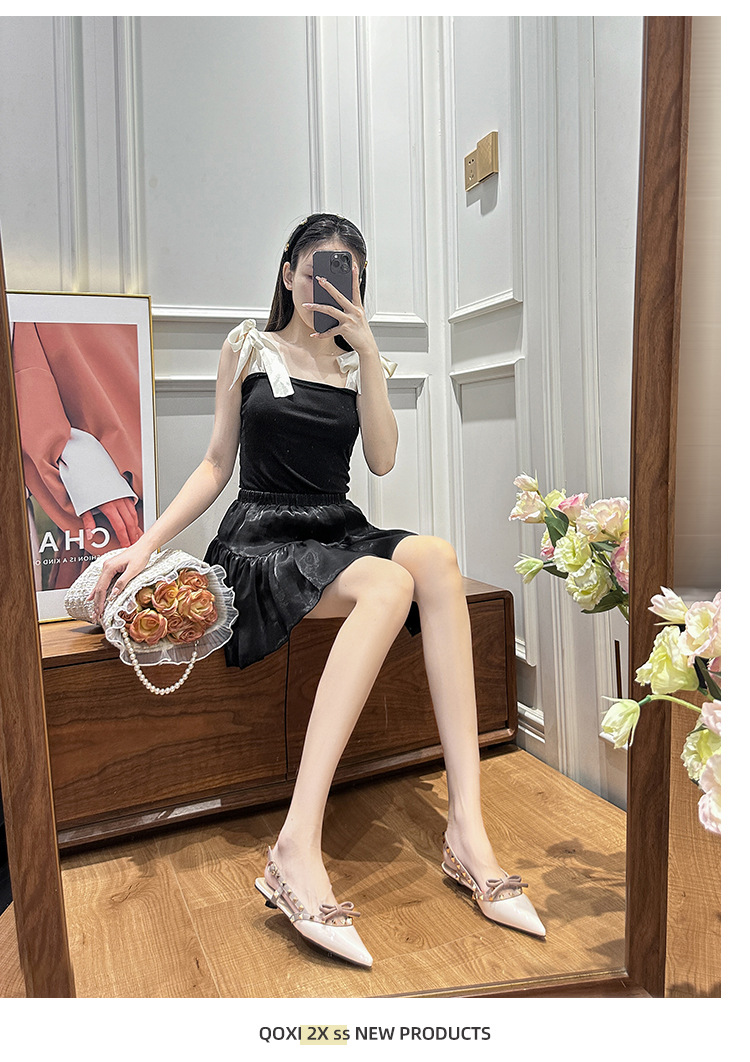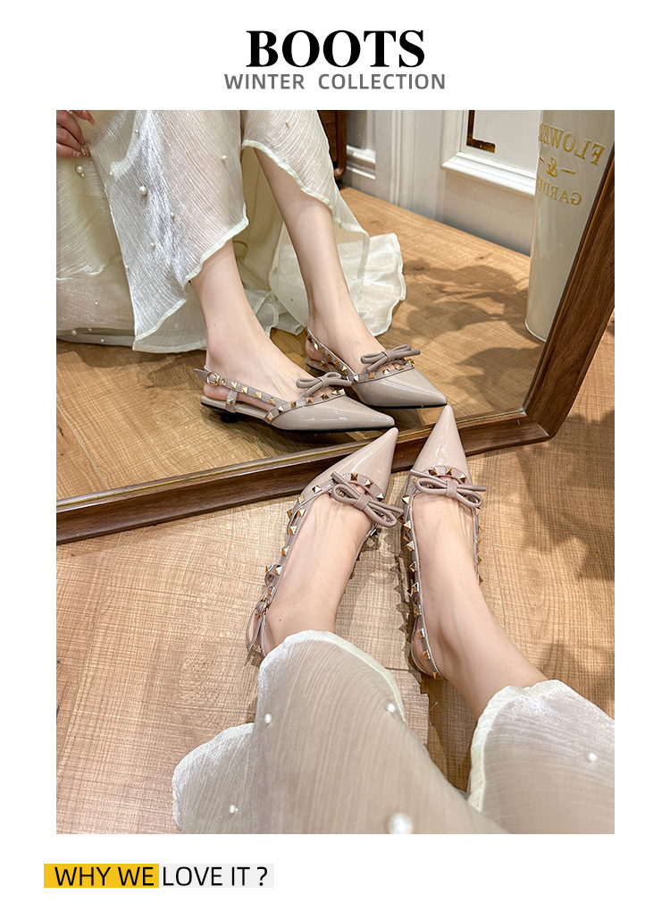 니치 보우 발가락 샌들 여성의 2024 년 봄과 여름 새로운 낮은 발 뒤꿈치 빈 프랑스 뾰족한 리벳 신발 여성