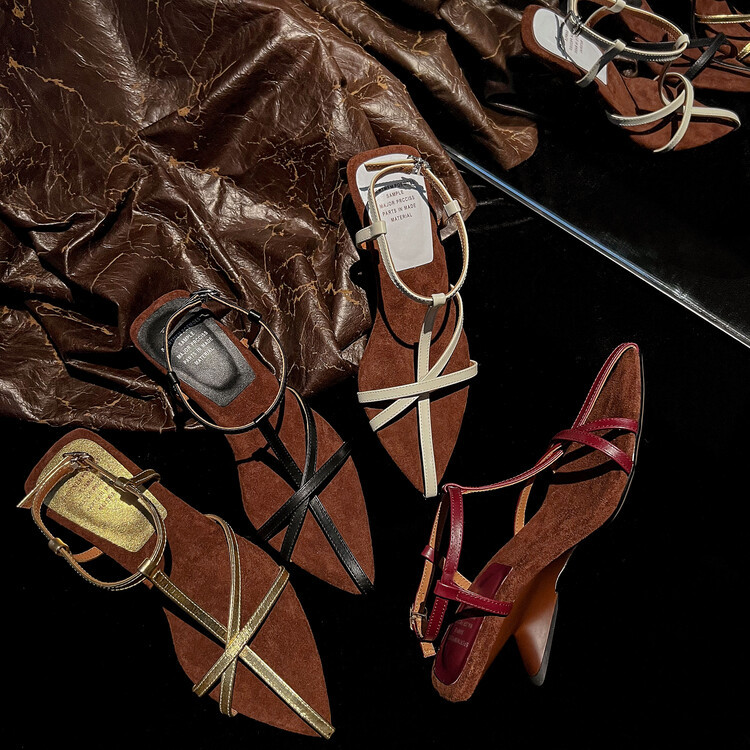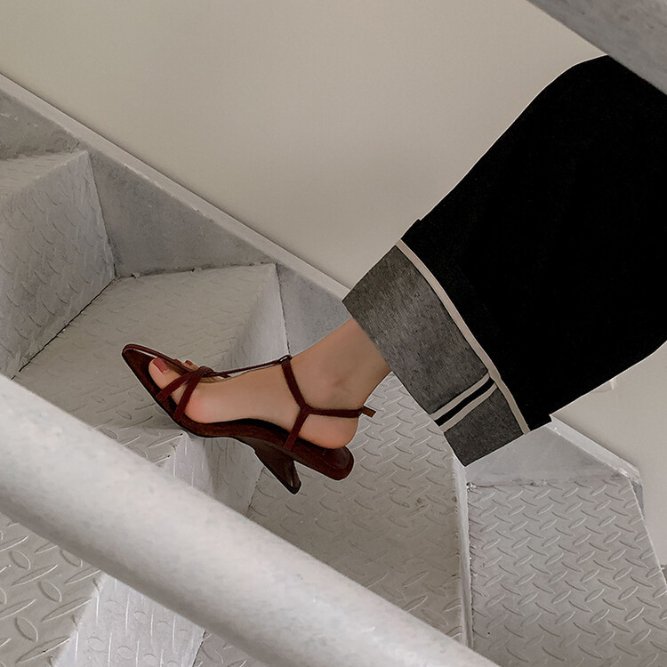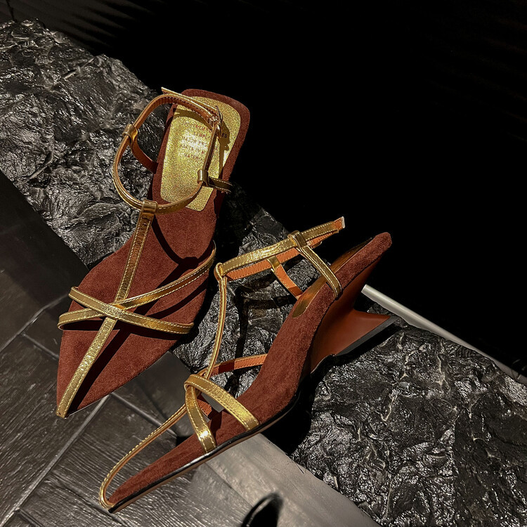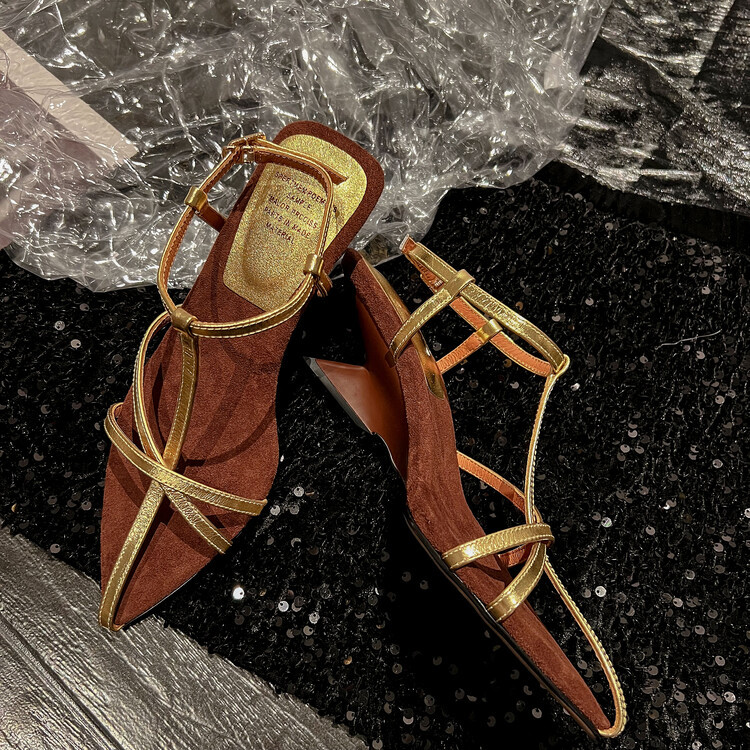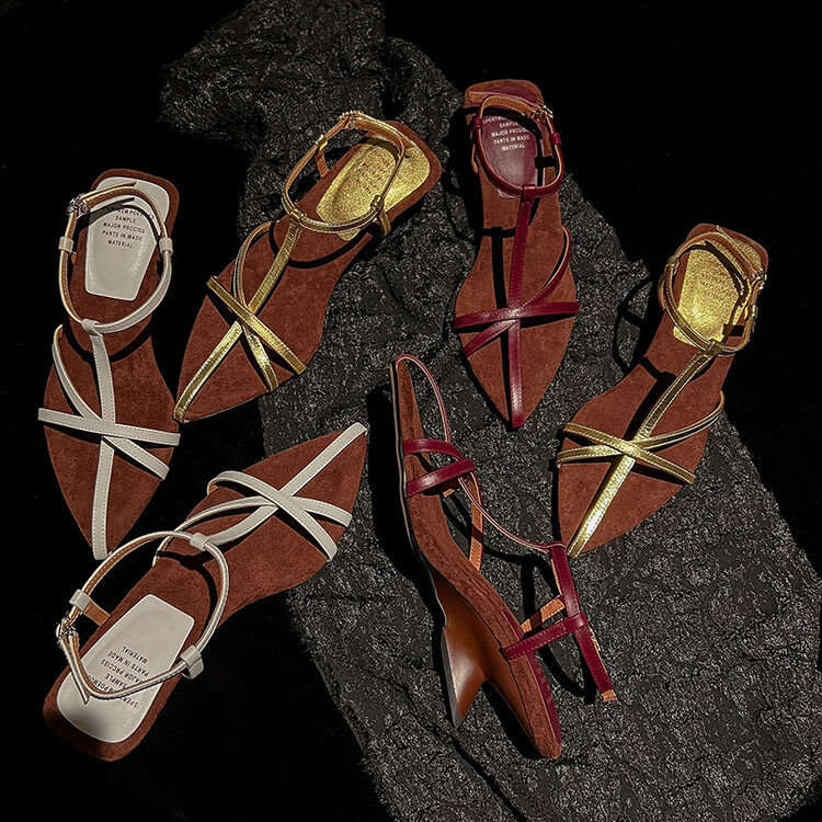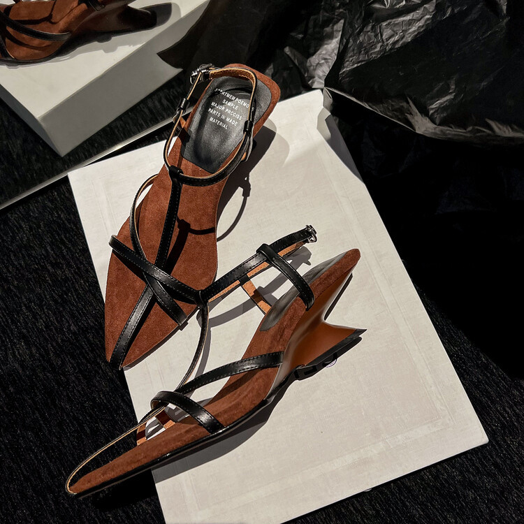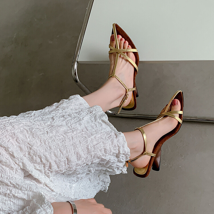 크로스 T 자형 하이힐 샌들 여성 신발 패션 신발 여름 새로운 Cowhide 스트랩 오픈 발가락 모양의 여성용 샌들스토어 가기