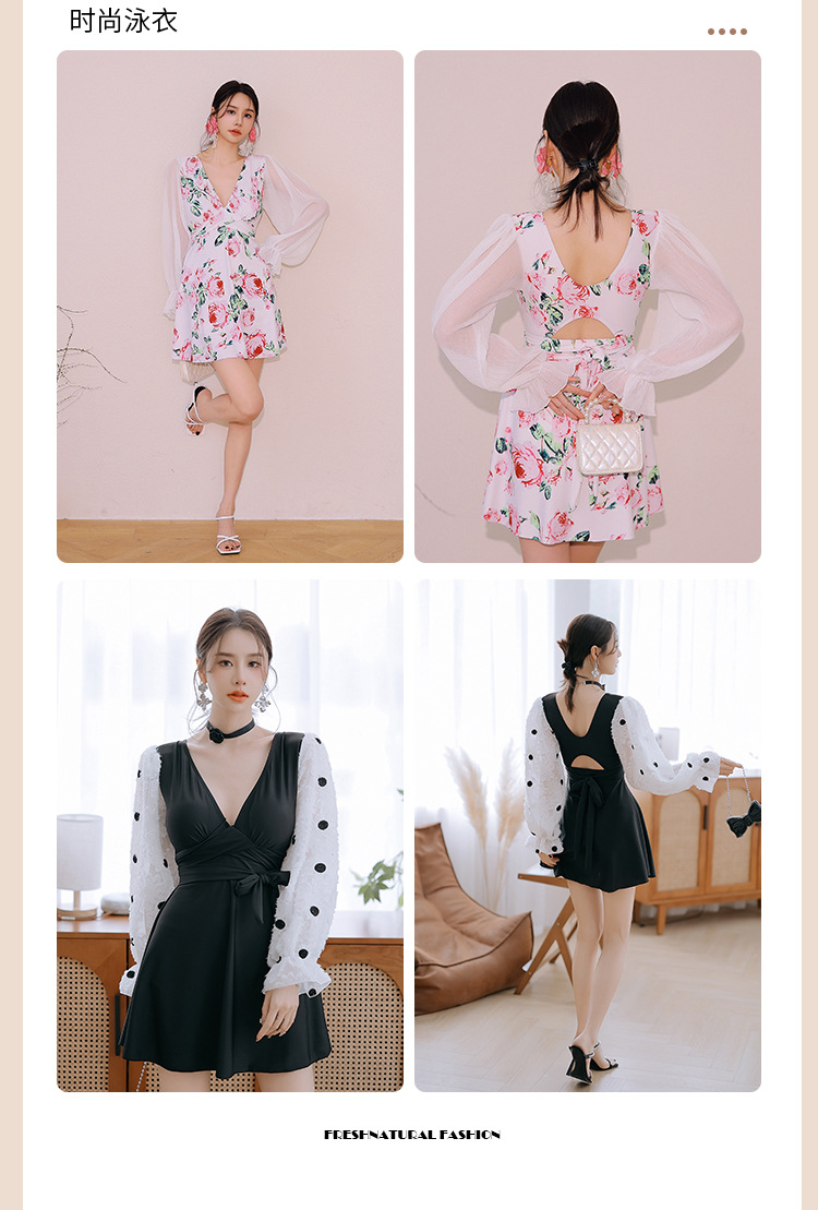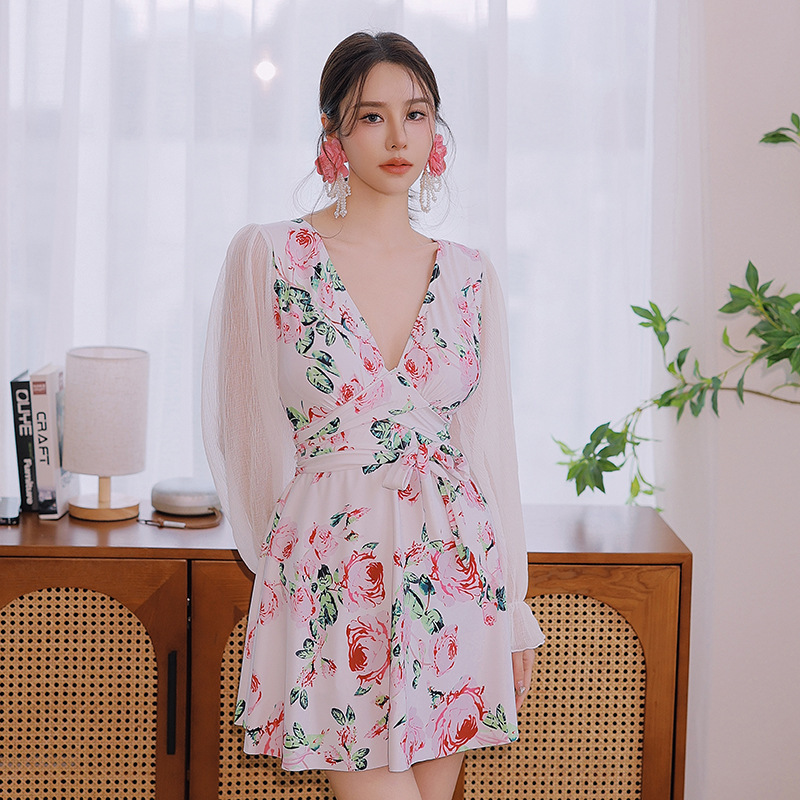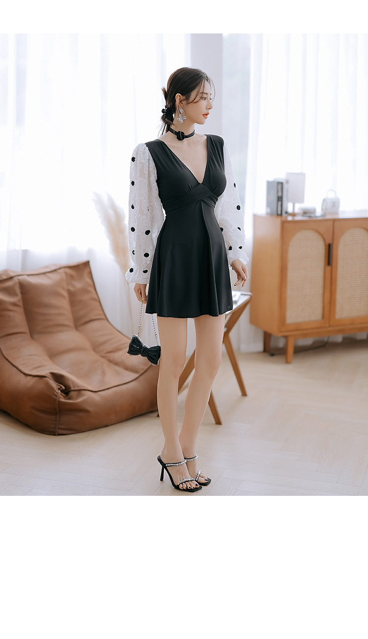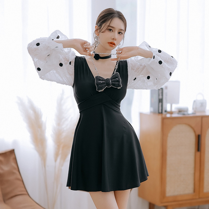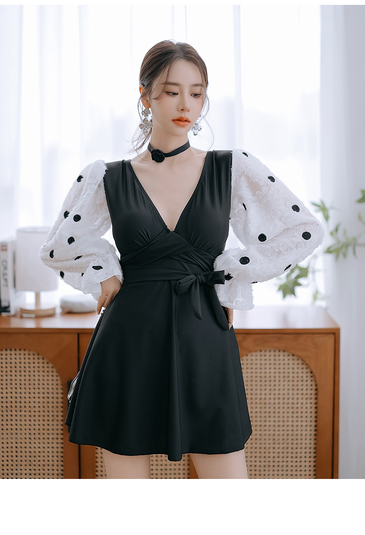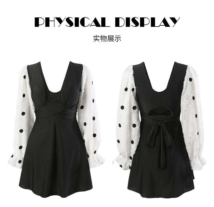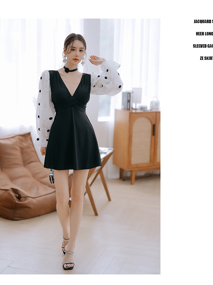 플러스 사이즈 수영복 여성 여름 검은 섹시한 V 넥 긴 소매 선 스크린 원피스 스커트 통통녀 배꼽이 달린 슬림 홀리데이 수영복.스토어 가기