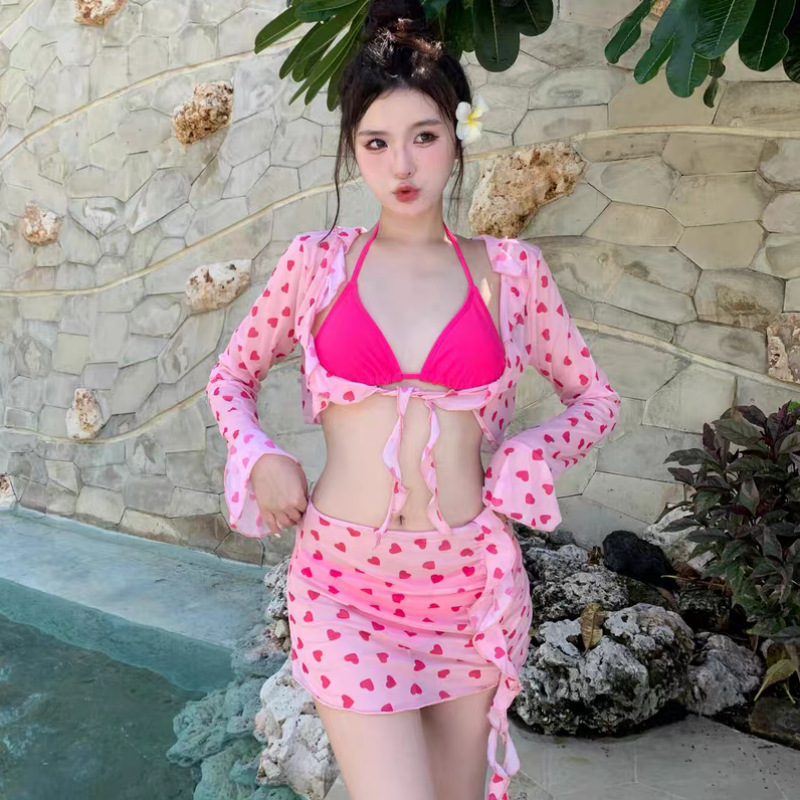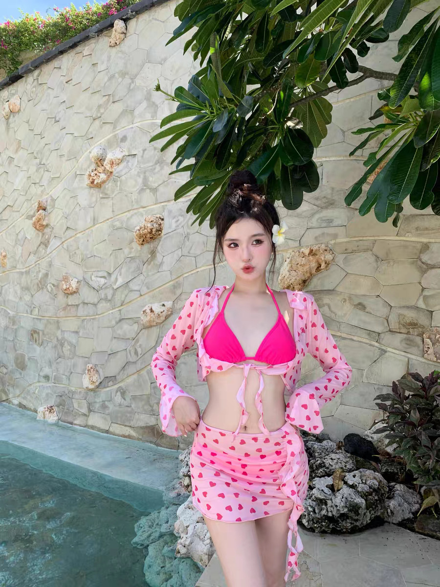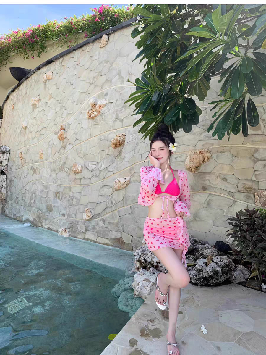 2024 새로운 여름 핑크 소녀 4 피스 비키니 수영복 여성 스플릿 스트랩 스커트 스파 휴가 수영복