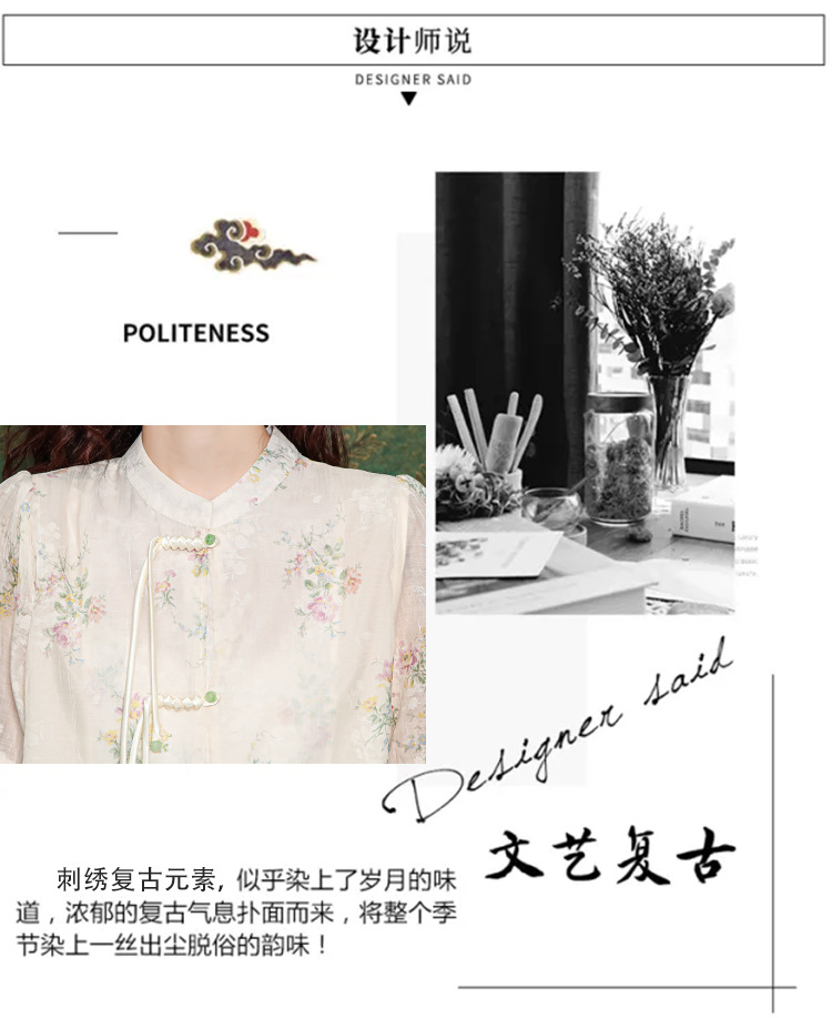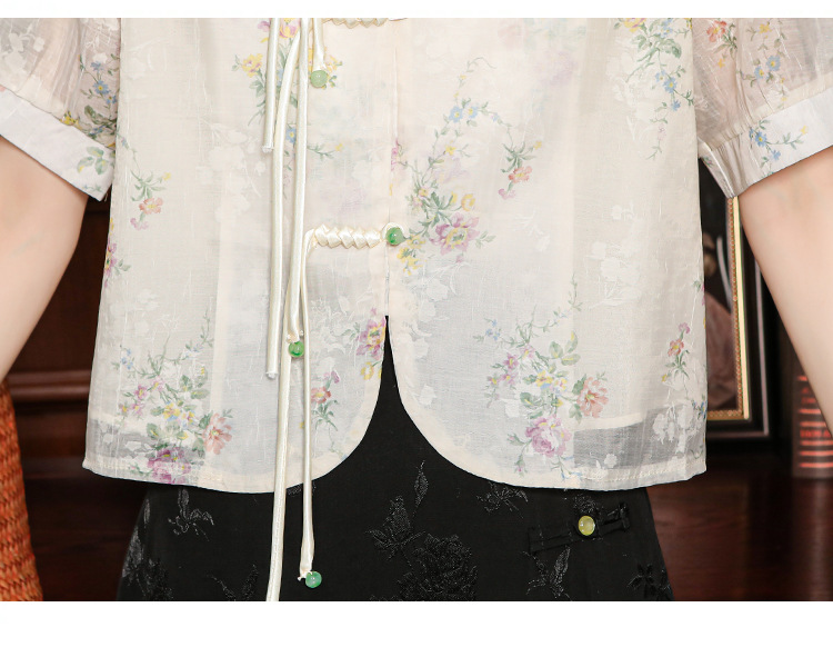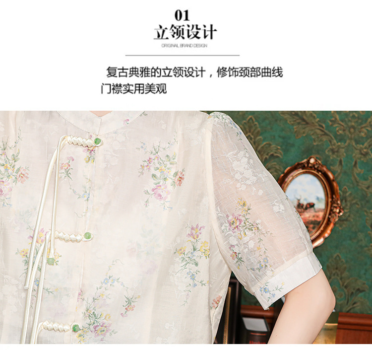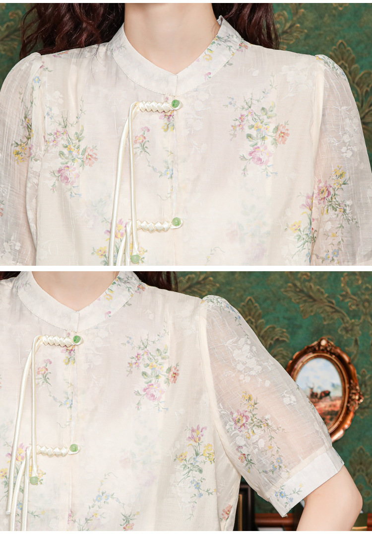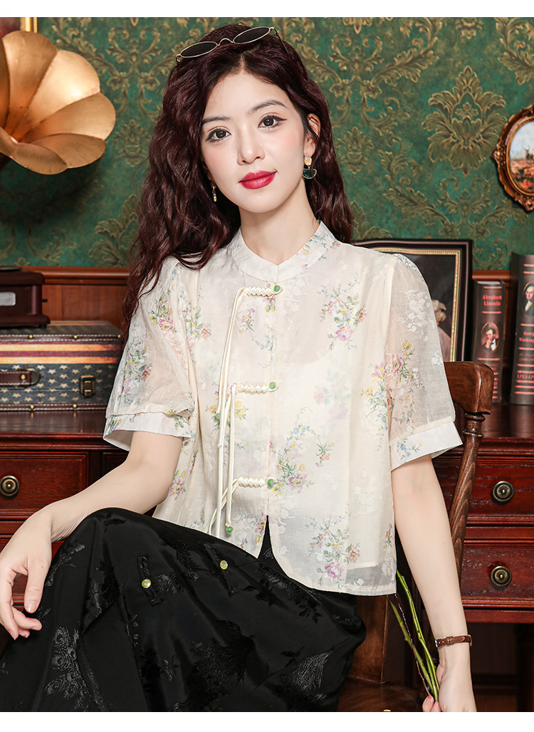새로운 중국 스타일 버클 꽃 셔츠 반팔 여성용 2024 여름 새로운 디자인 센스 롱 레트로 셔츠 탑