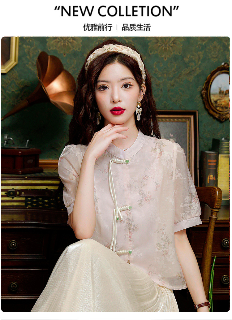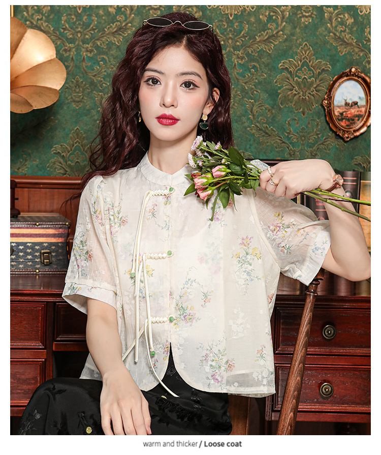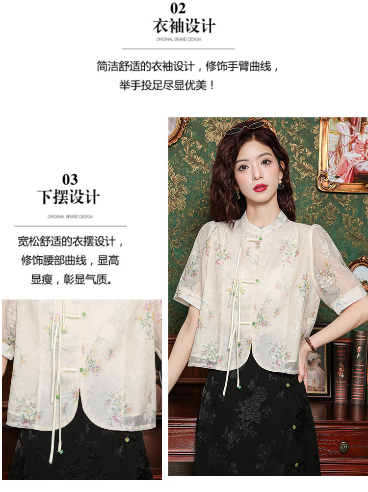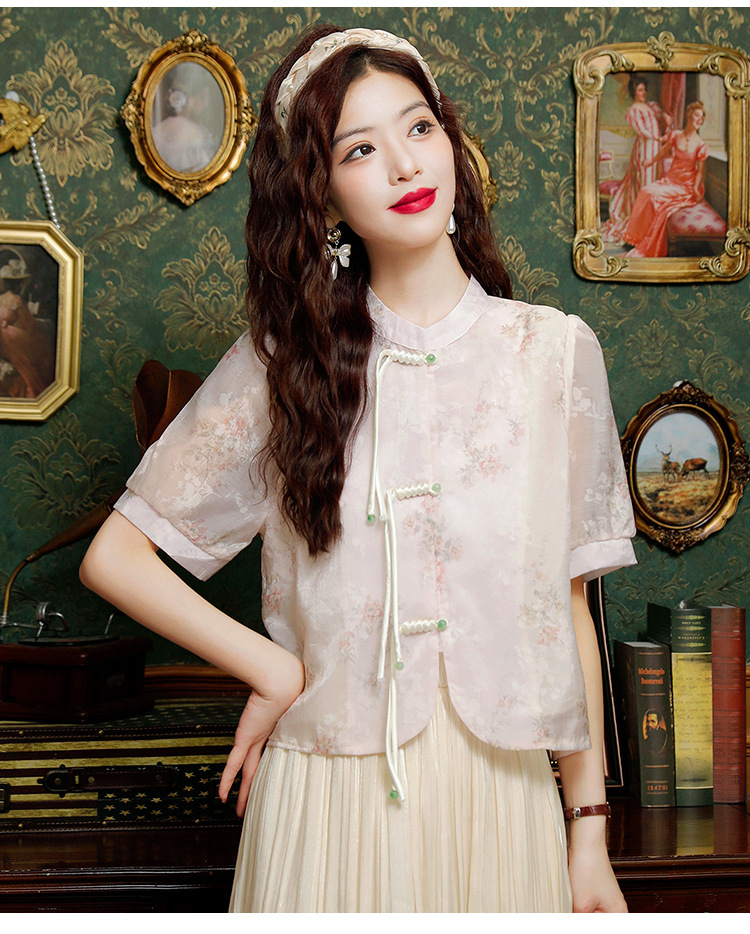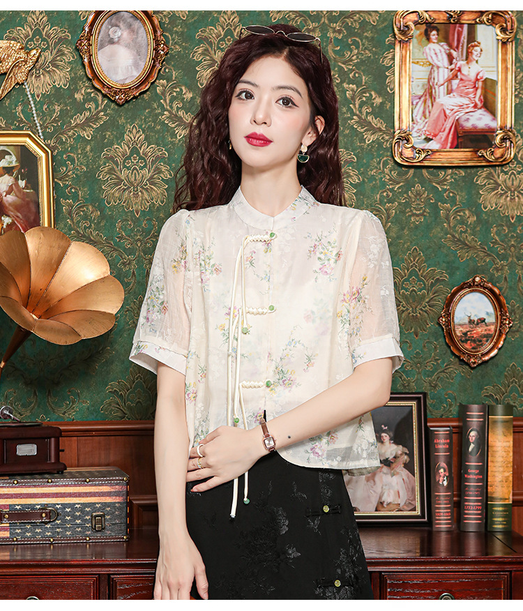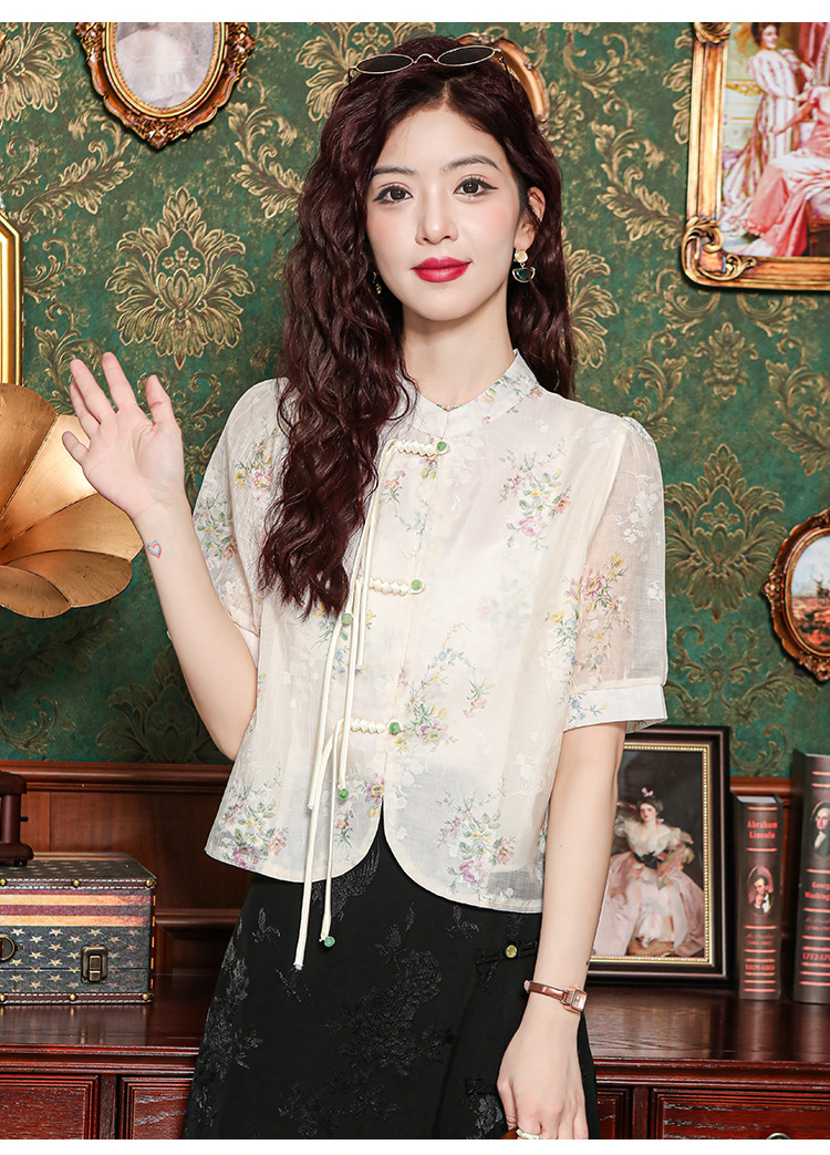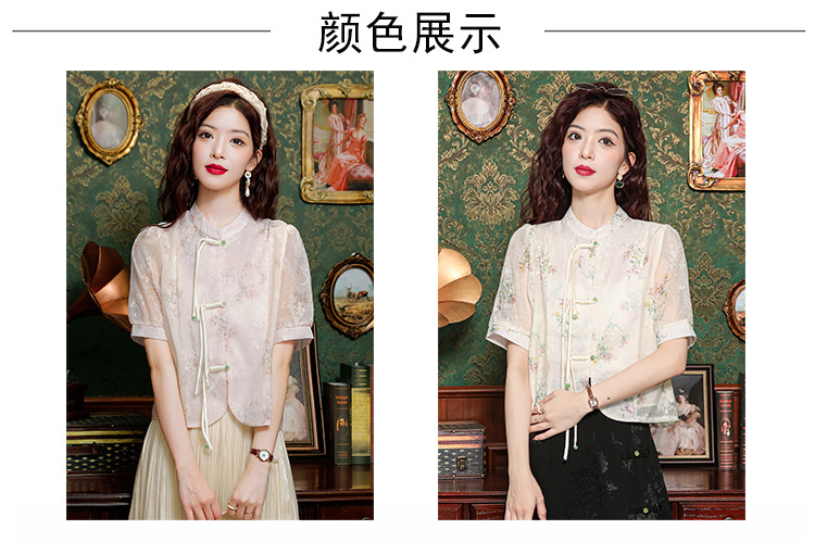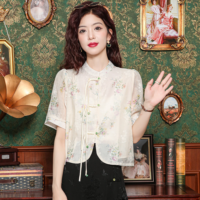 새로운 중국 스타일 버클 꽃 셔츠 반팔 여성용 2024 여름 새로운 디자인 센스 롱 레트로 셔츠 탑스토어 가기