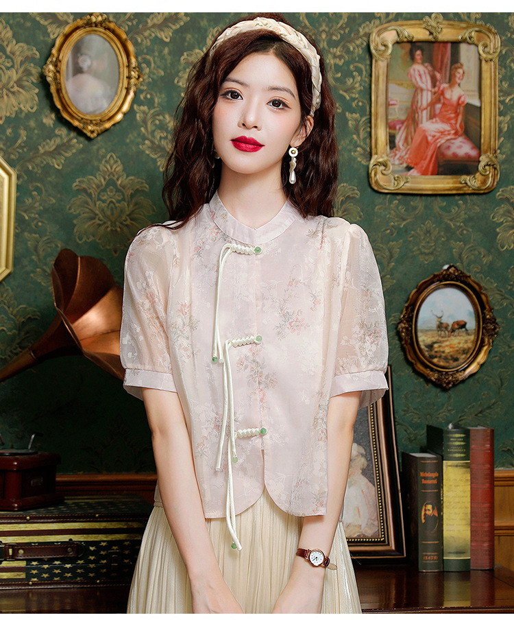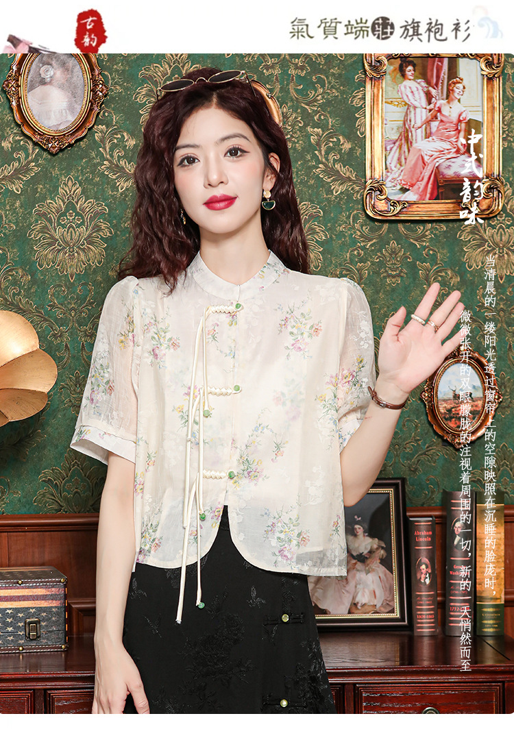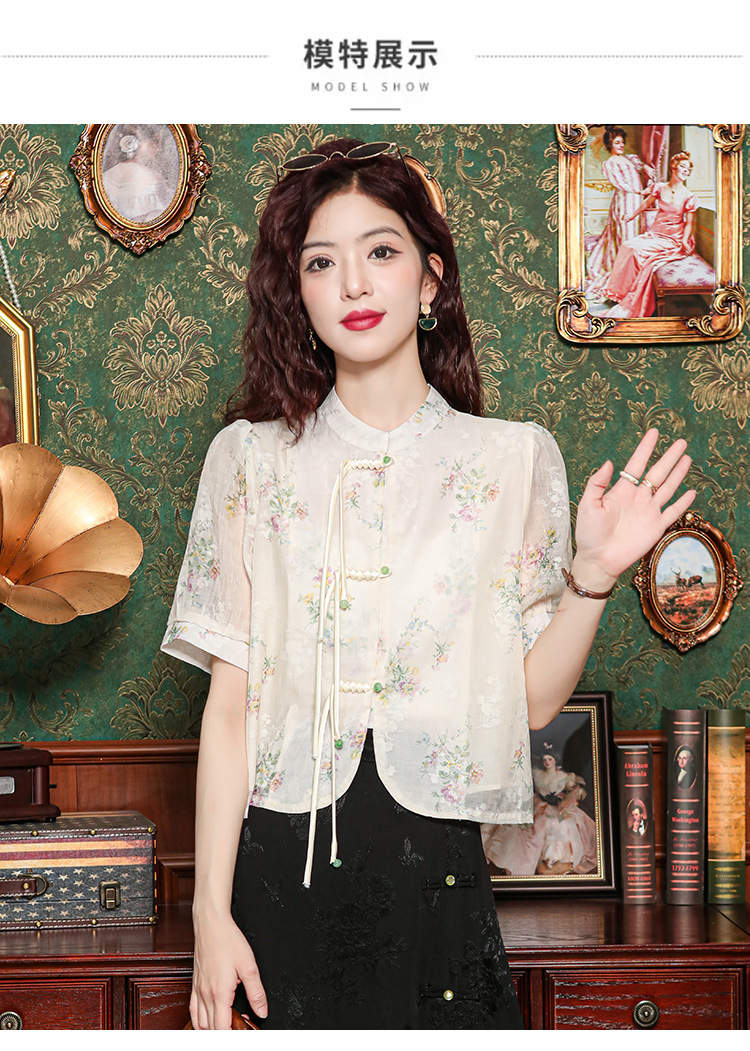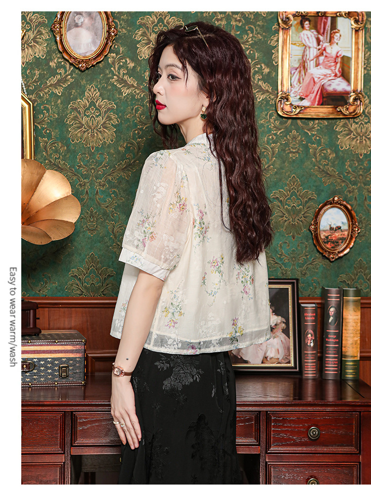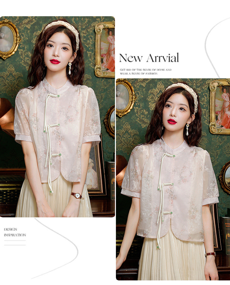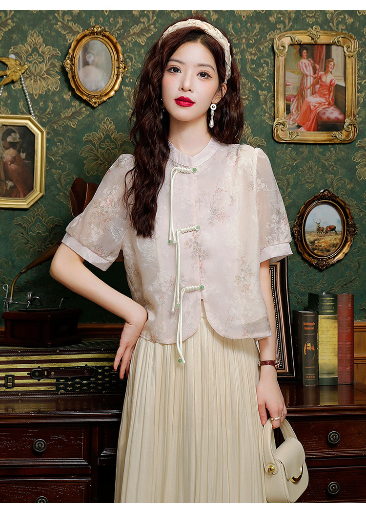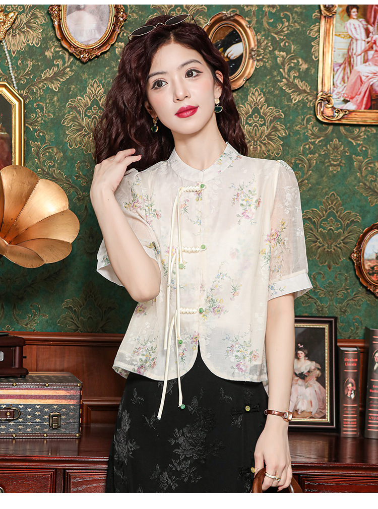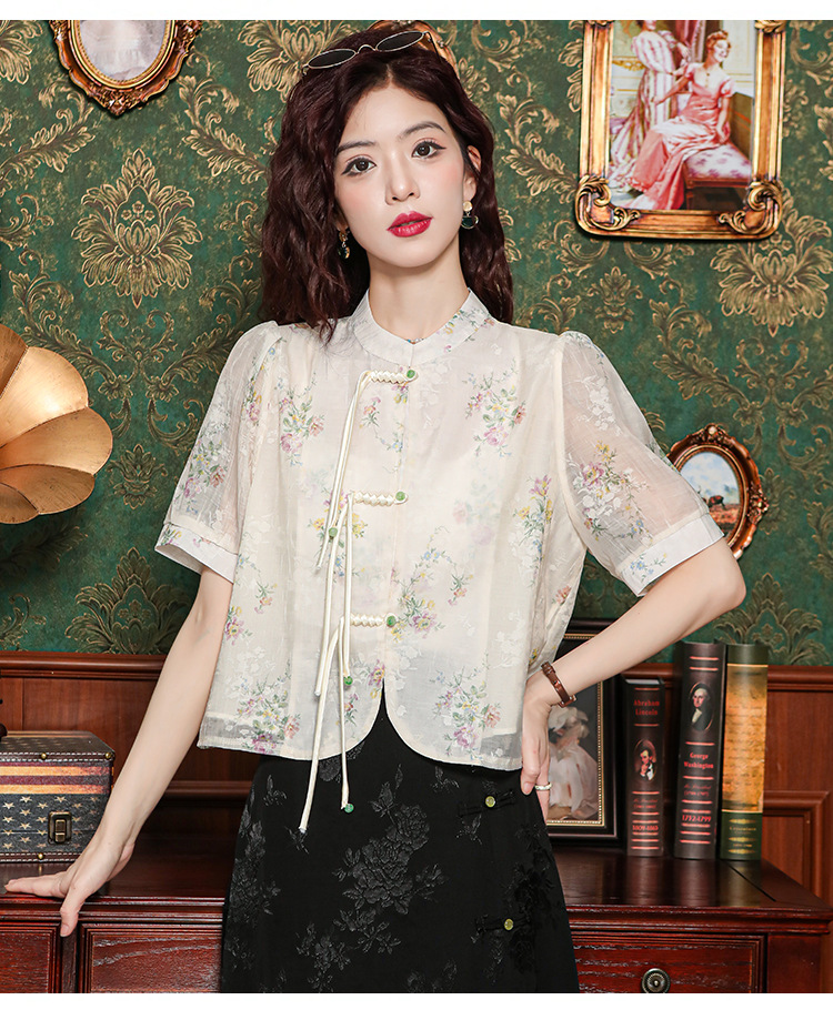 새로운 중국 스타일 버클 꽃 셔츠 반팔 여성용 2024 여름 새로운 디자인 센스 롱 레트로 셔츠 탑스토어 가기