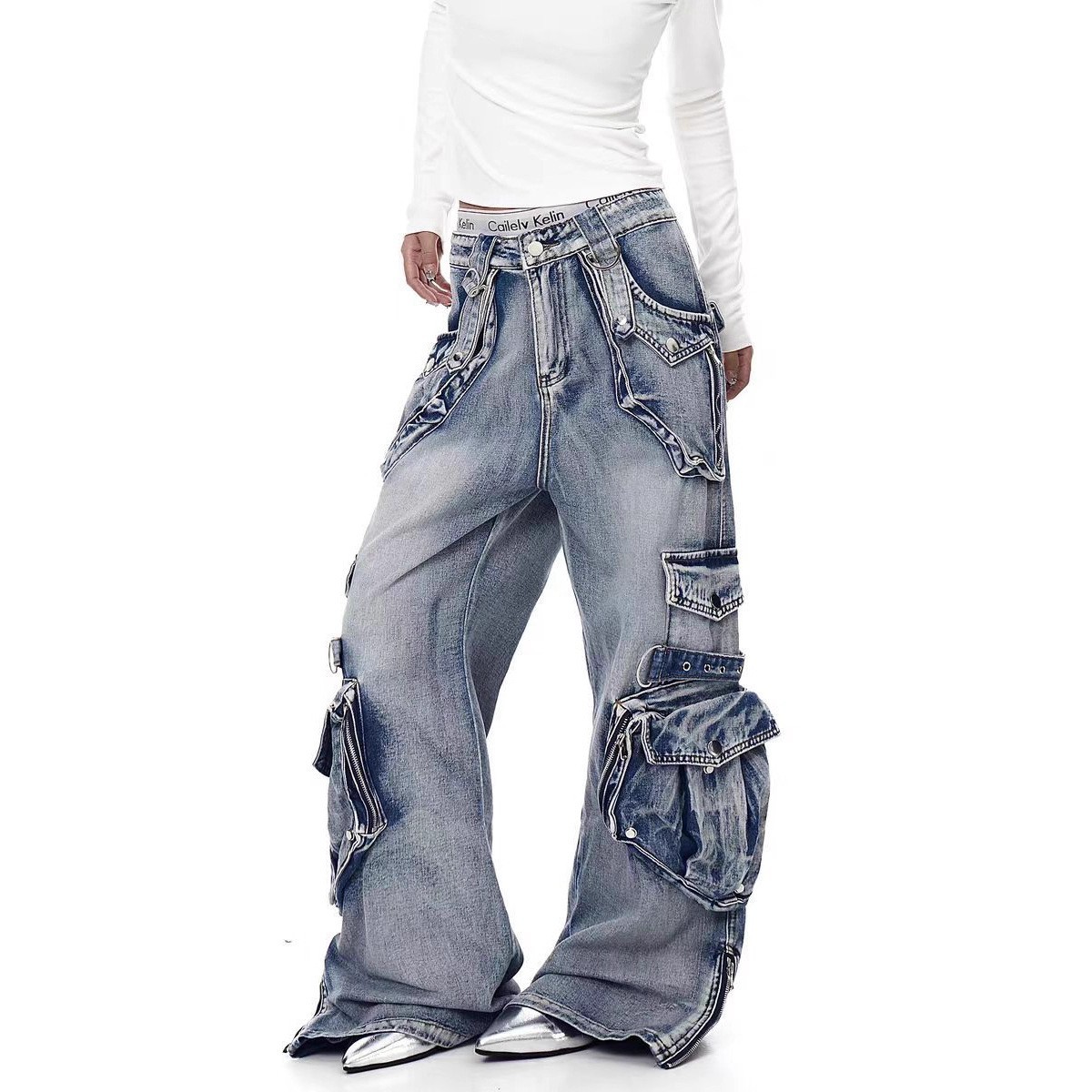 2026 멀티 포켓 디자인 하이 스트리트 아메리칸 스타일 워크웨어 데님 팬츠 여성용 와이드 레그 루즈핏 틈새 시장 워싱 데님 팬츠