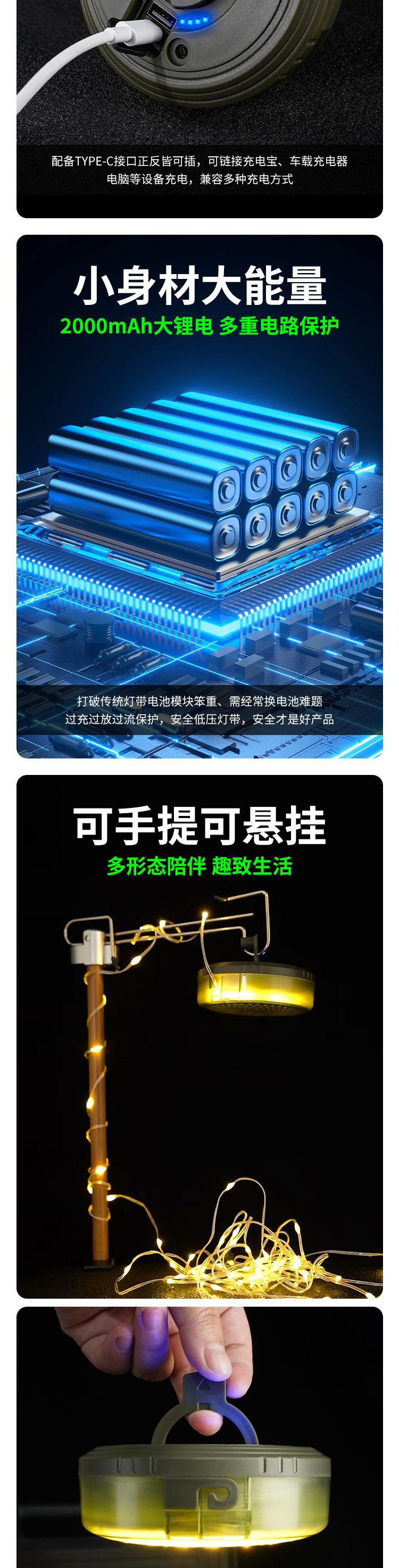 档位:前灯强光-前灯弱光-前灯sos-灯串彩光-灯串彩光呼吸模式-暖彩光交替闪-暖光呼吸模式