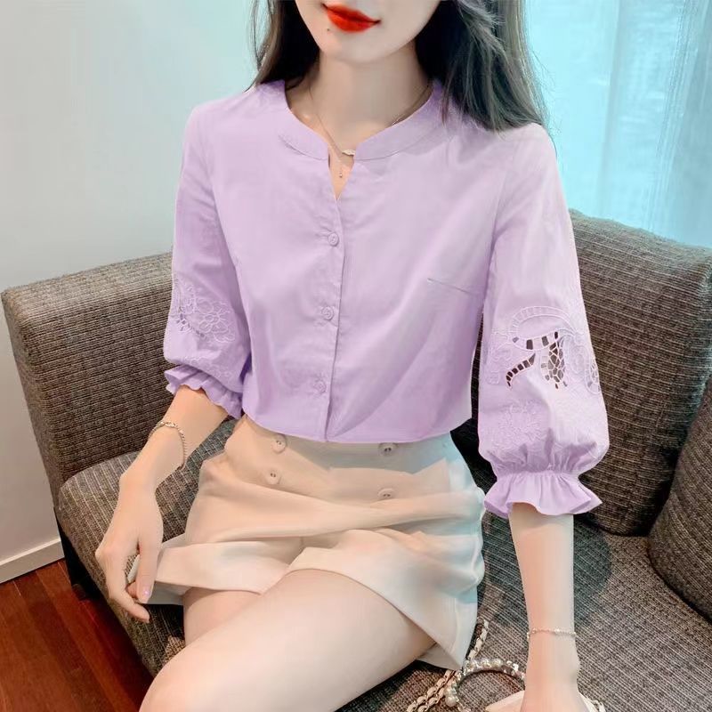 Simon Reiner 여름 새로운 반팔 쉬폰 셔츠 여성용 새 퍼프 슬리브 미드 슬리브 탑 세련된 세븐 포인트 슬리브