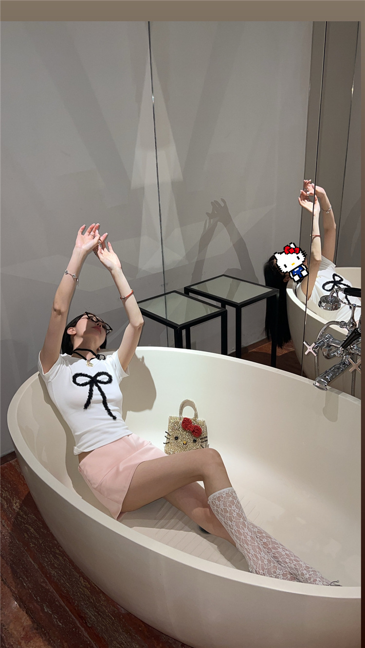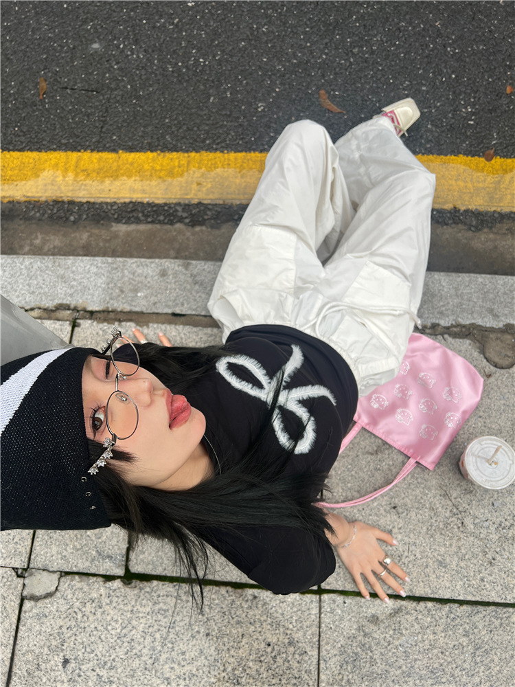 리본 프린트 라운드넥 반팔 티셔츠 여성 여름 디자인 감각 미국 스타일 슬림핏 블랙 탑스토어 가기