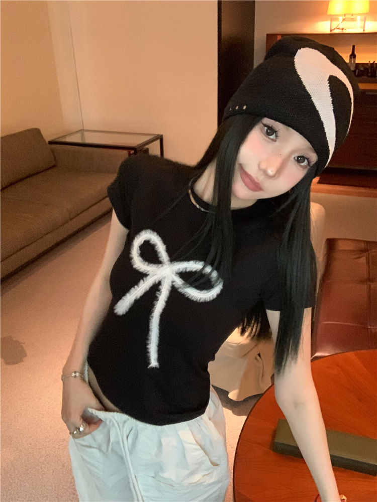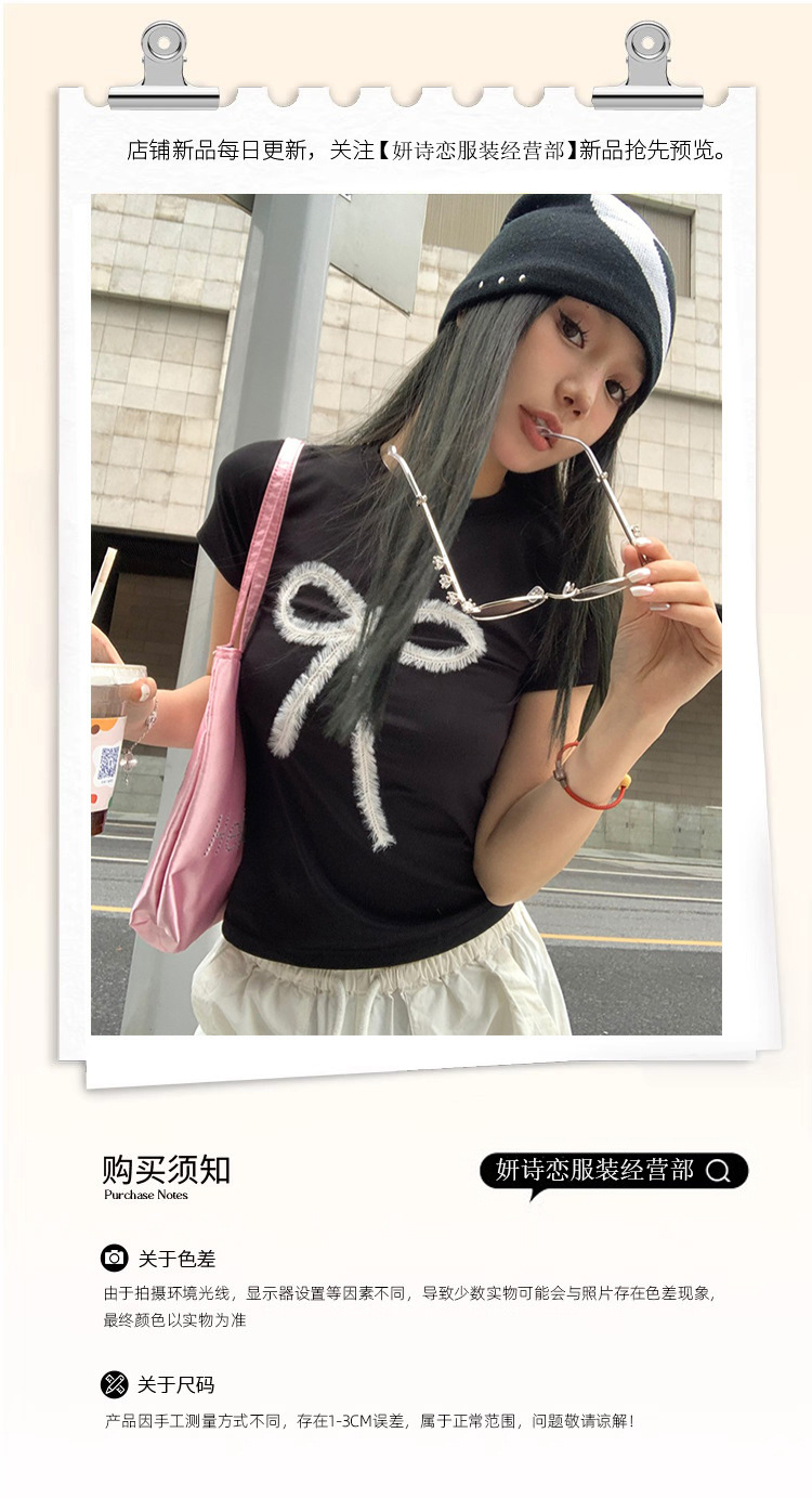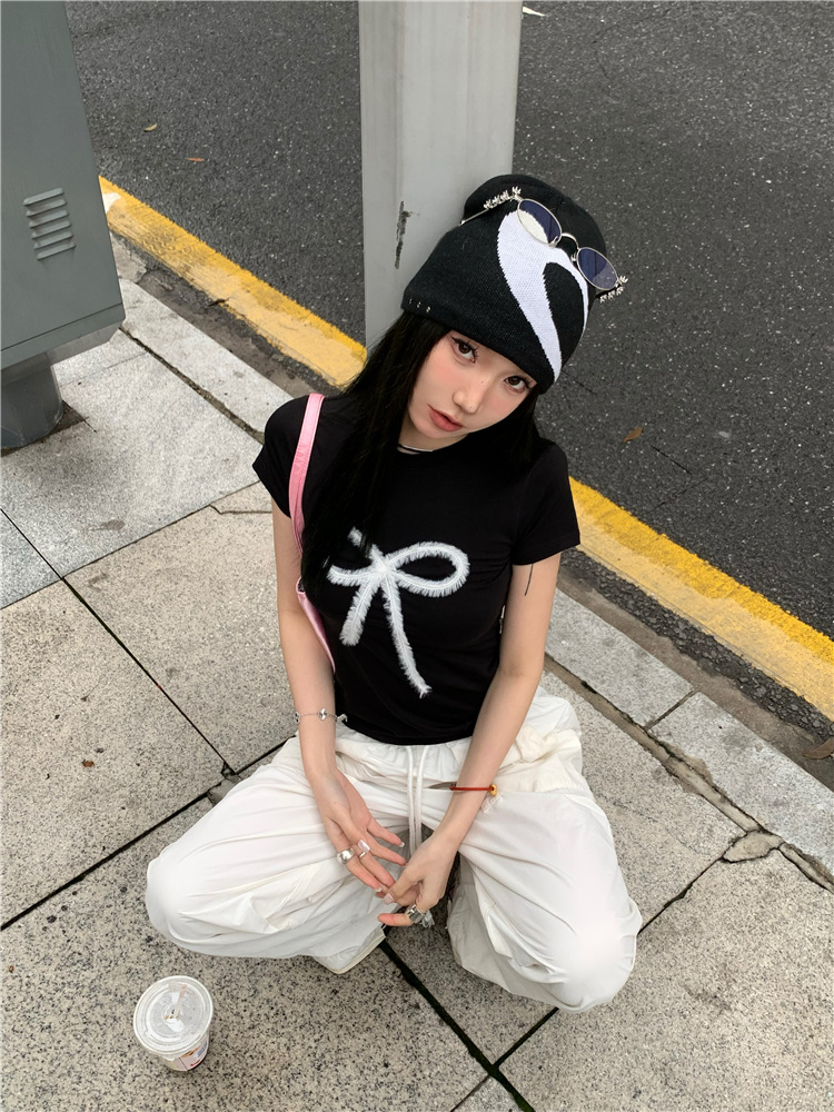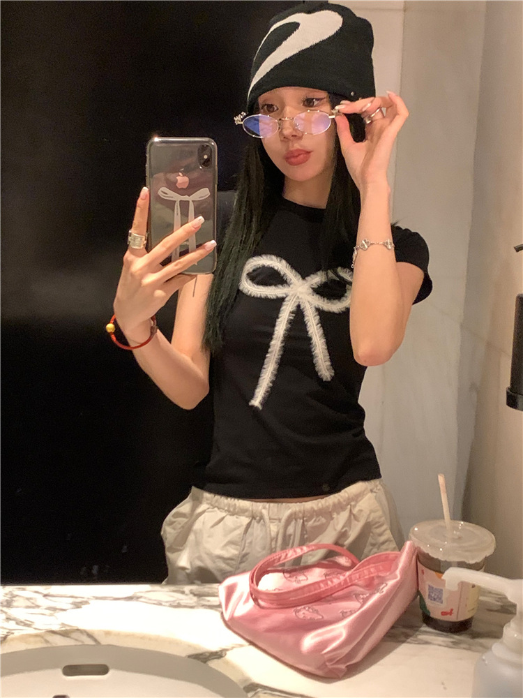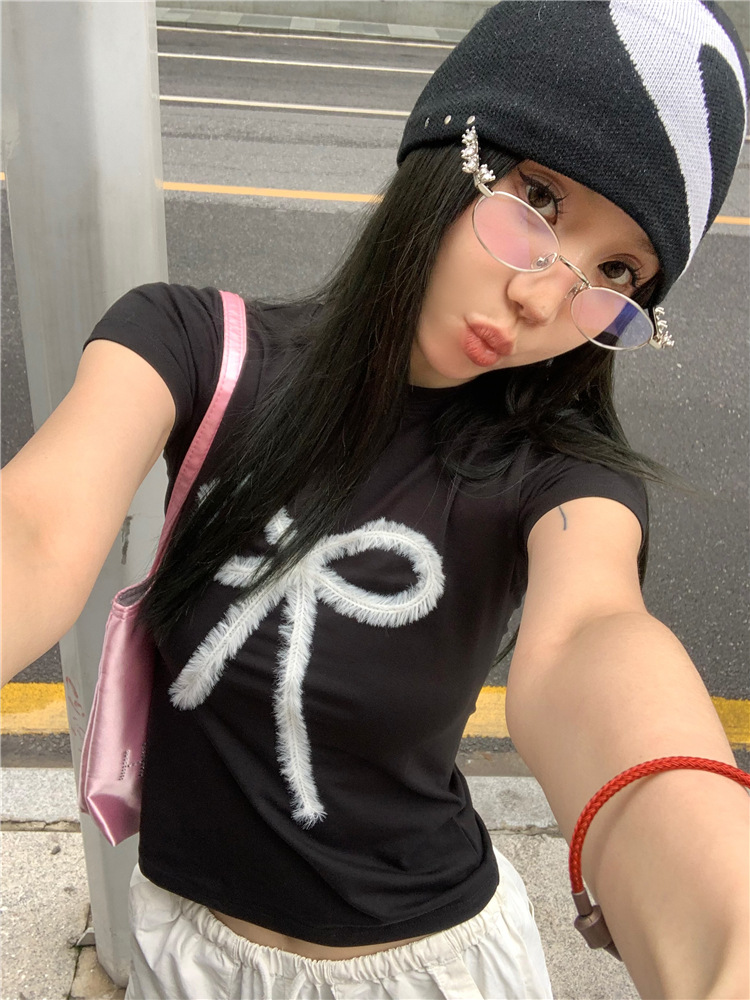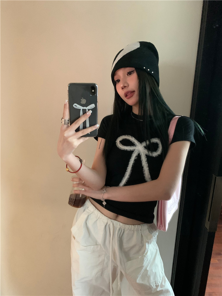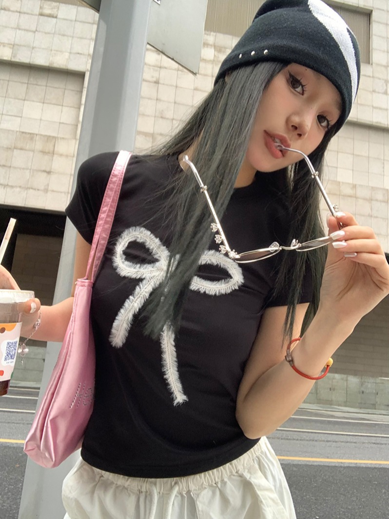 리본 프린트 라운드넥 반팔 티셔츠 여성 여름 디자인 감각 미국 스타일 슬림핏 블랙 탑