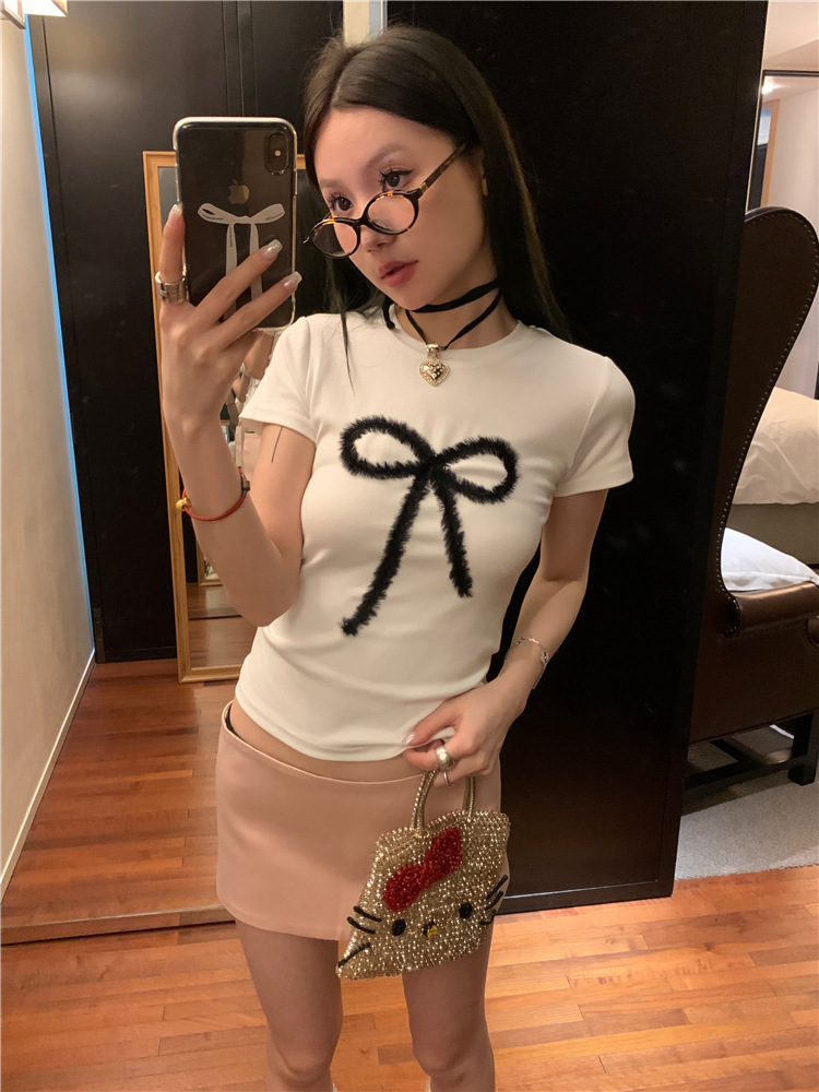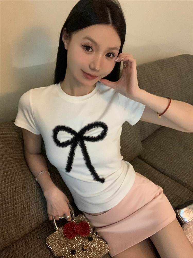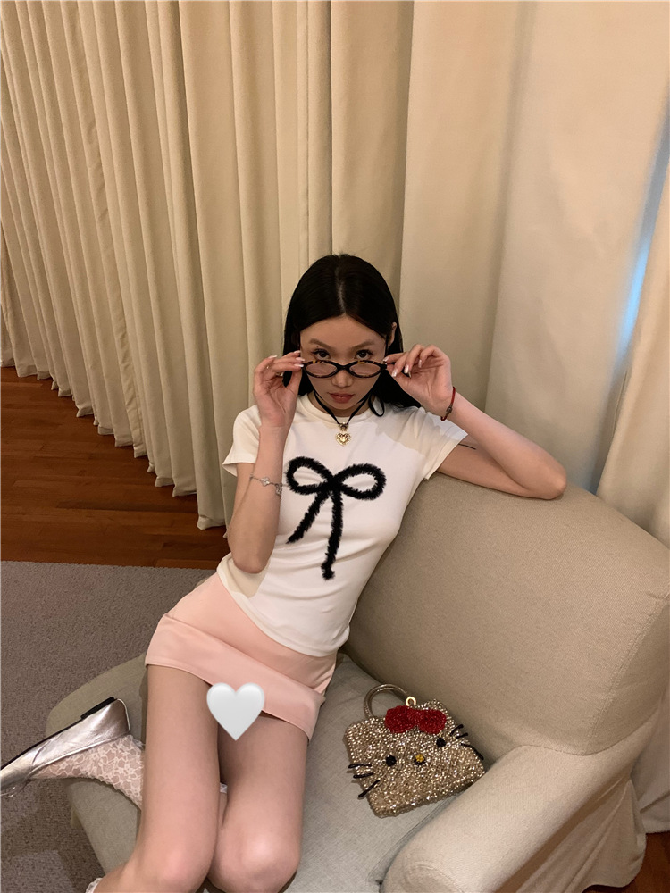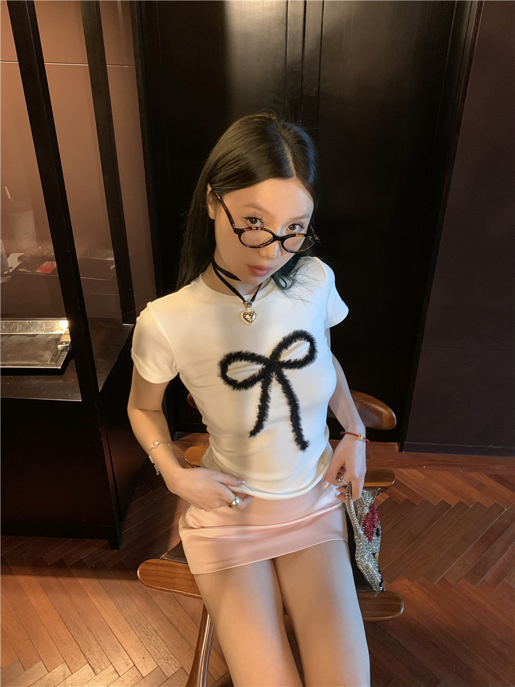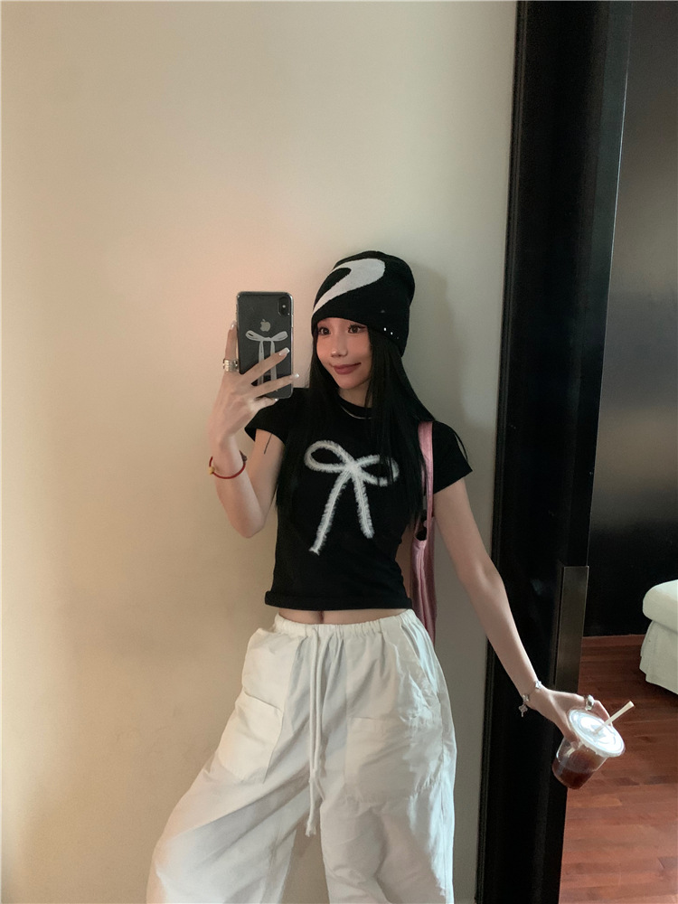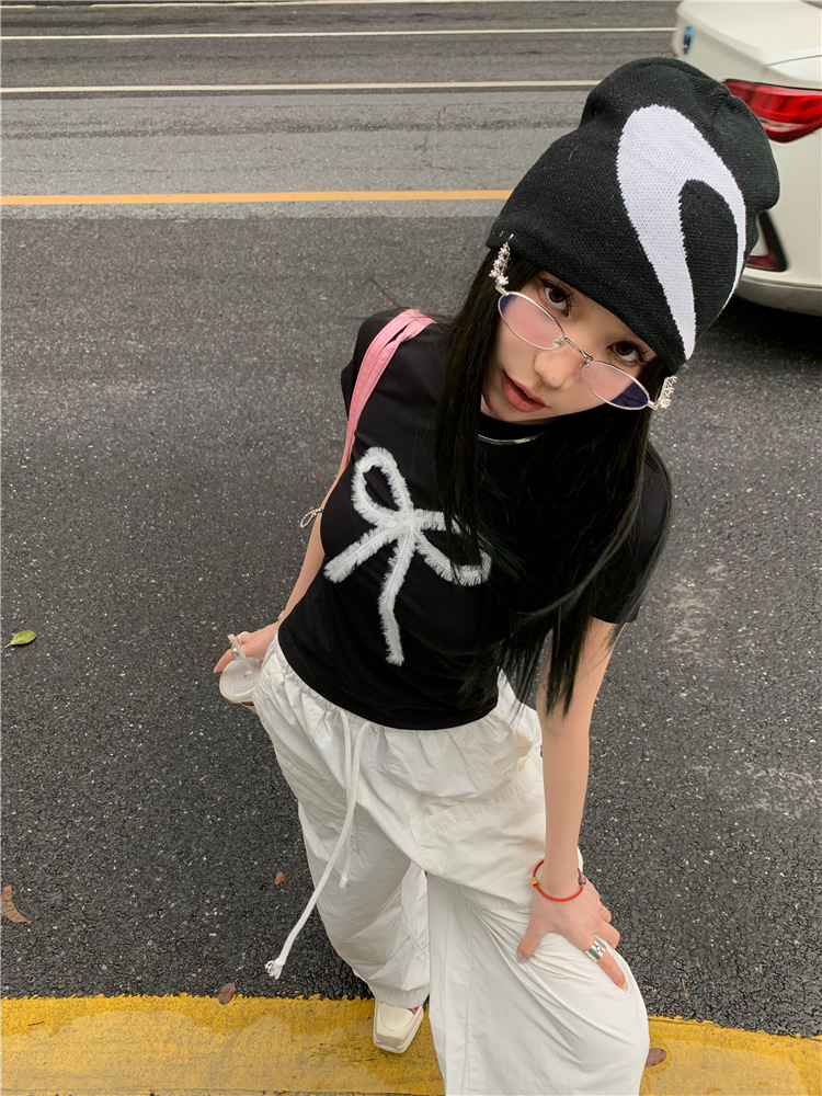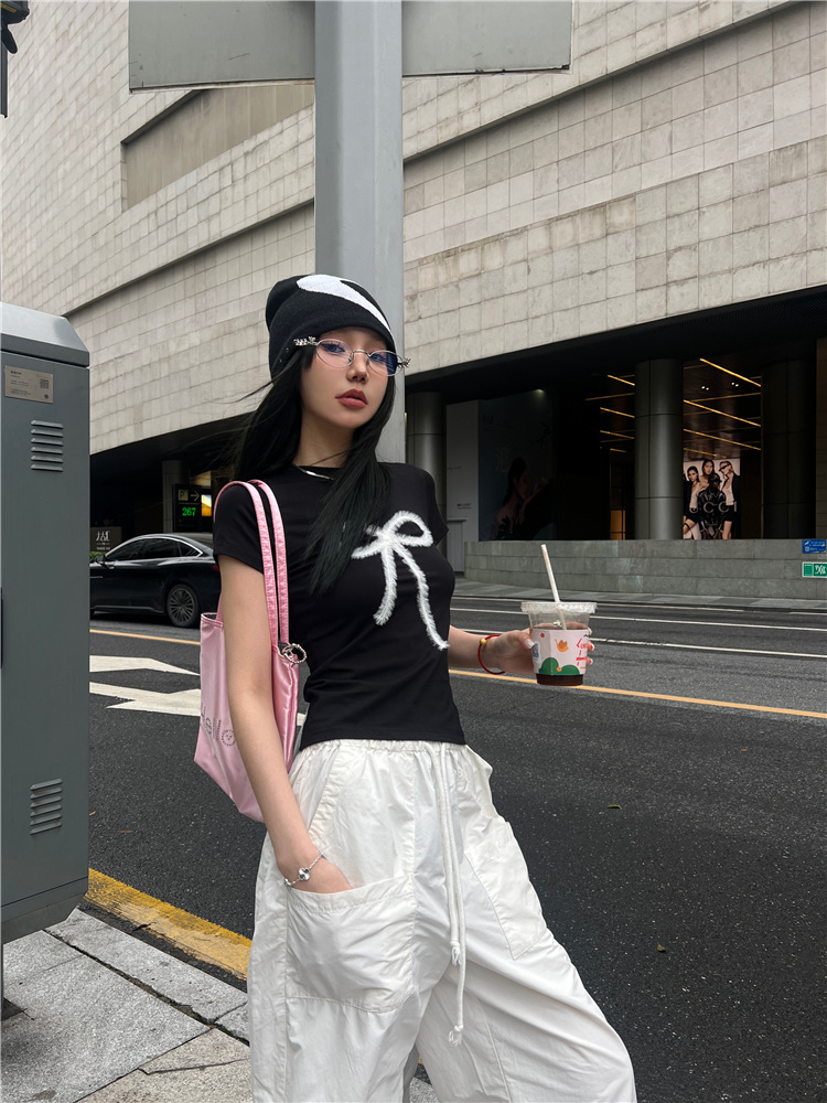 리본 프린트 라운드넥 반팔 티셔츠 여성 여름 디자인 감각 미국 스타일 슬림핏 블랙 탑