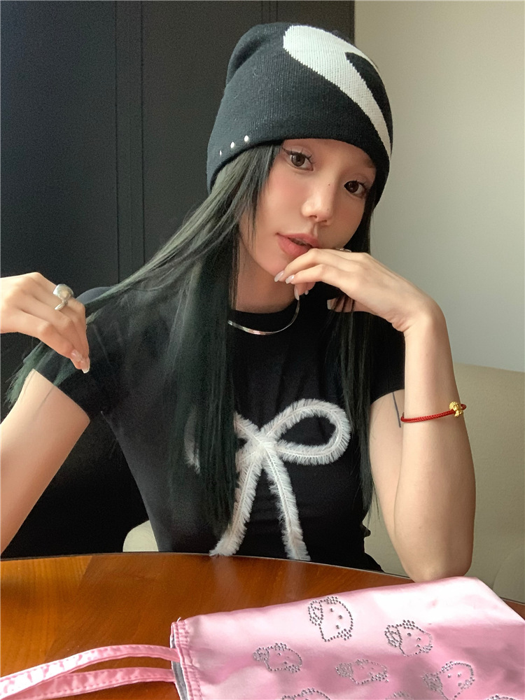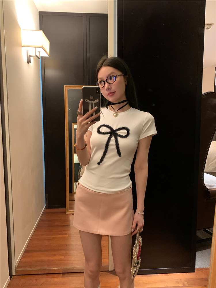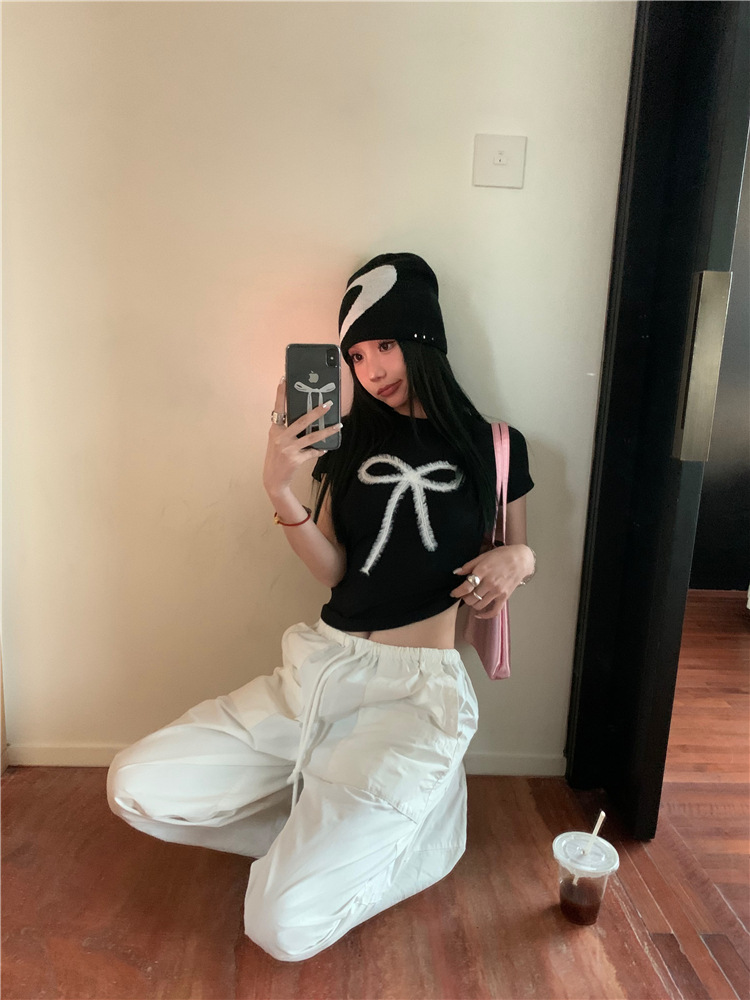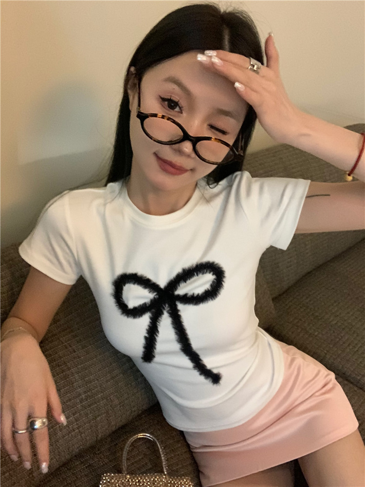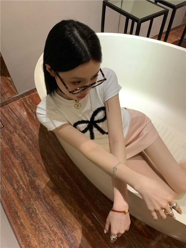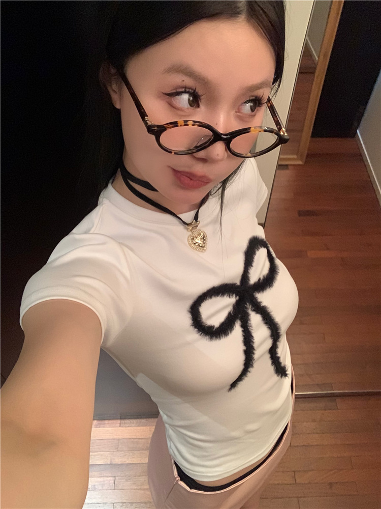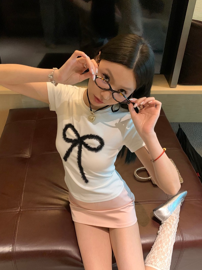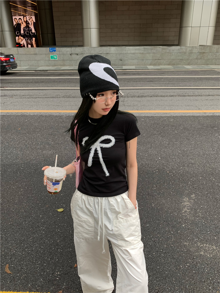 리본 프린트 라운드넥 반팔 티셔츠 여성 여름 디자인 감각 미국 스타일 슬림핏 블랙 탑