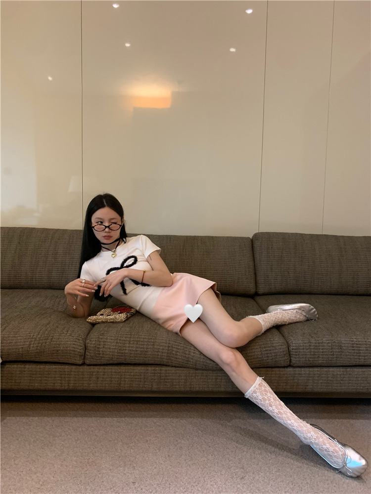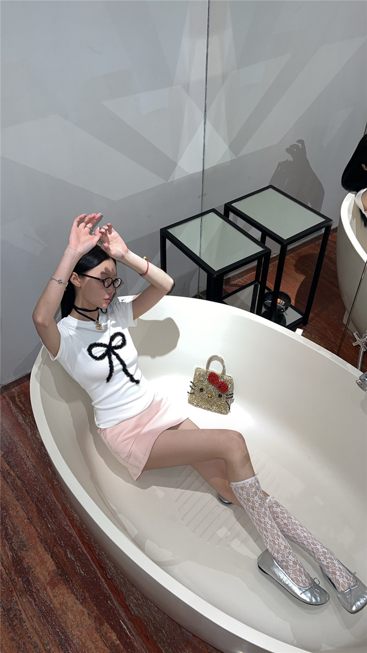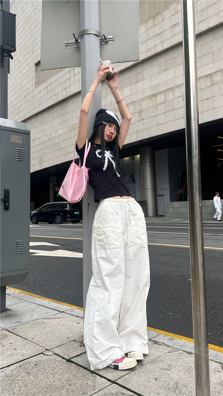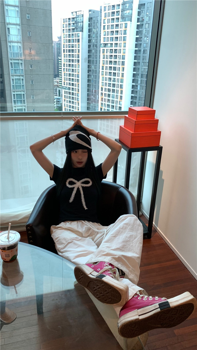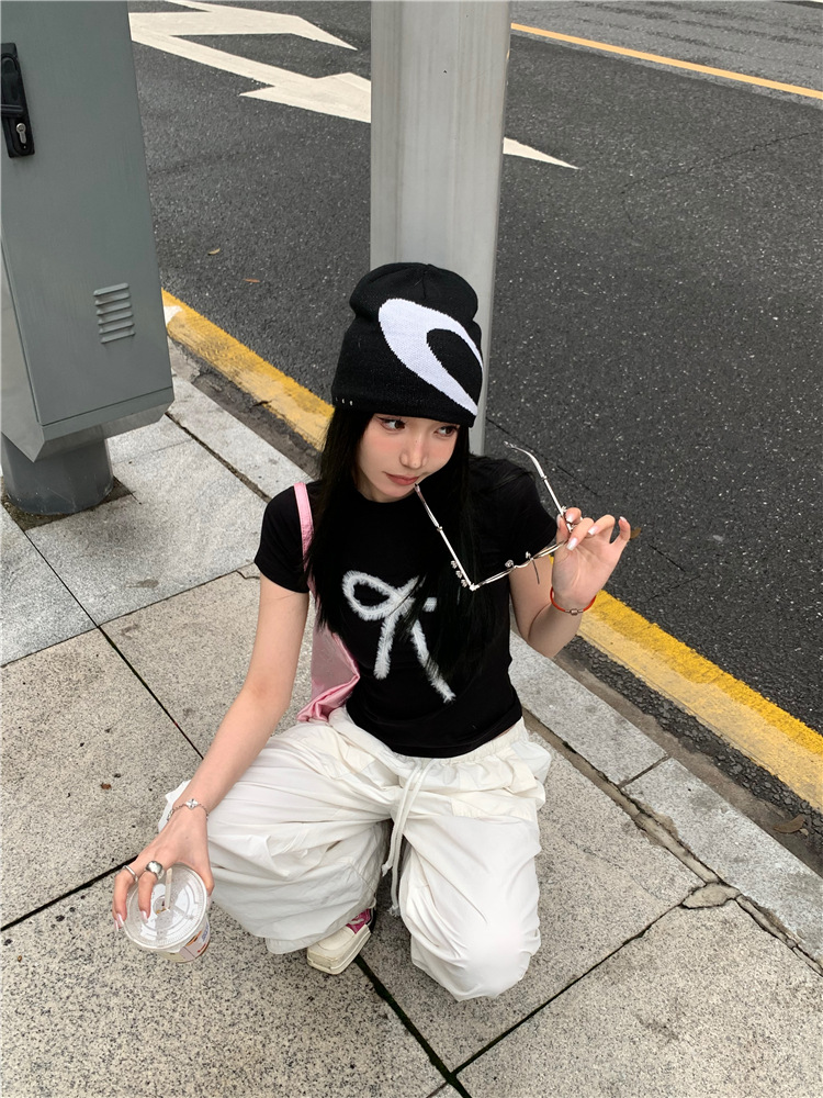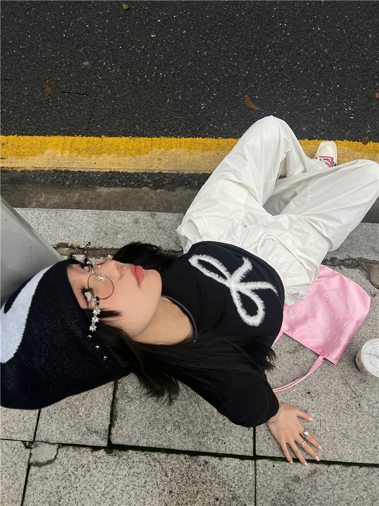 리본 프린트 라운드넥 반팔 티셔츠 여성 여름 디자인 감각 미국 스타일 슬림핏 블랙 탑